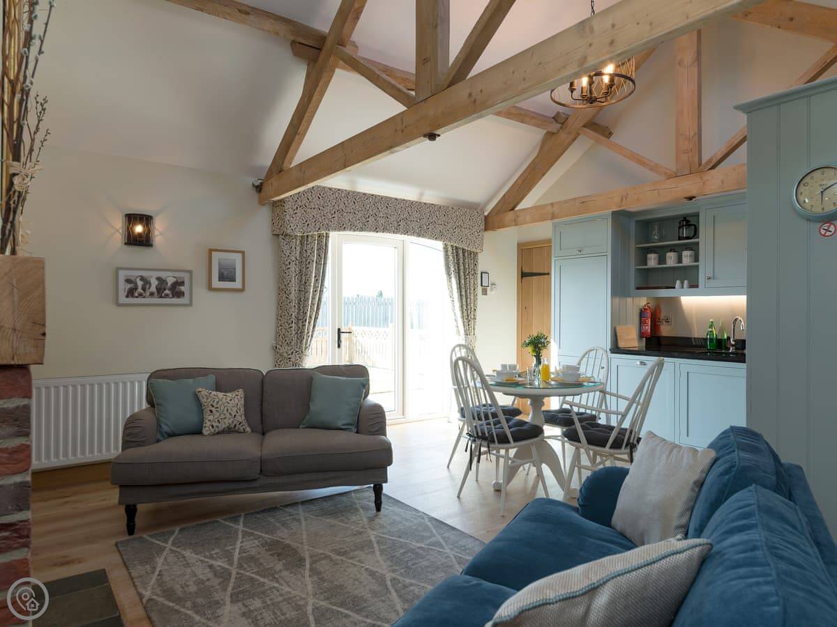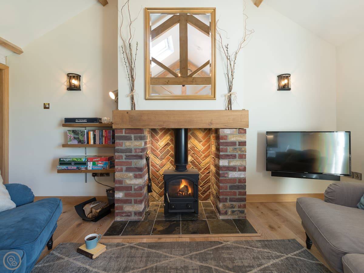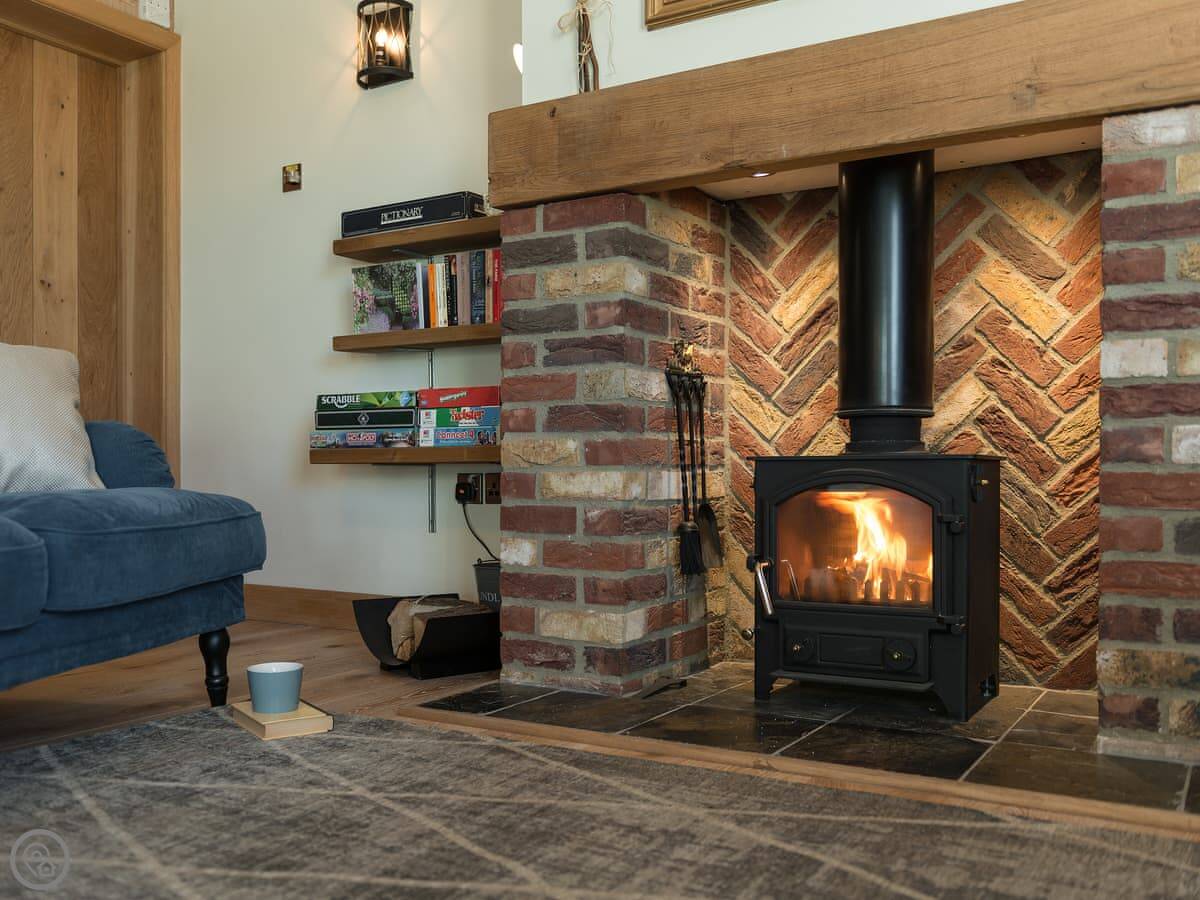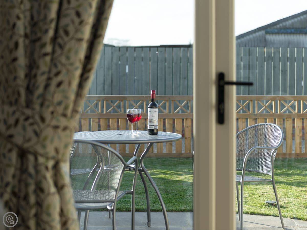 Inside it's warm. There's a wood burner if you want a fire. We leave you some logs. It has a proper kitchen with a dishwasher and a washing machine. Outside there's an enclosed garden with a patio. You can sit out there without worrying about the dog, but we don't allow pets. Sorry.