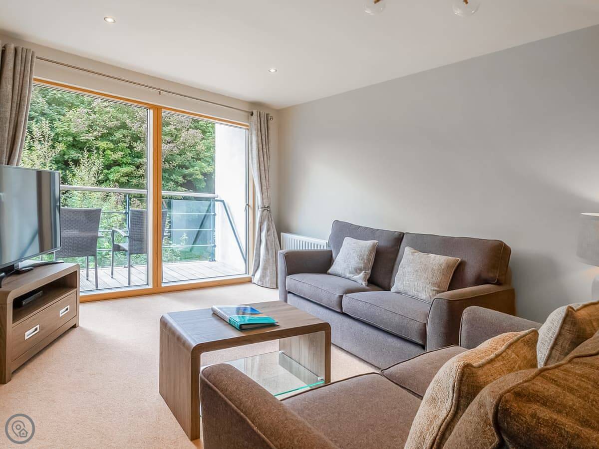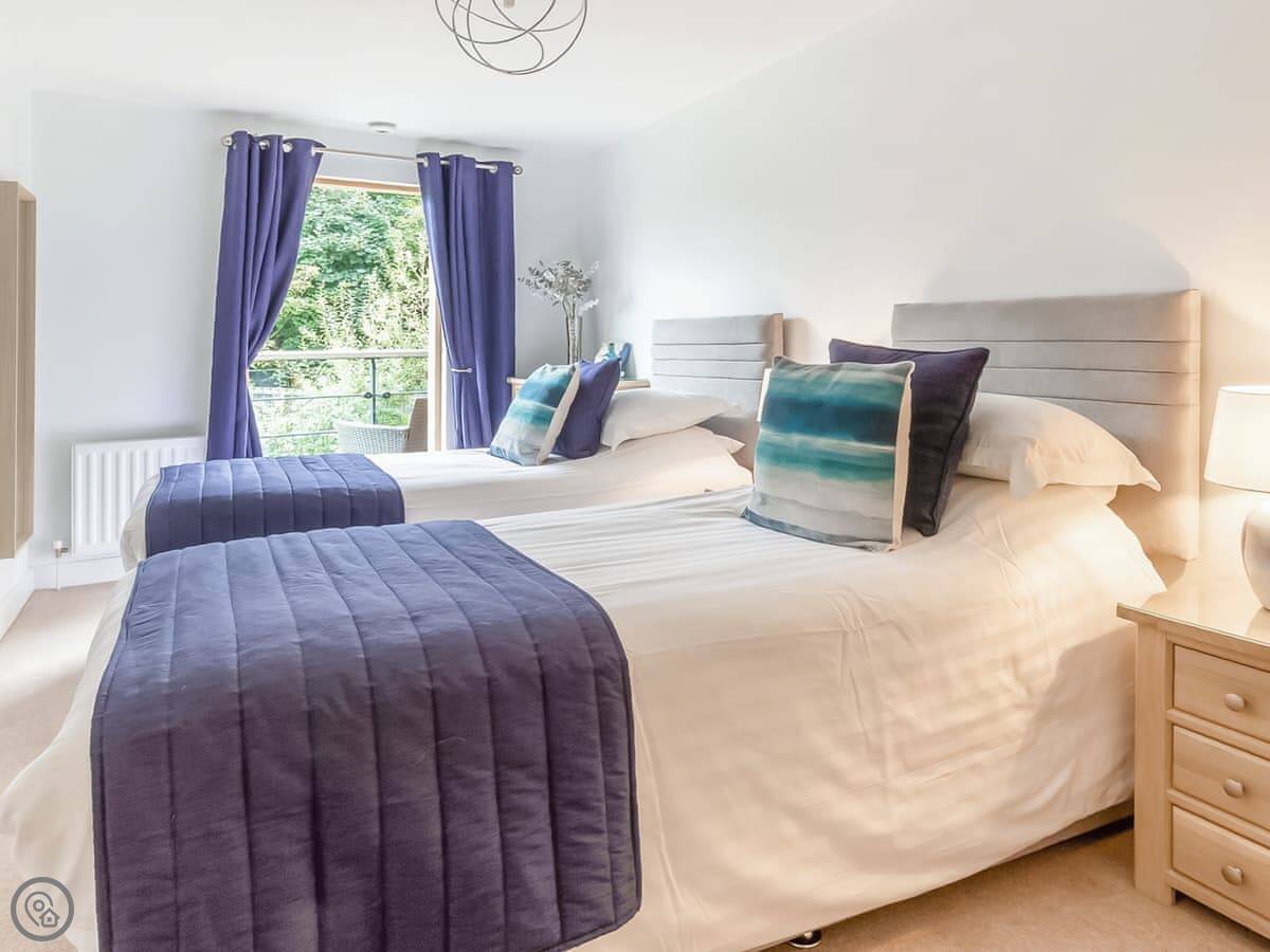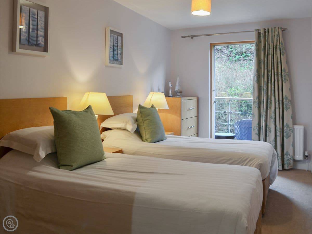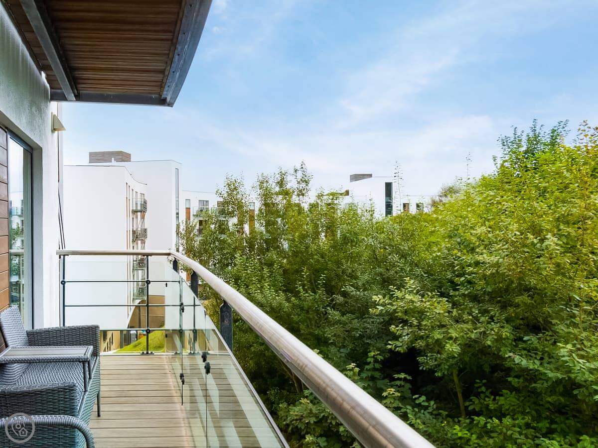 It's a two-bedroom place, sleeps four. Two bathrooms, which is handy. It's got a private balcony you can sit out on. The flat is large and open plan inside.
