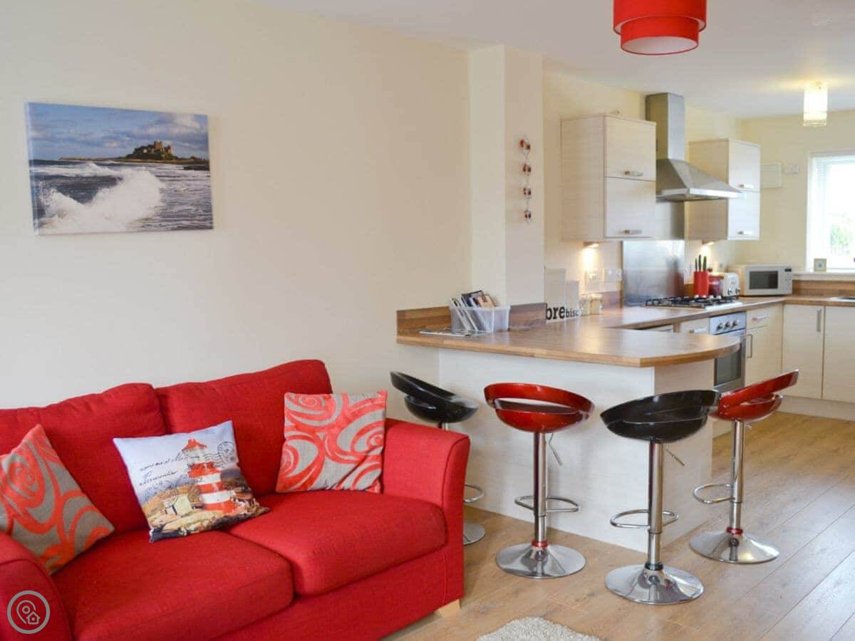 Sea Breeze is our place in Beadnell. It's on a quiet cul-de-sac, rows of similar cottages. The beach is about three minutes walk away. A proper sandy beach, huge. You can see the Farne Islands from it on a clear day.