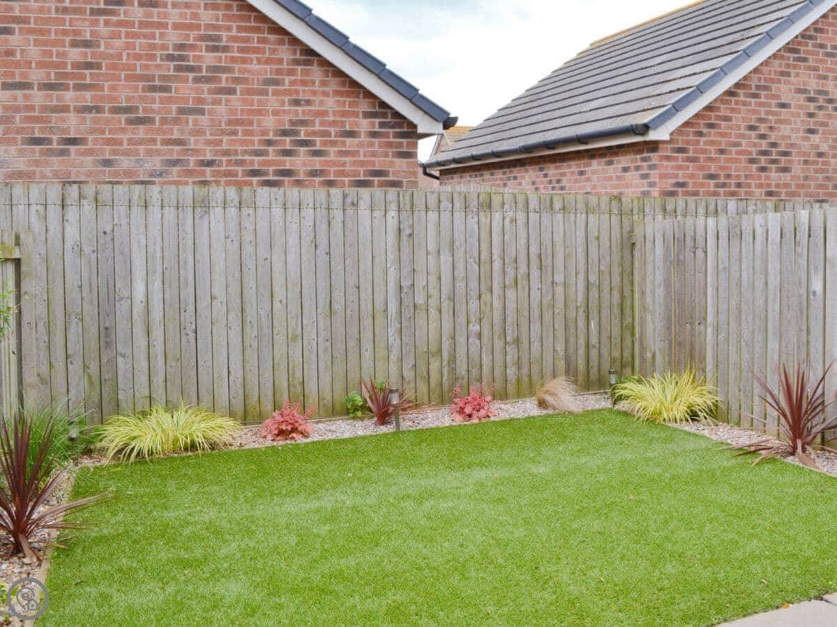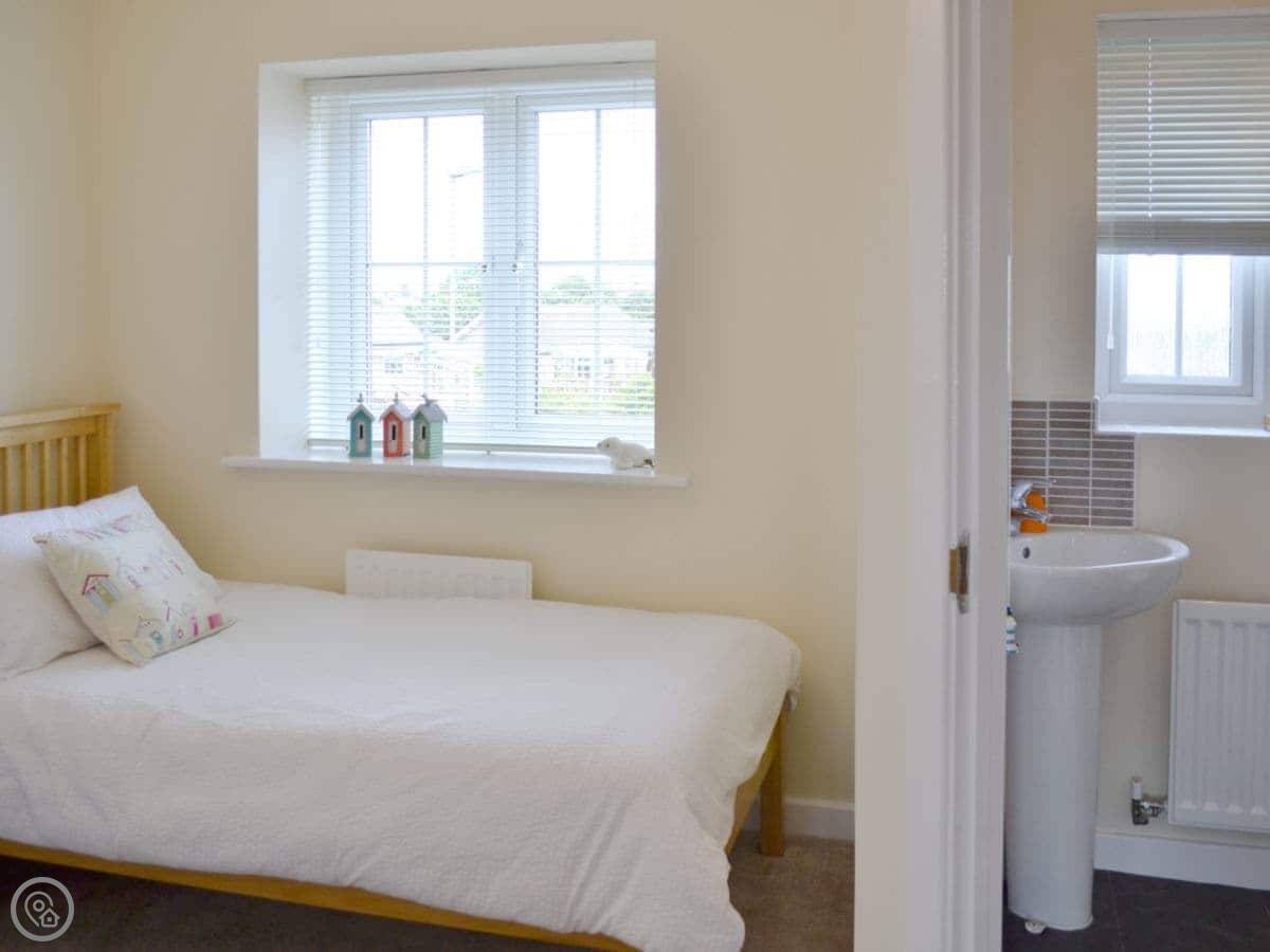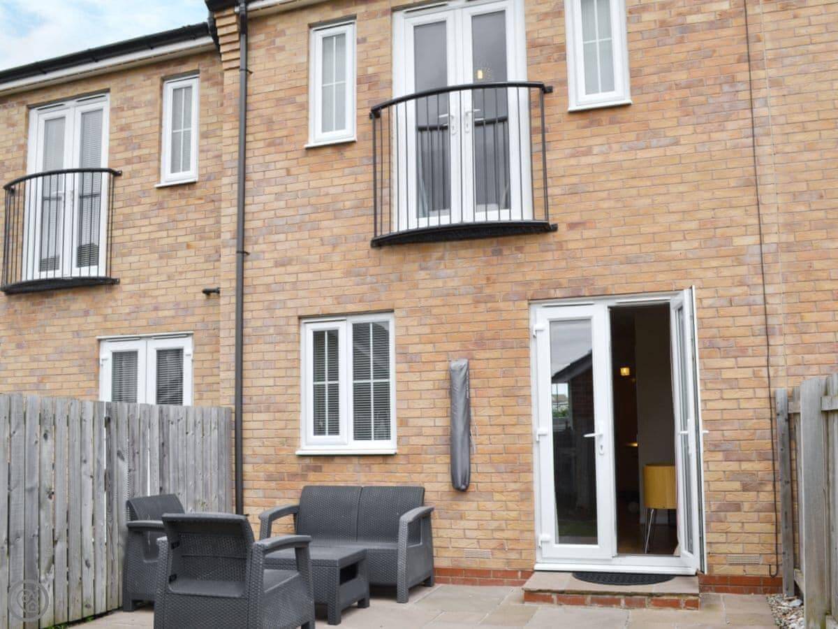 It sleeps four. Two bedrooms, both with their own bathroom. It's got a 3 Star rating, so it's clean and comfortable, not luxurious. Downstairs is all one open space: kitchen, living area, and a door out to the garden. The garden is enclosed, good for a dog or just sitting out.
