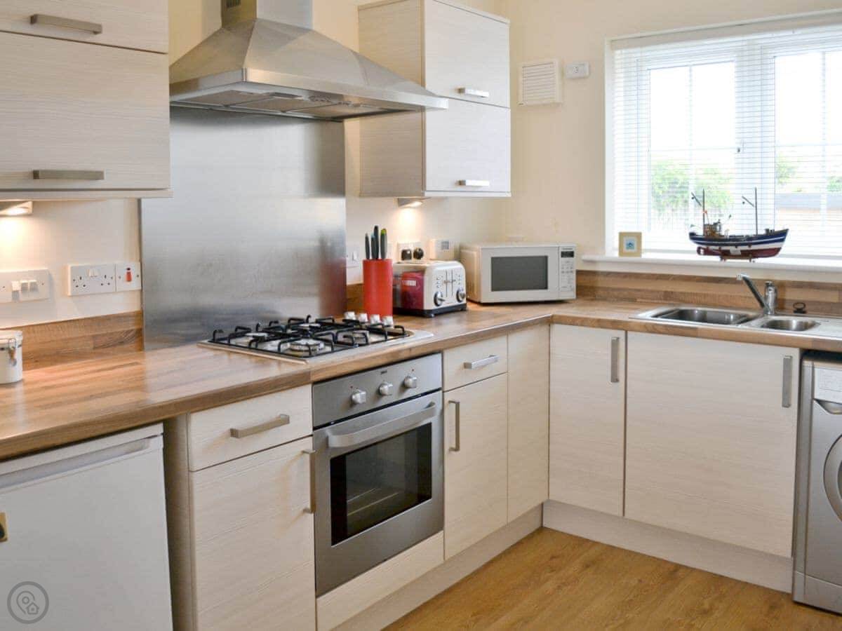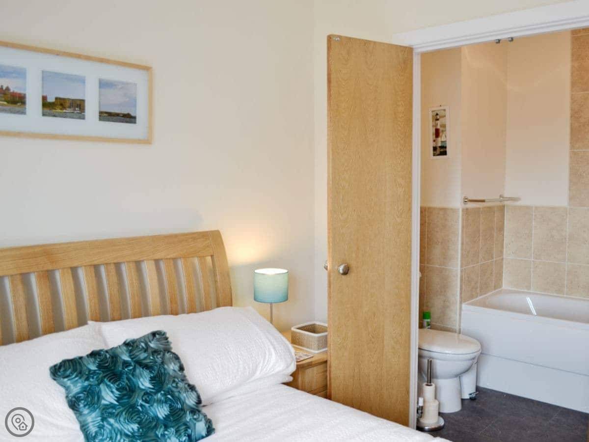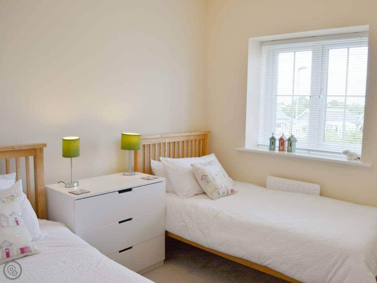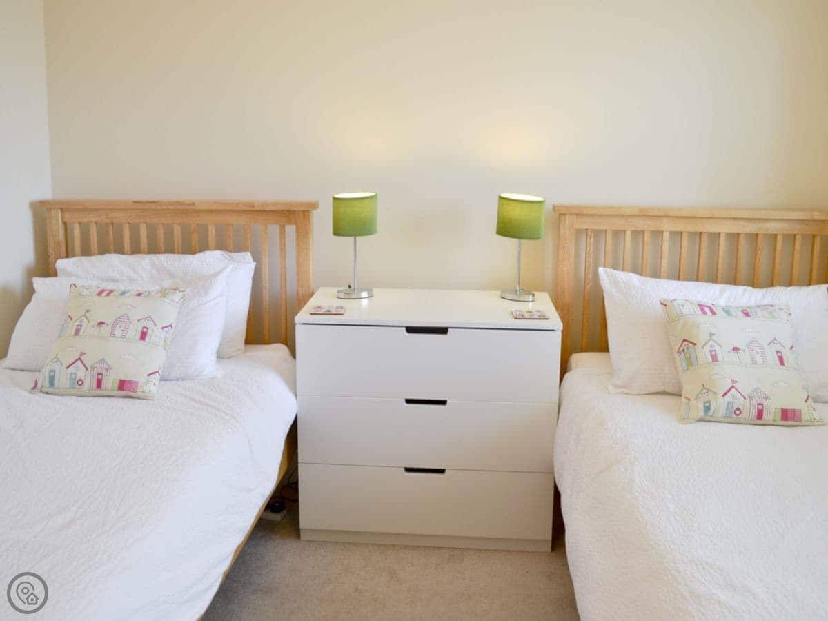 It sleeps four. Two bedrooms, both with their own bathroom. It's got a 3 Star rating, so it's clean and comfortable, not luxurious. Downstairs is all one open space: kitchen, living area, and a door out to the garden. The garden is enclosed, good for a dog or just sitting out.