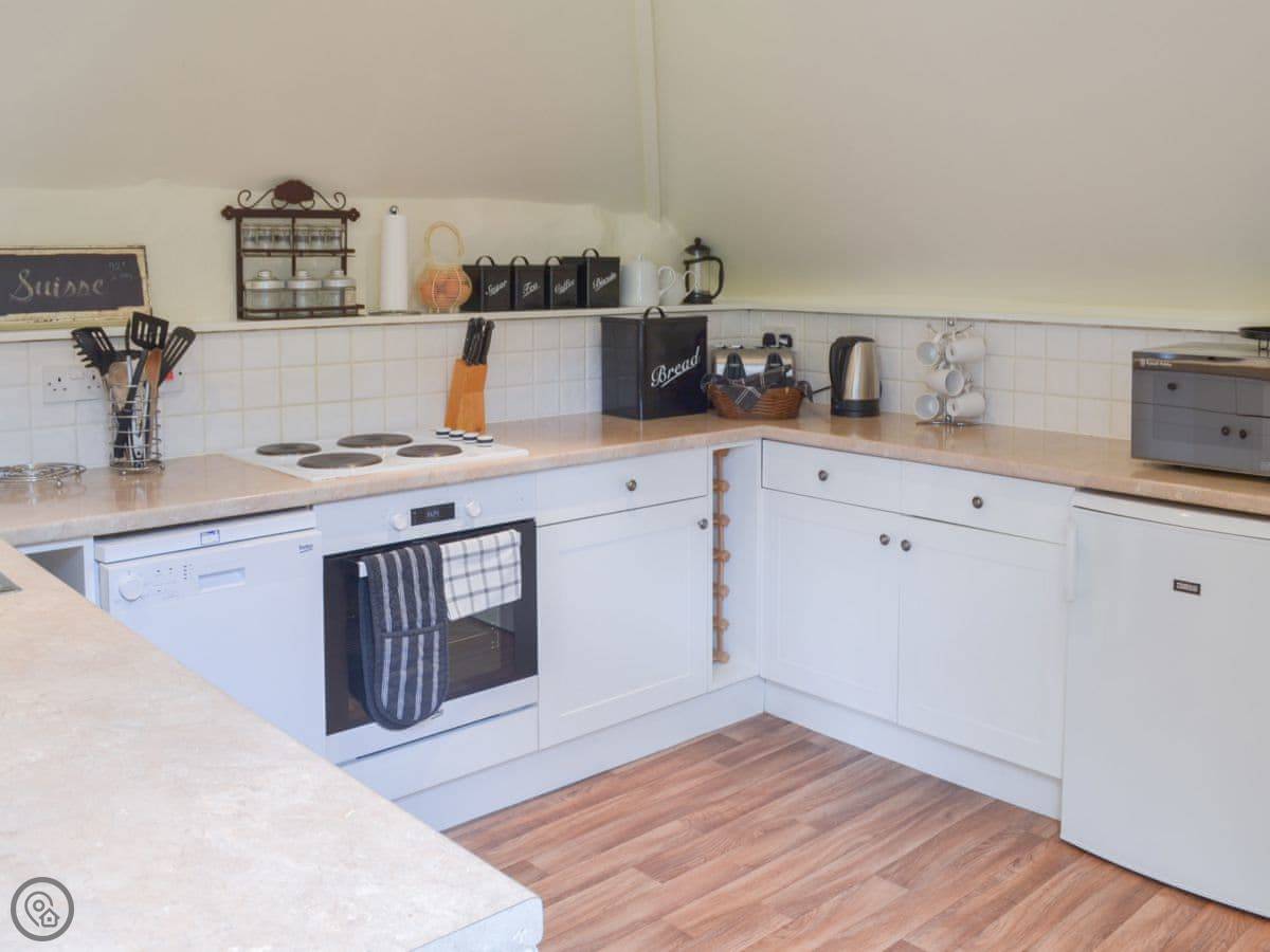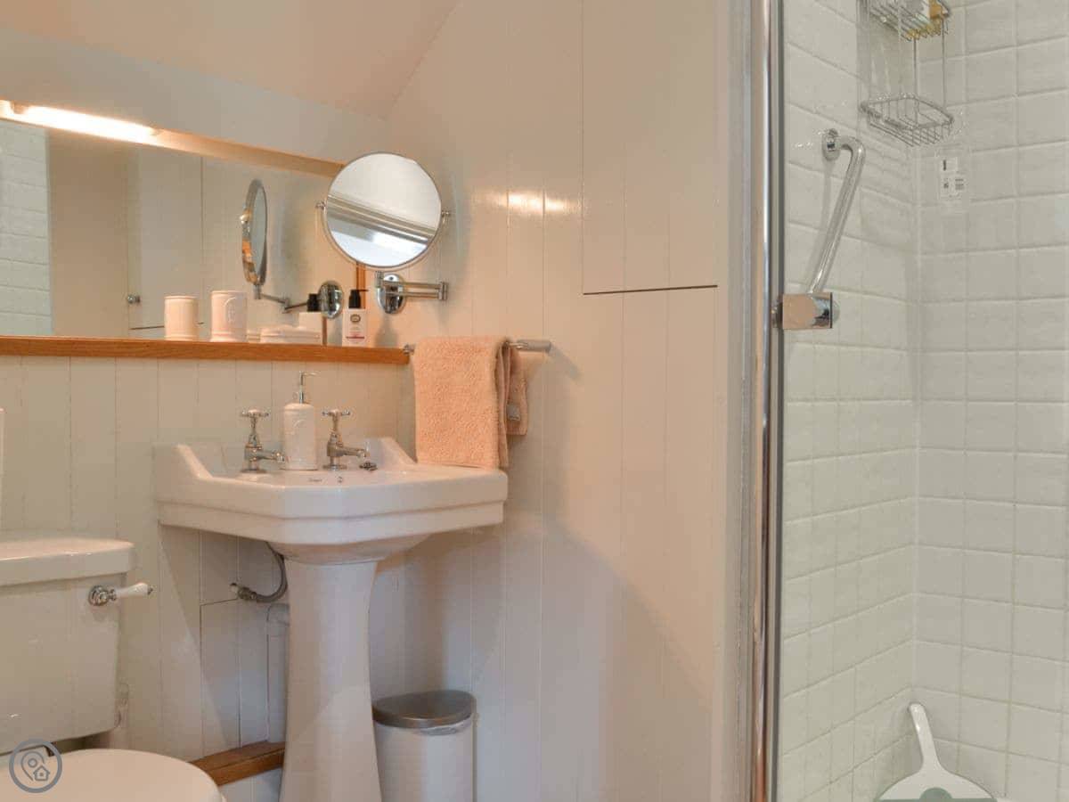 Inside, it's nice. It's got a 4 Star rating. There's underfloor heating, a dishwasher, and a washing machine. The shower is a walk-in one with a seat and a grab rail.