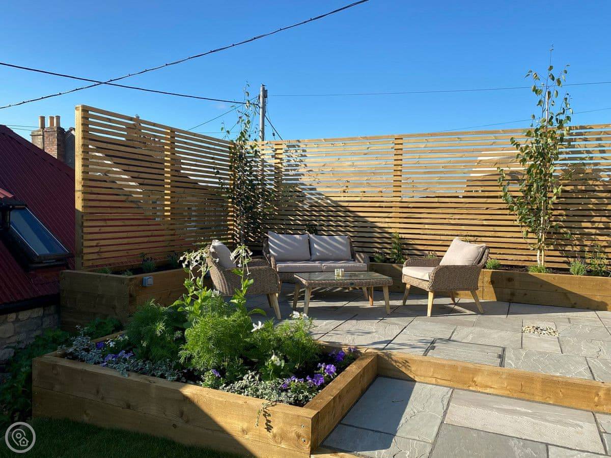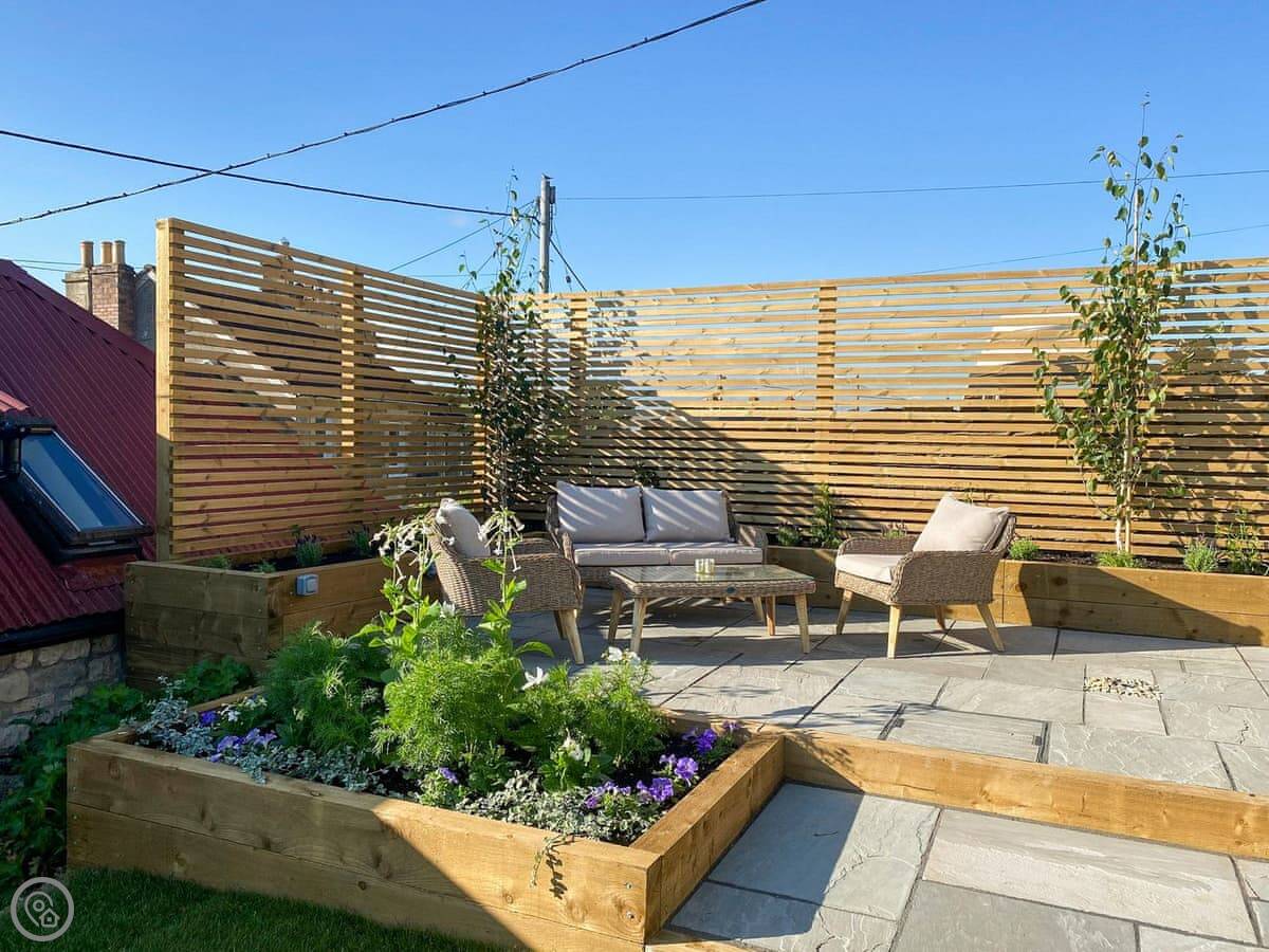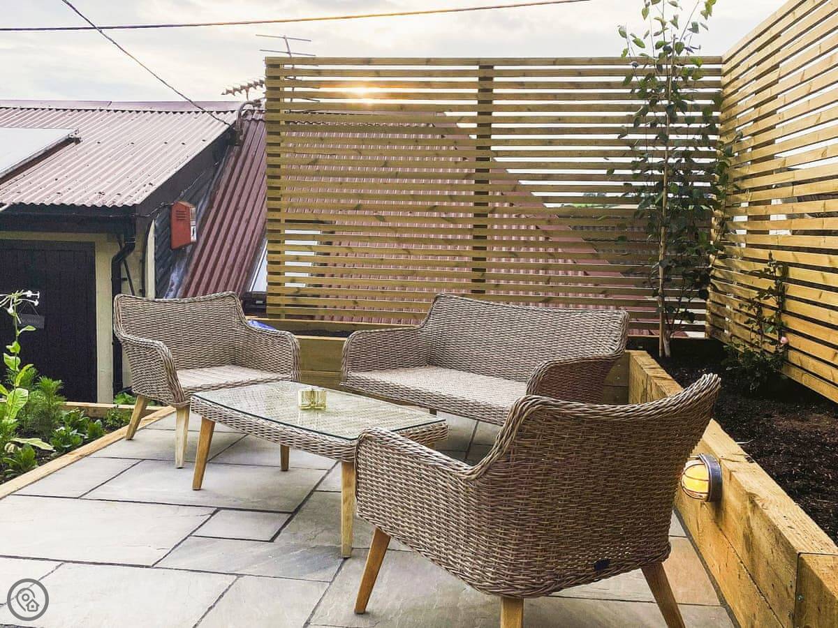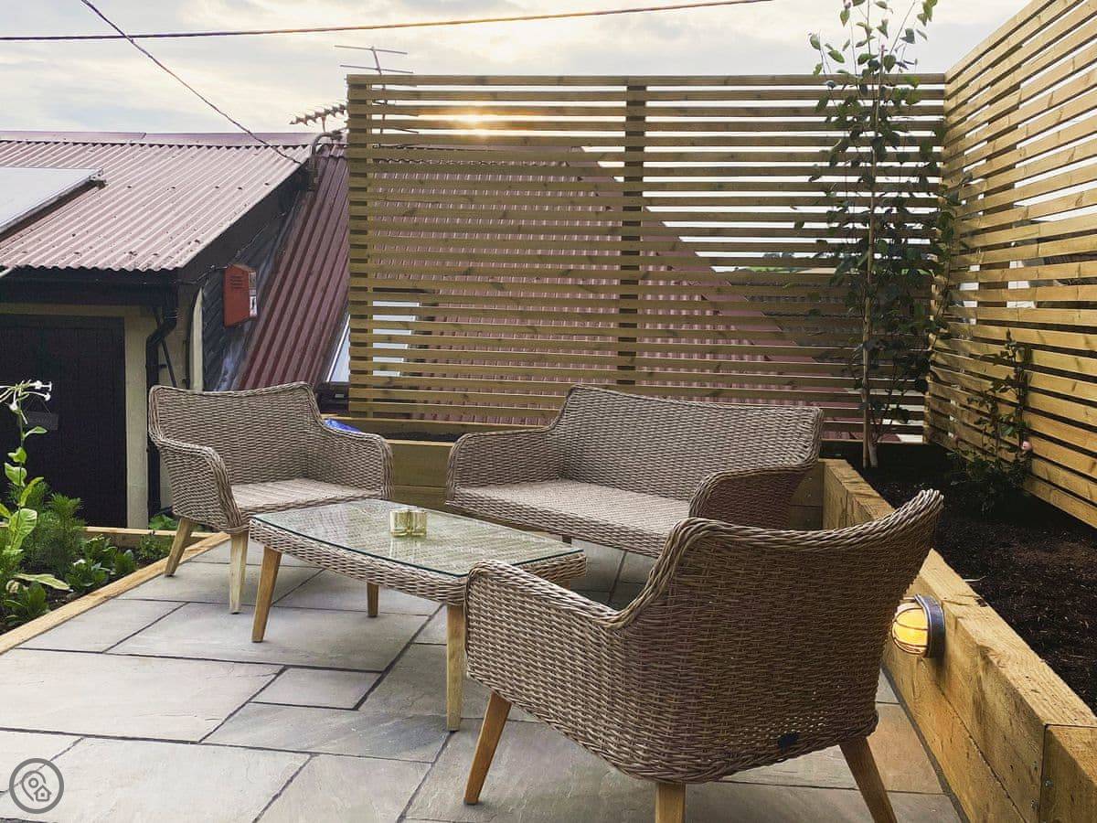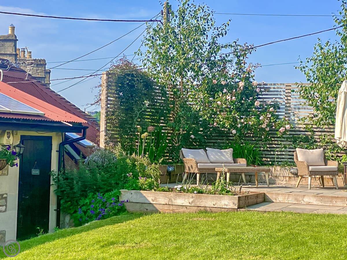 It's for two people. One bedroom, one bathroom. The bedroom and the living room both have doors straight out onto the patio. The garden is yours to use. It's private.