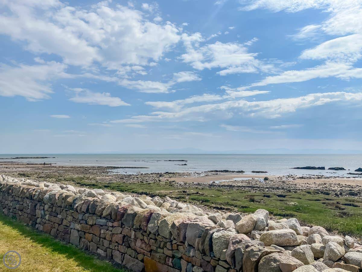 The main room is big and open plan. It has picture windows on three sides, so the view is very good. You can see the sea, the beach, and the hills across the Solway. There's a patio door that leads straight out to the garden and the path to the shore.