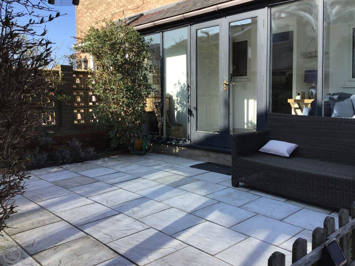 The open plan living space on the ground floor also has white oak ceramic floor tiles, comfortable seating, a stylish round glass table, a kitchen with quartz concrete-effect worktop and French doors which lead to a large triple decked balcony, where guests can rest and refresh. The garden furniture includes a four seater table ad chairs and a two seater rattan sofa the cushions of which are located in the sun room.