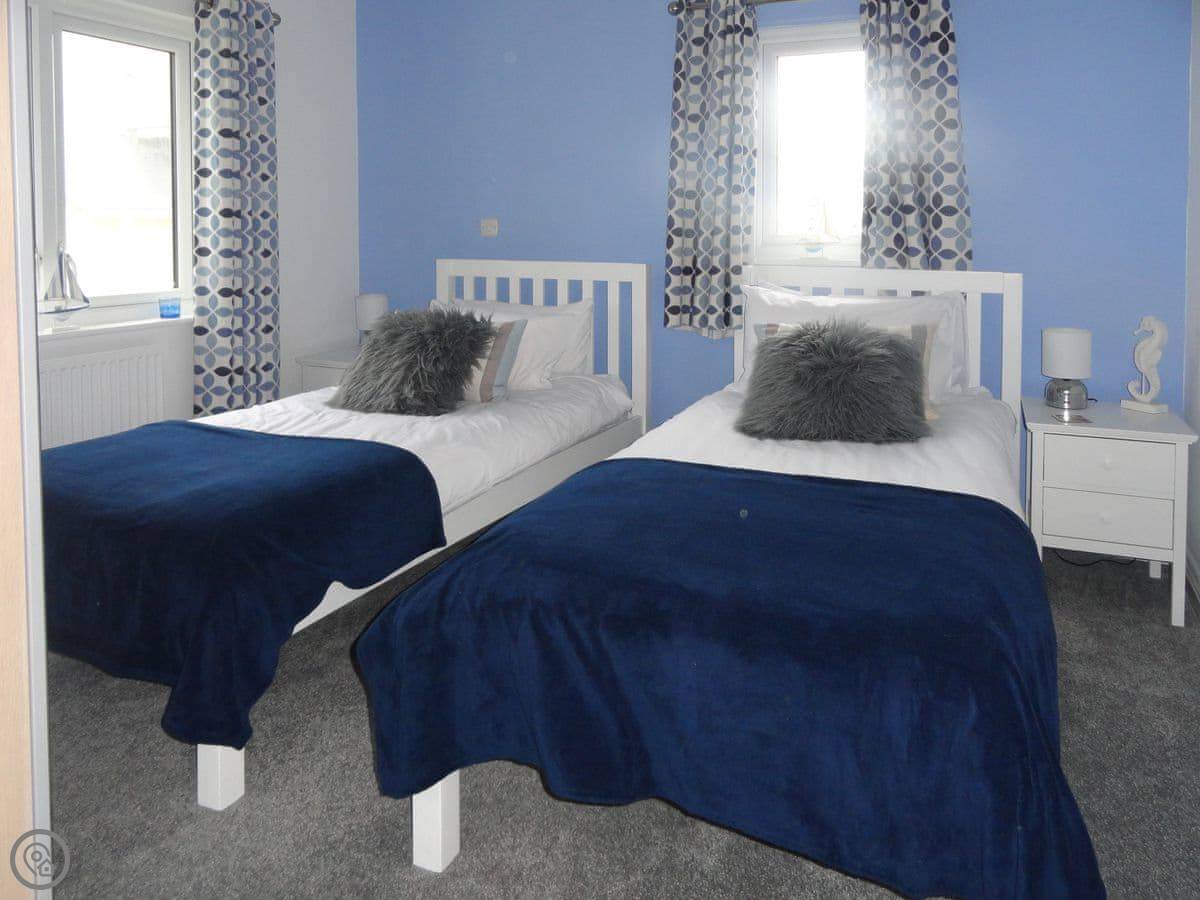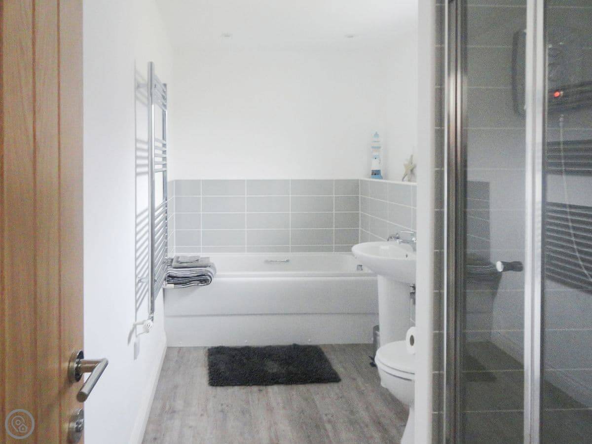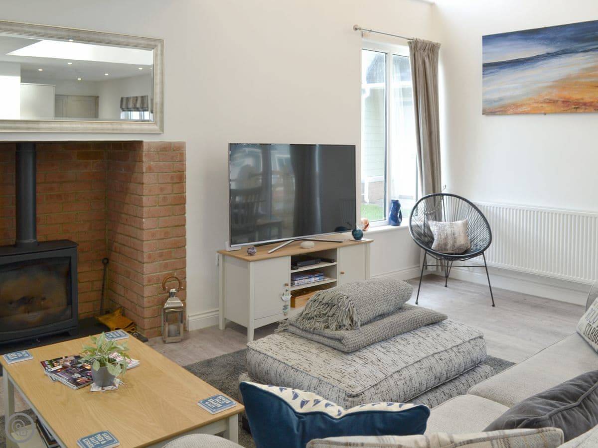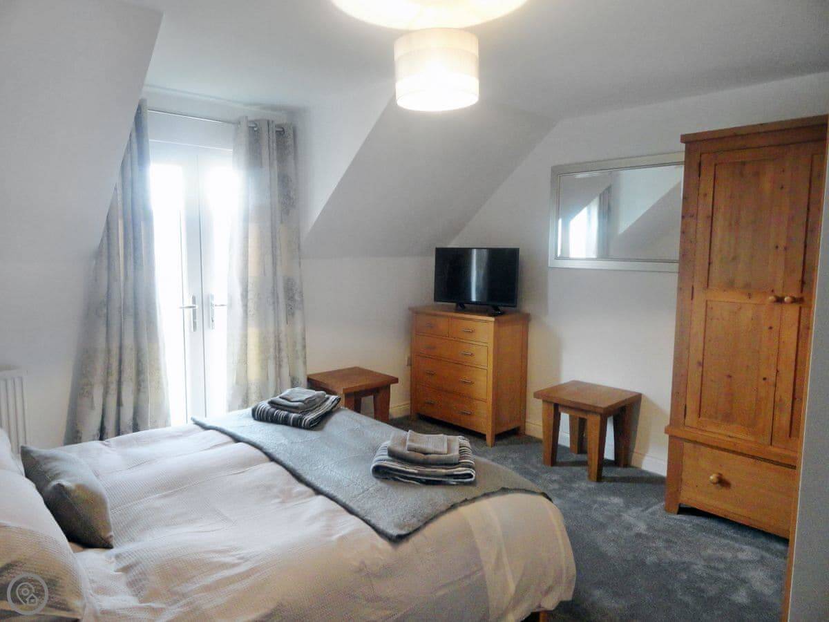 The main living space is open plan, with big windows and french doors out to a decked patio. There's a wood burning stove in there. There's a double bedroom on the ground floor, which is handy, and a downstairs cloakroom. Upstairs, there's a kingsize bedroom with an en-suite shower room and a twin room. The main family bathroom has both a bath and a separate shower cubicle.