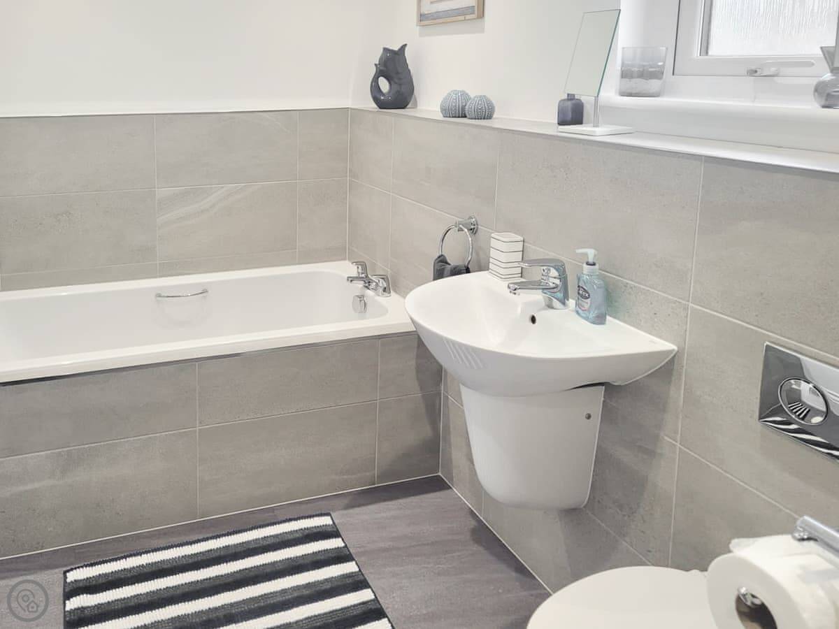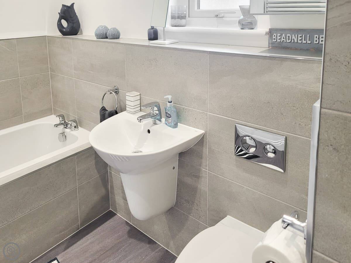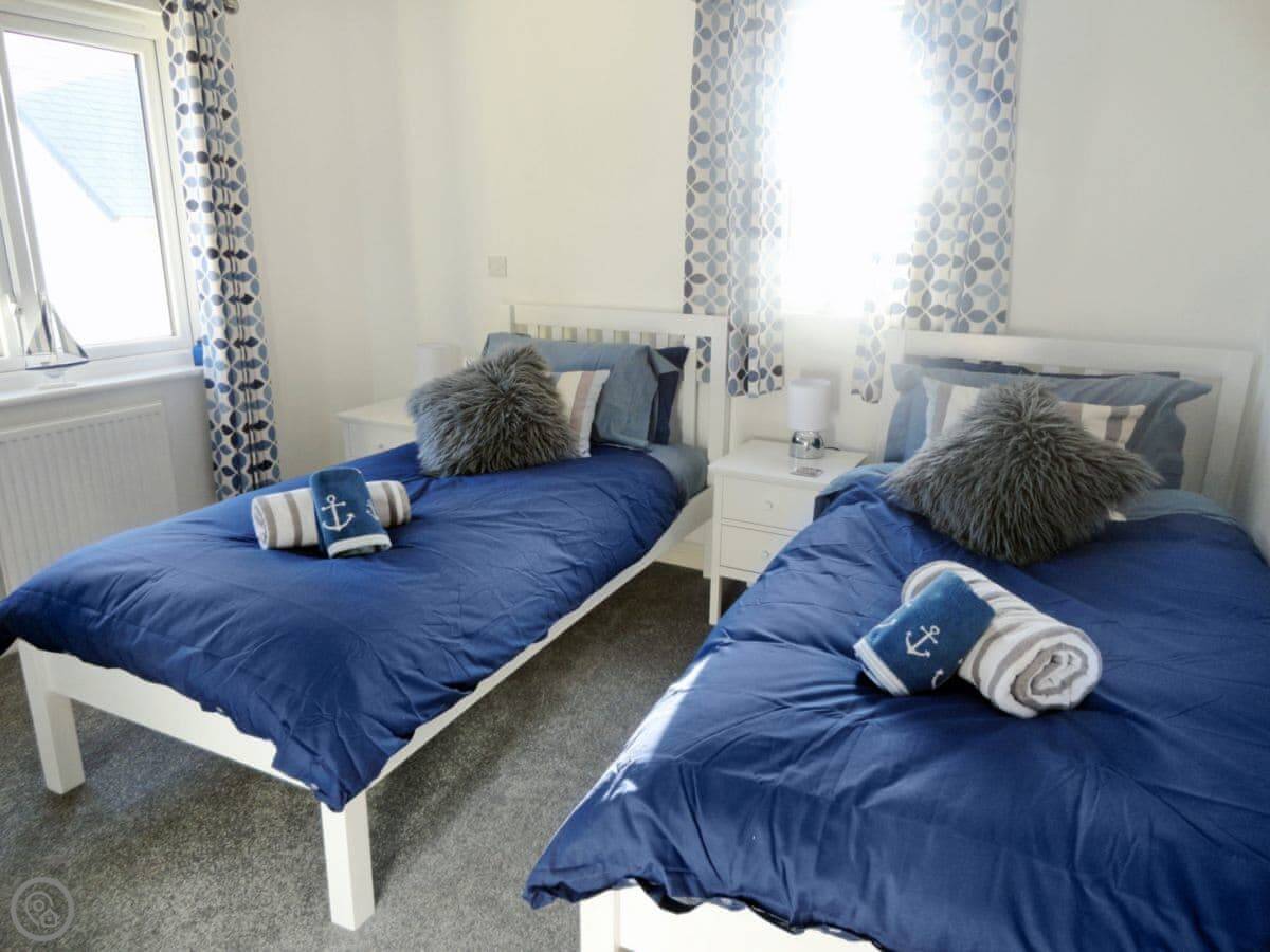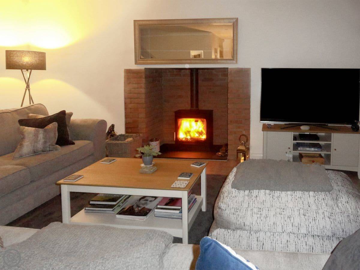 The main living space is open plan, with big windows and french doors out to a decked patio. There's a wood burning stove in there. There's a double bedroom on the ground floor, which is handy, and a downstairs cloakroom. Upstairs, there's a kingsize bedroom with an en-suite shower room and a twin room. The main family bathroom has both a bath and a separate shower cubicle.