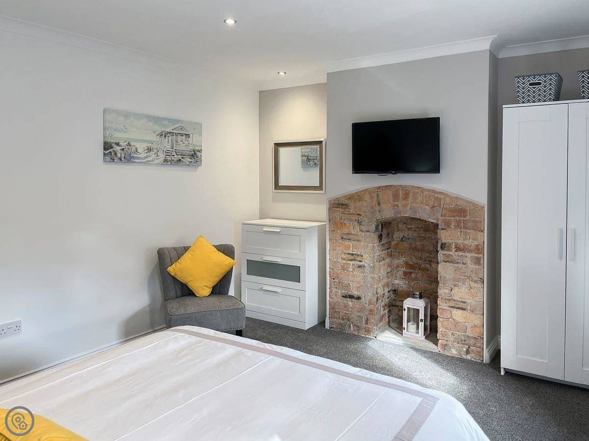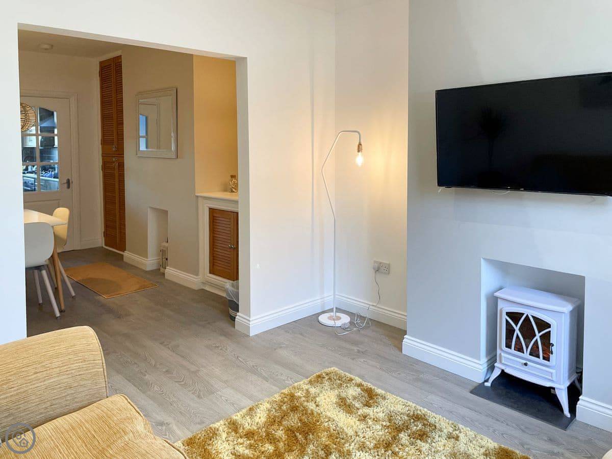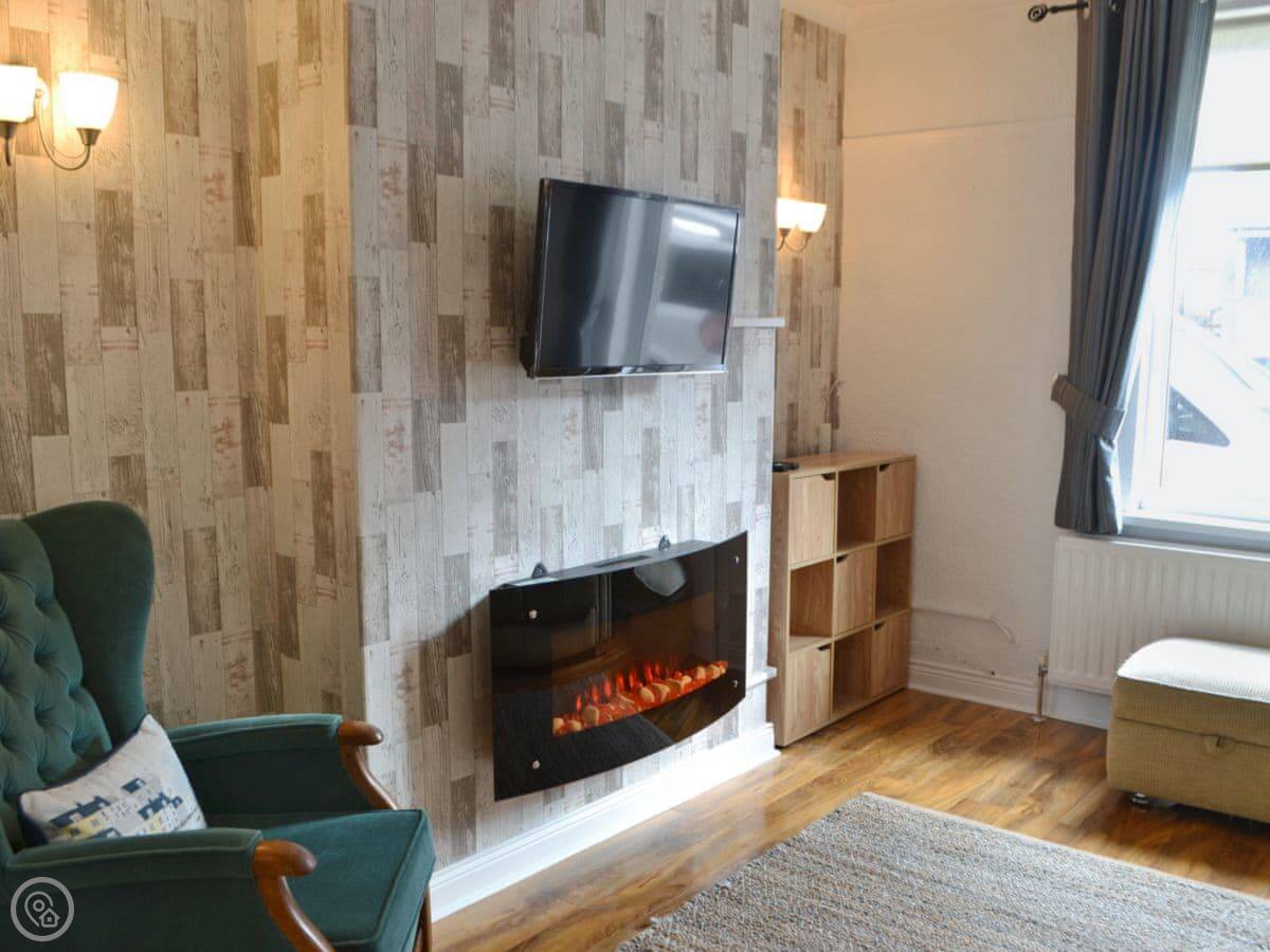 It sleeps four. Two bedrooms, one bathroom. It's got a 4 Star rating. We've been refurbishing it bit by bit over the last few years. The living room has a brick fireplace and a smart TV on the wall.