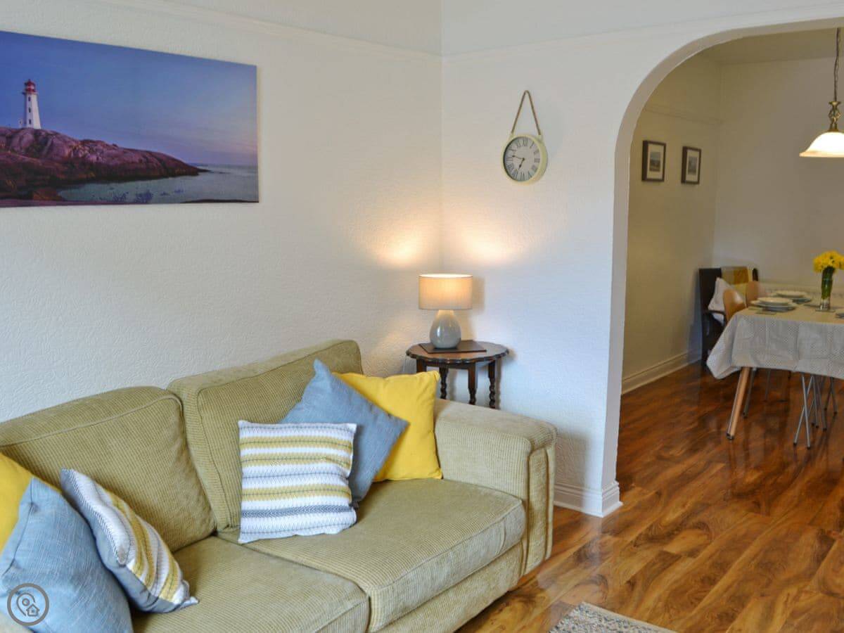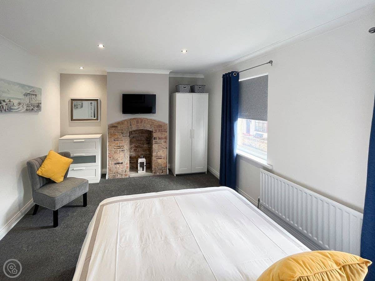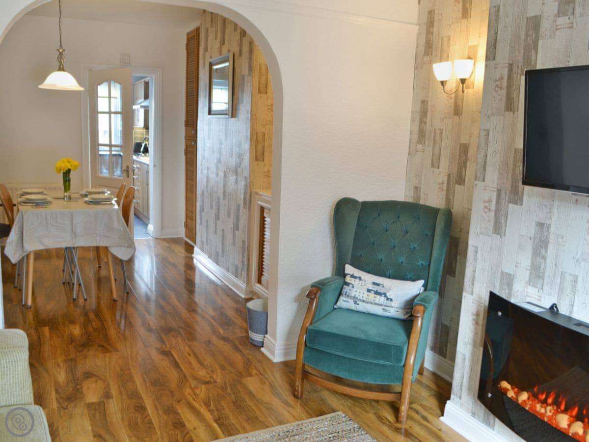 It sleeps four. Two bedrooms, one bathroom. It's got a 4 Star rating. We've been refurbishing it bit by bit over the last few years. The living room has a brick fireplace and a smart TV on the wall.