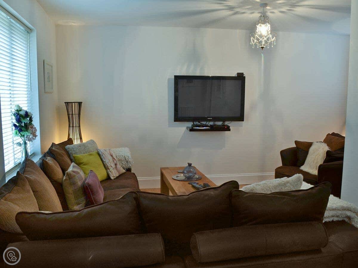 Downstairs is one open space. The kitchen leads into the sitting area. There's a sofa, a chair, and a TV. The back door opens onto a small, enclosed patio garden. It gets the sun in the afternoon. You can sit out there.