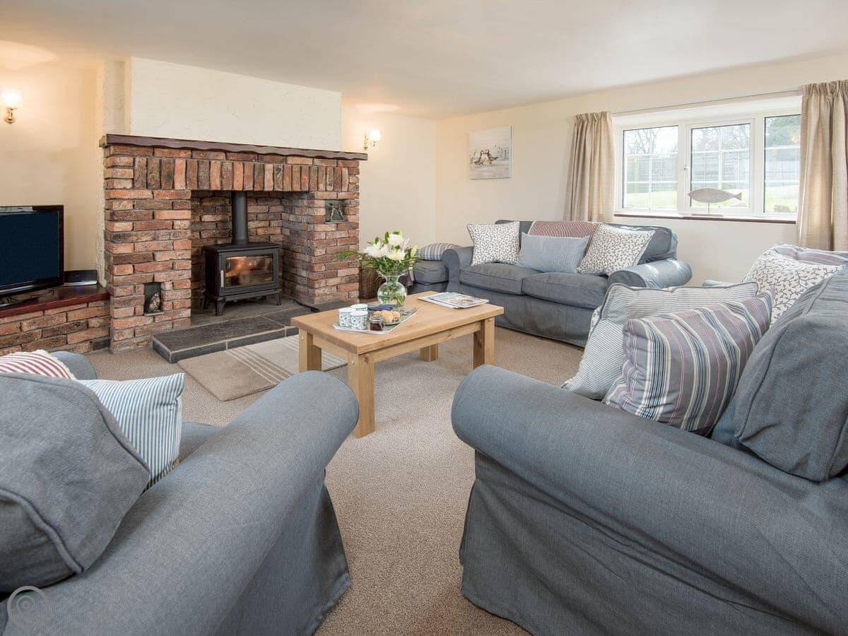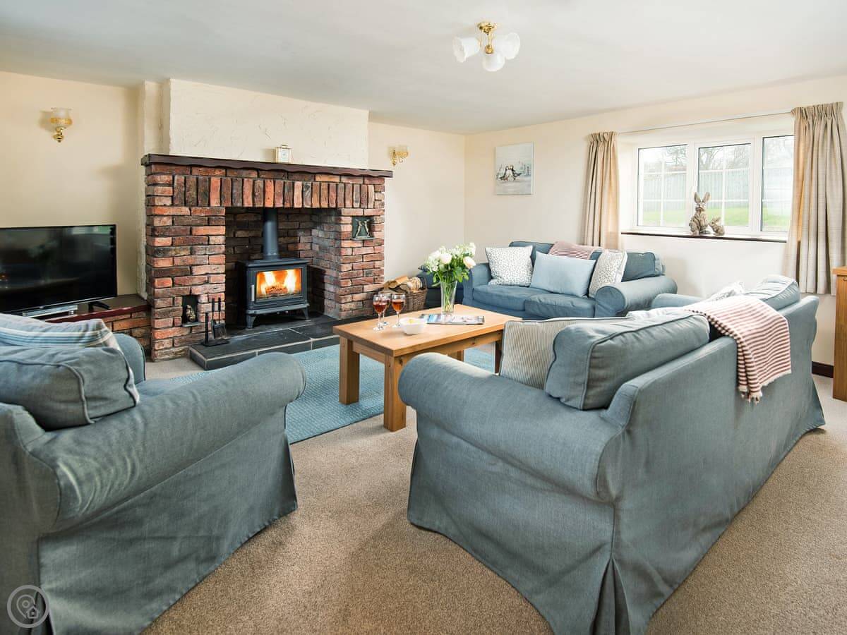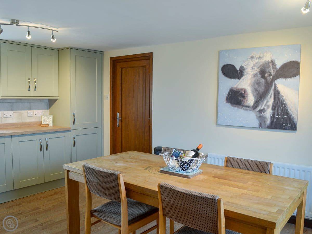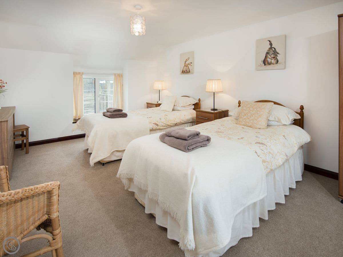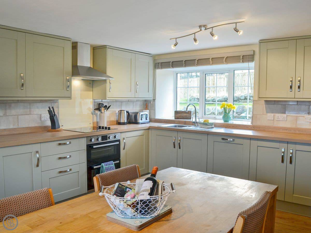 It sleeps six. Three bedrooms, all doubles, and one bathroom upstairs. There's a cloakroom downstairs too. It's a 4 Star place, so it's well looked after and comfortable. The living room has a wood burner. The kitchen is a decent size for a cottage.