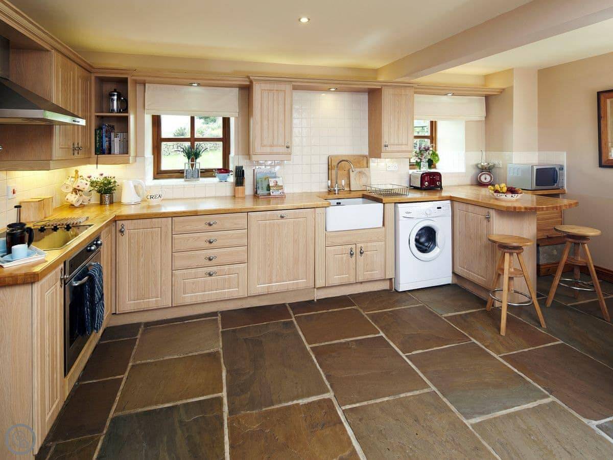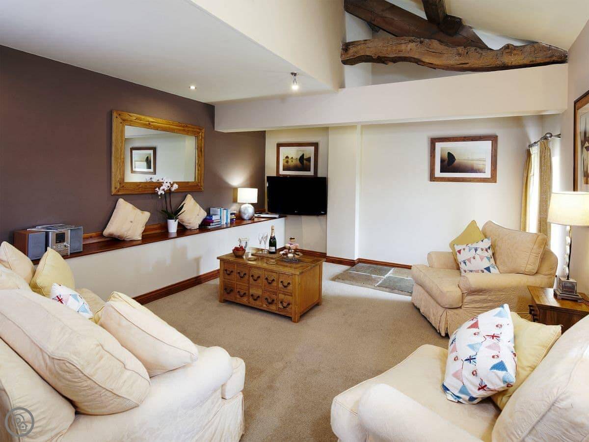 It sleeps four. Two bedrooms, two bathrooms. It's got a five star rating. It's done up nicely inside, with the original beams and stonework still showing. There's a wood burner.