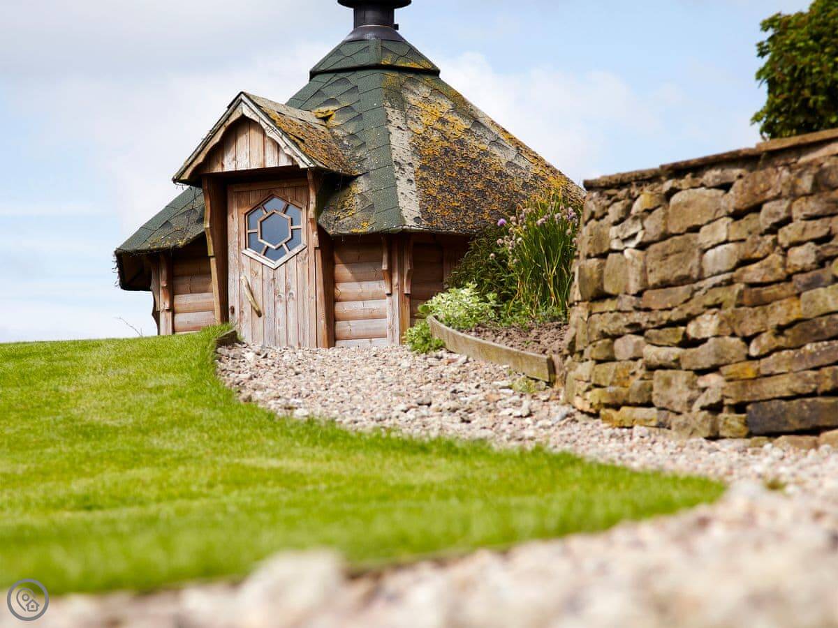 The gardens are shared with a few other cottages on the site. They're big and have different places to sit. There's also a shared tennis court, a Finnish barbecue hut, and a hot tub.