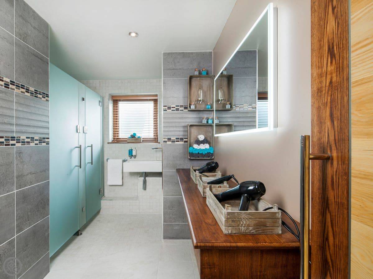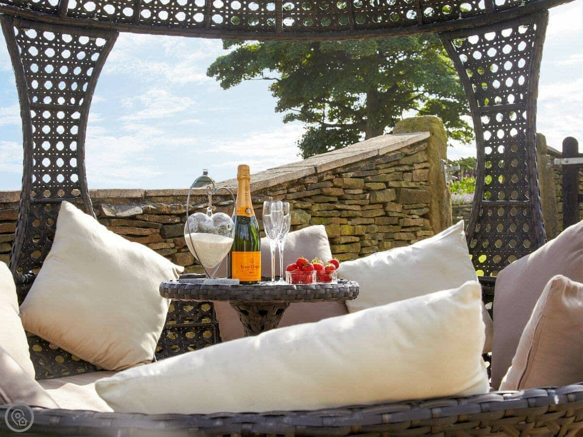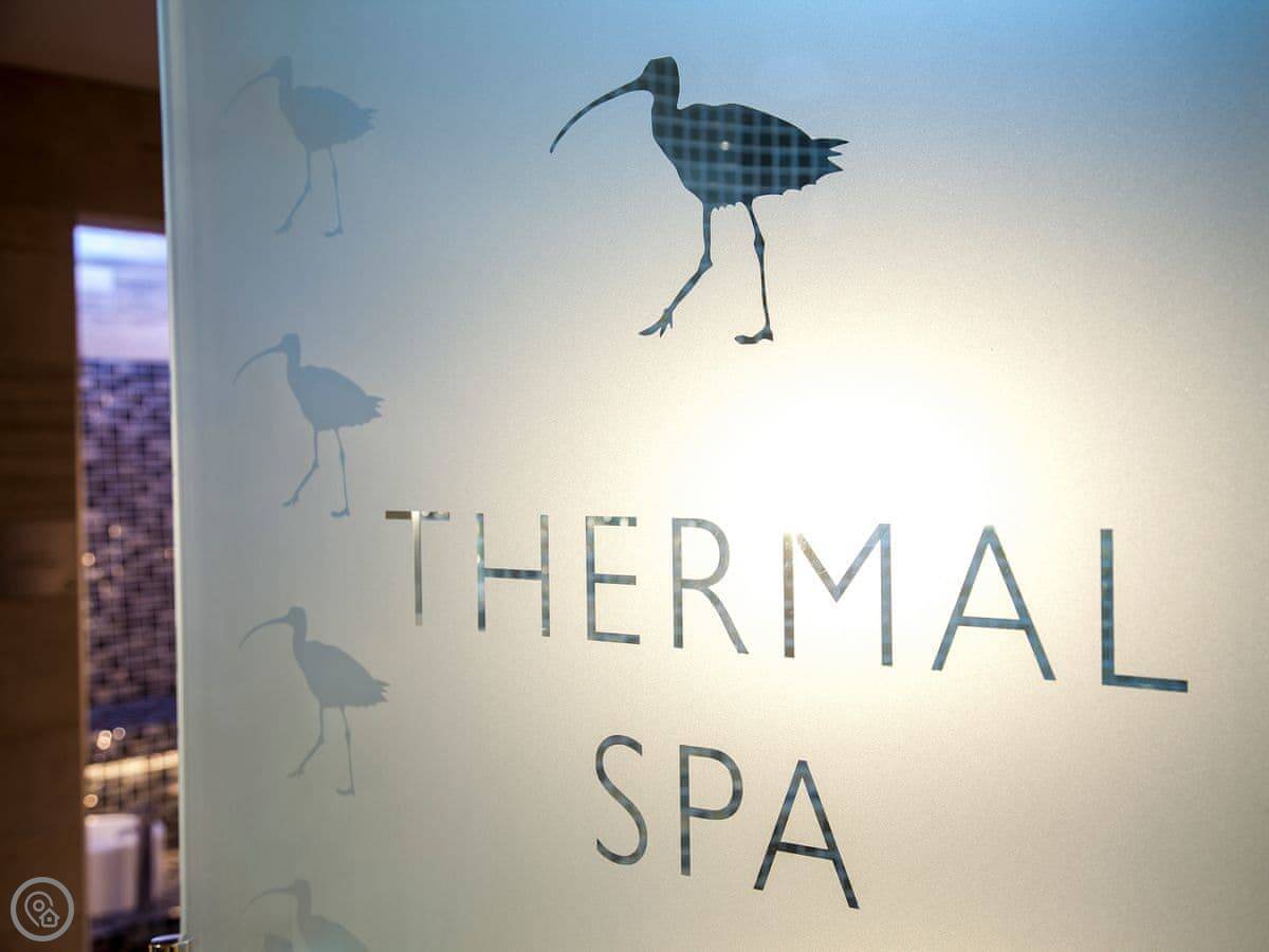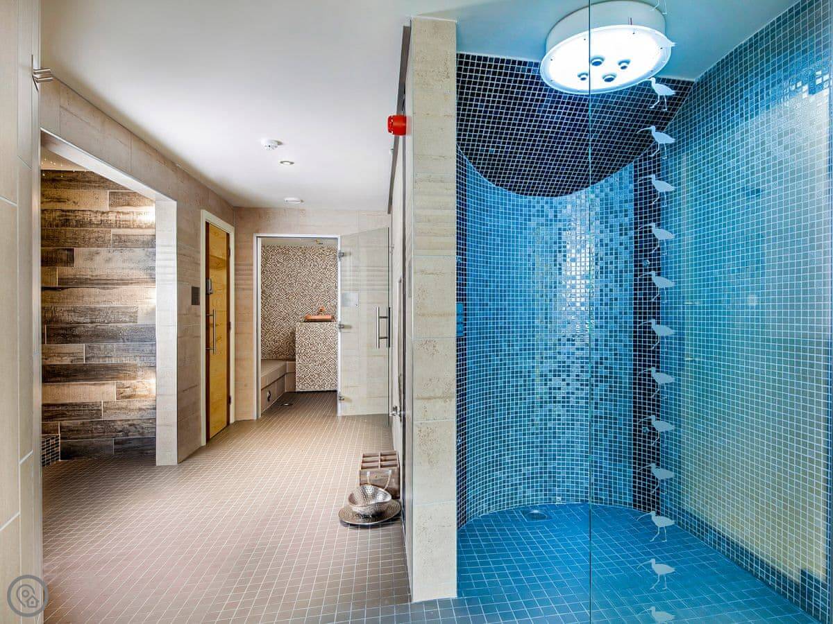 You share the grounds with the other cottages. There are extensive gardens with different seating areas to take in the view. There's also a shared hot tub, a tennis court, and a Finnish barbecue house. The main attraction is the on-site spa. It's quite comprehensive: steam rooms, saunas, a mud room, that sort of thing. You need to book sessions and there's an extra charge for using it.