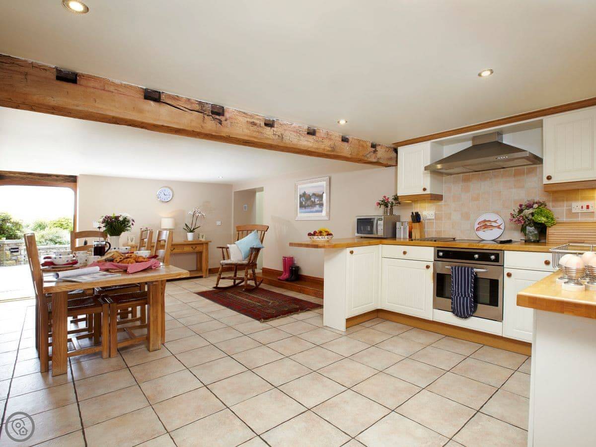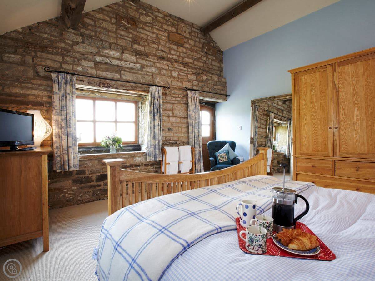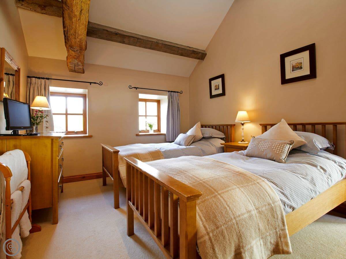 It sleeps four. Two bedrooms, both with their own bathrooms. The rating is 5 Star, so it's well finished. It's got the original beams and stone walls inside.