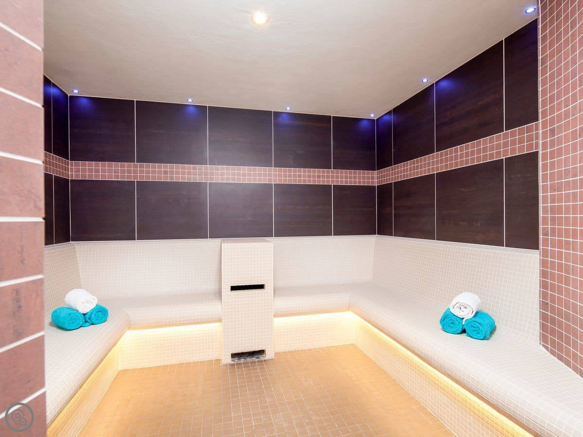 You share the big garden with the other cottages. There's a shared hot tub, a Finnish barbecue hut, and tennis courts too. The on-site spa is a big feature, with steam rooms, saunas, and a few other treatments. You pay extra to use it.