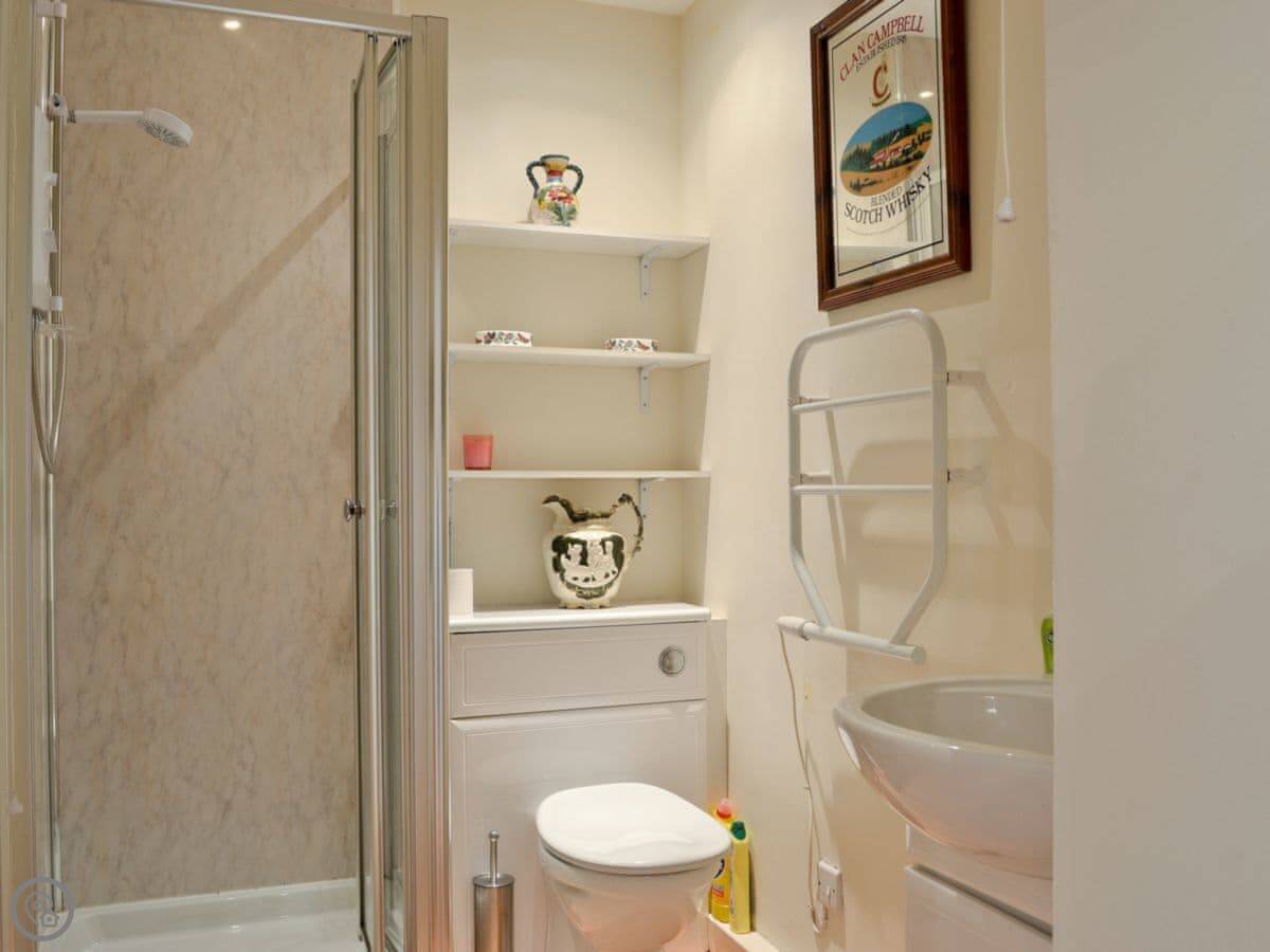 It sleeps four, but in one bedroom. There's a double bed and then a double sofa bed in the living area. It's rated 3 Star, which is about right. It's comfortable and clean, not fancy. The bathroom is downstairs. There's a shower, no bath.