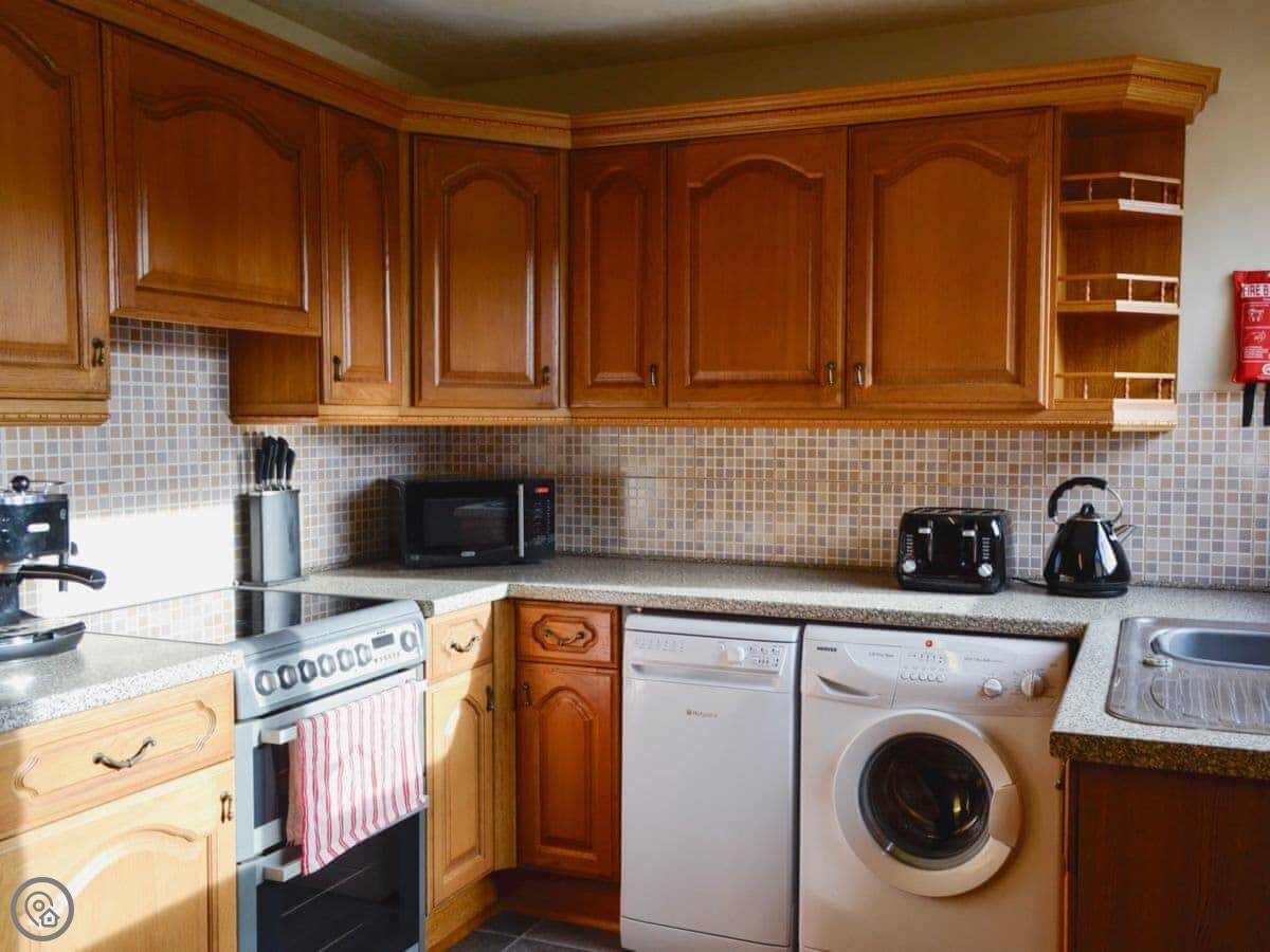 For facilities, you've got the basics: WiFi, TV, washing machine, dishwasher. Bedding and towels are included. There's parking for two cars. You can bring up to two dogs. There's a cot and highchair if you need them.