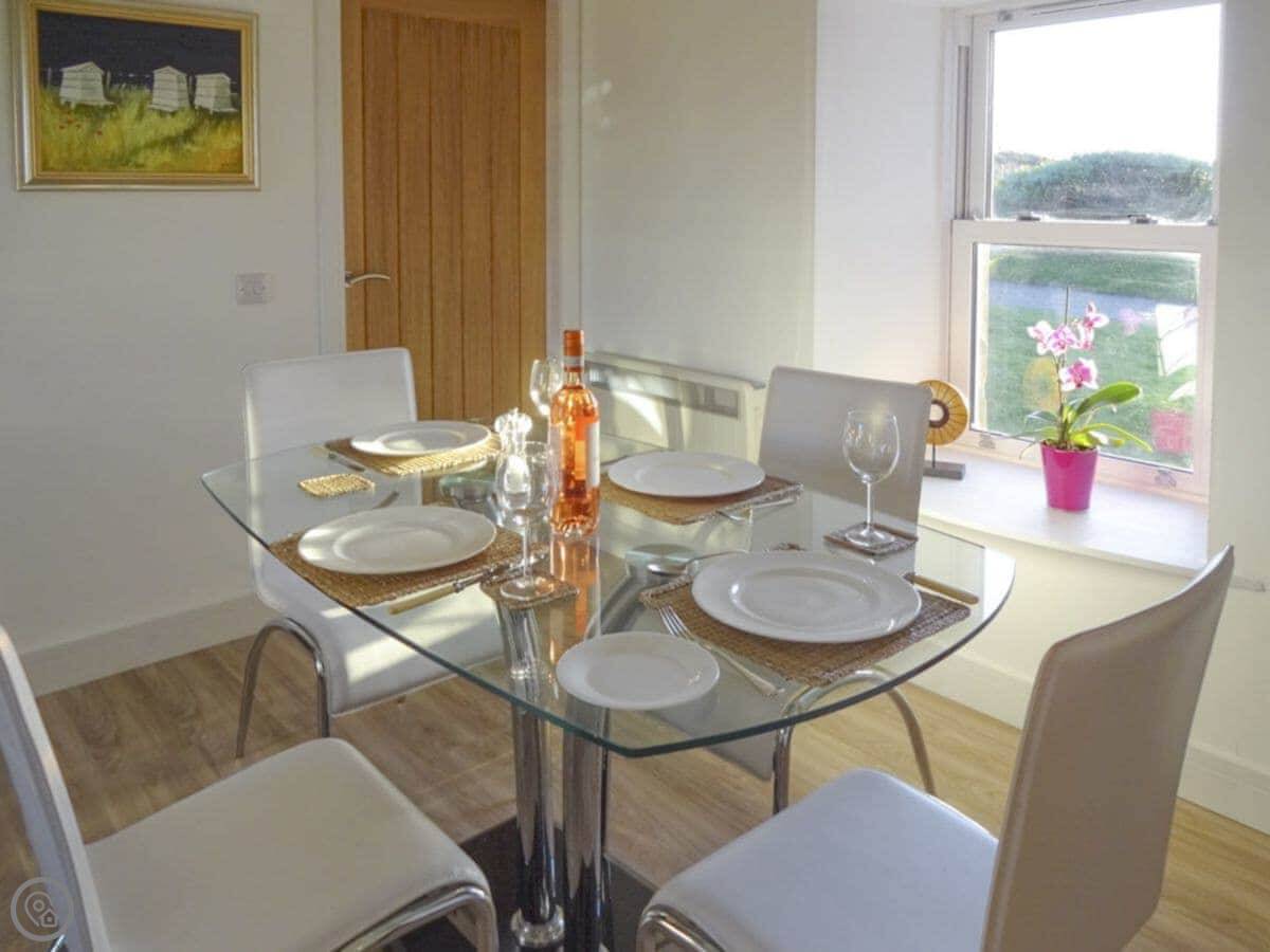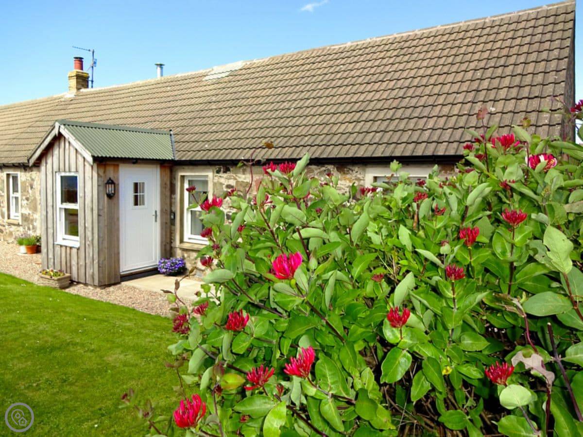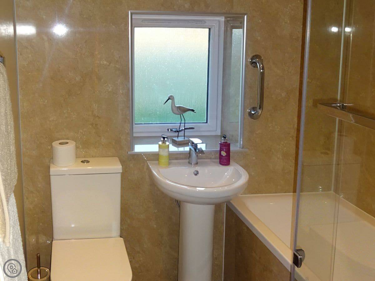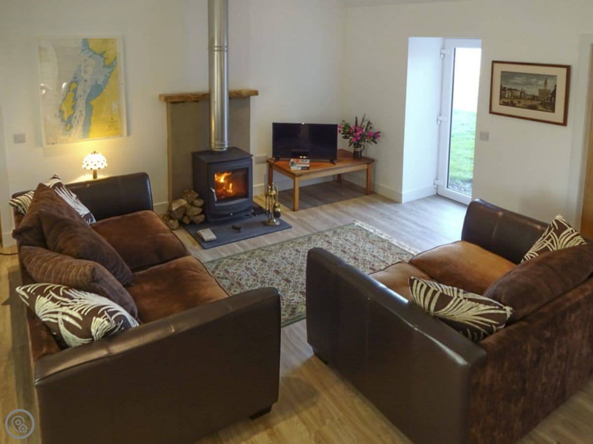 It sleeps four people. Two bedrooms, both doubles, and two bathrooms. One is downstairs. It's got a 4 Star rating. It's been done up inside, so it's warm and the living space is open plan. There's a wood burner. The stairs are a typical cottage style.
