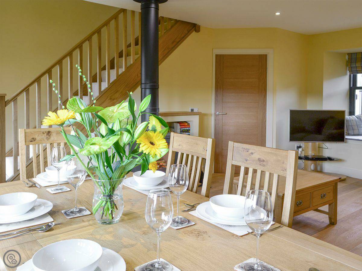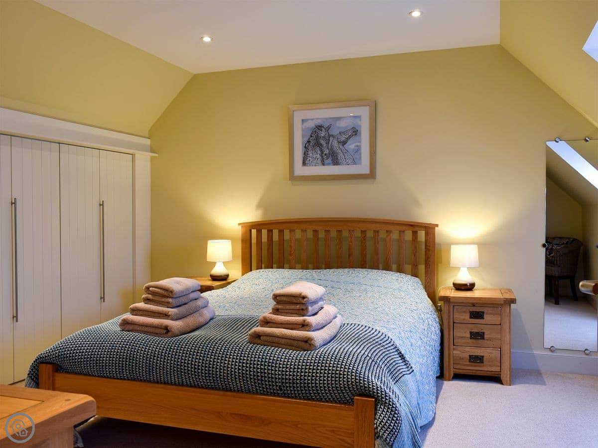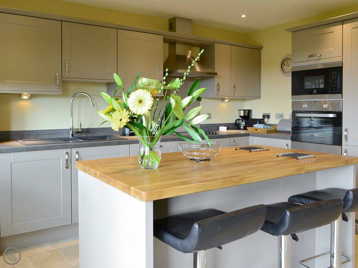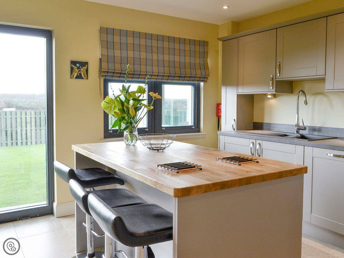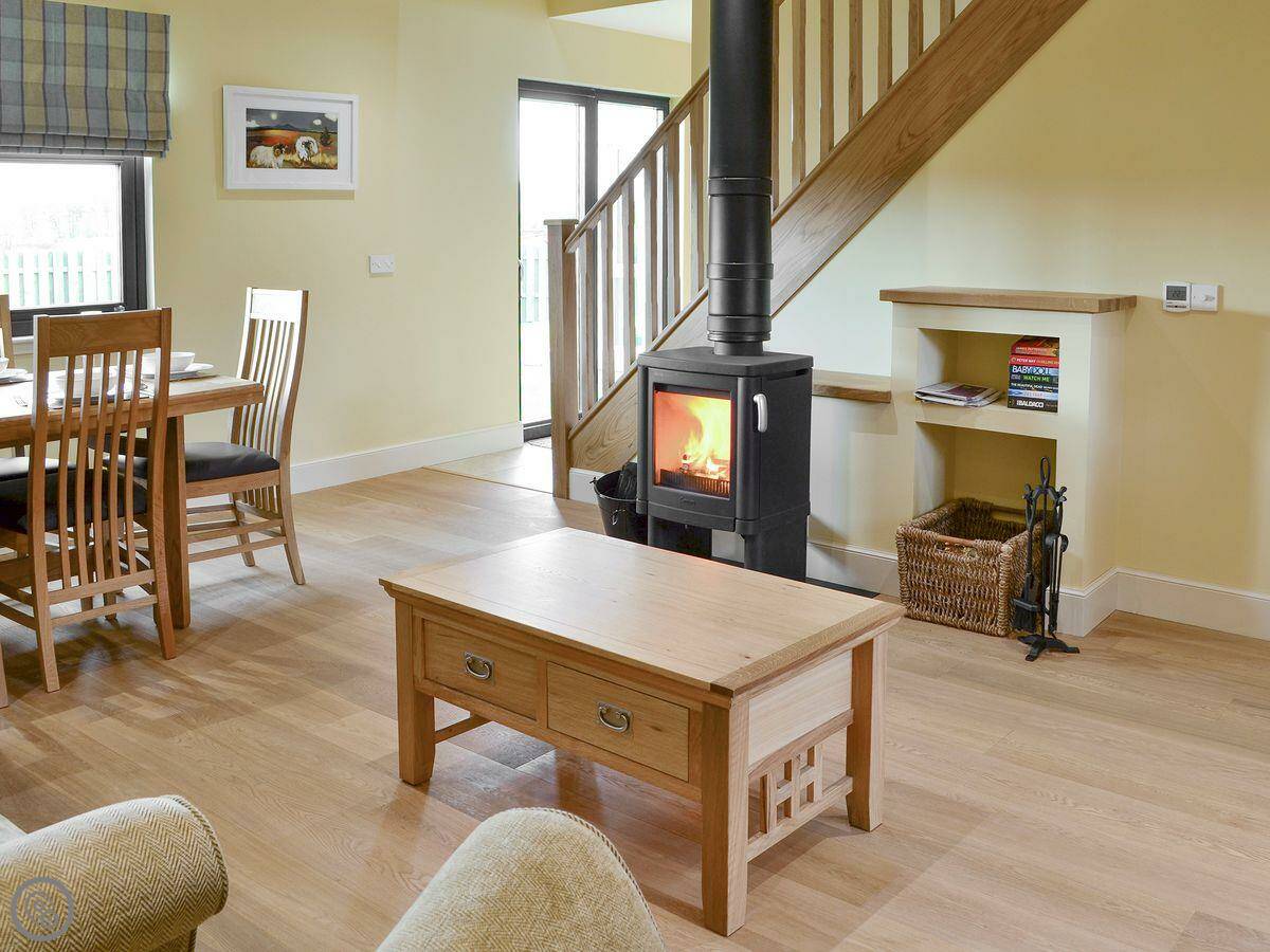 It sleeps four, in two bedrooms. Both bedrooms have their own bathroom. One is a wet room on the ground floor. The doorways are wide and there's no step at the front door, so it works if you have a wheelchair user or someone with limited mobility. The kitchen is open plan with the living area. There's a wood burner. Heating is from a ground source heat pump, so it's efficient, but the wood burner is there if you want the atmosphere.