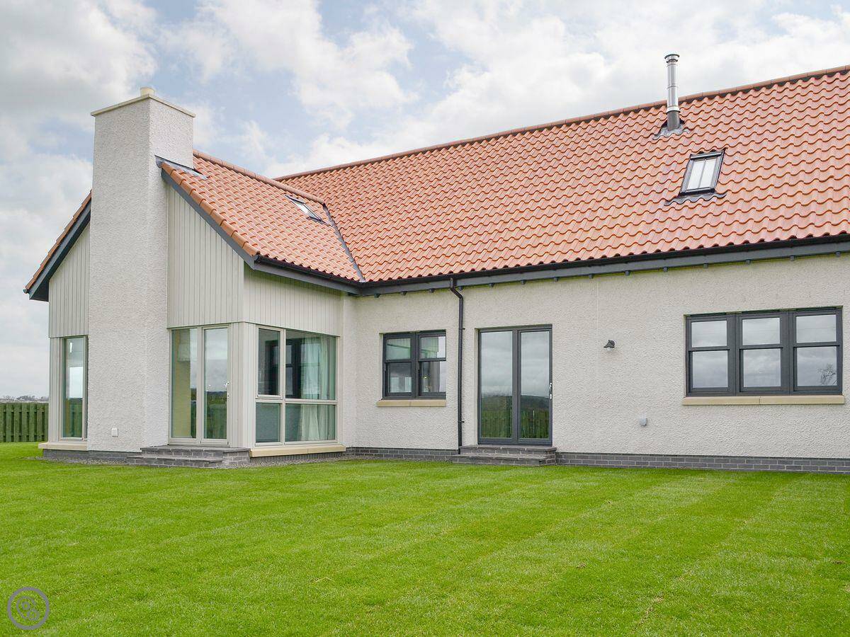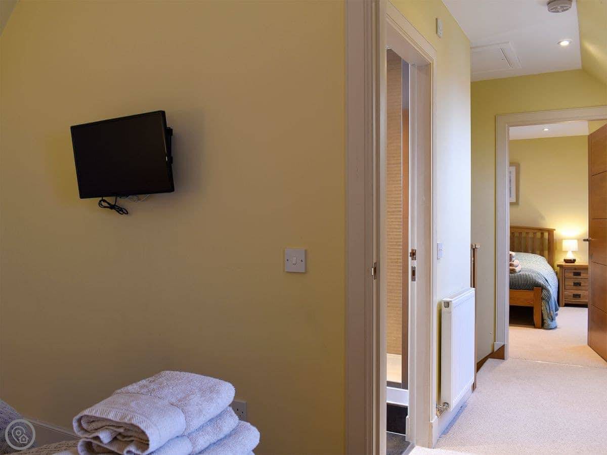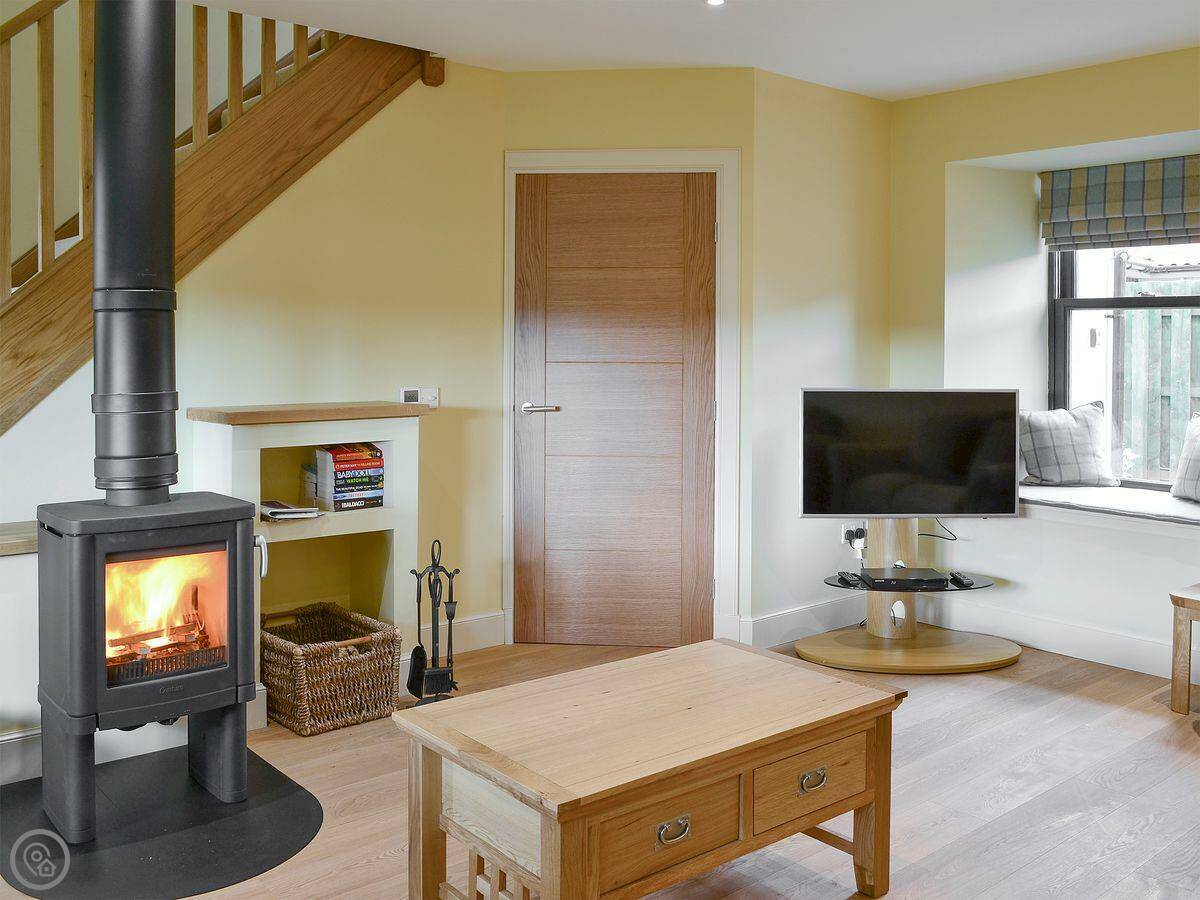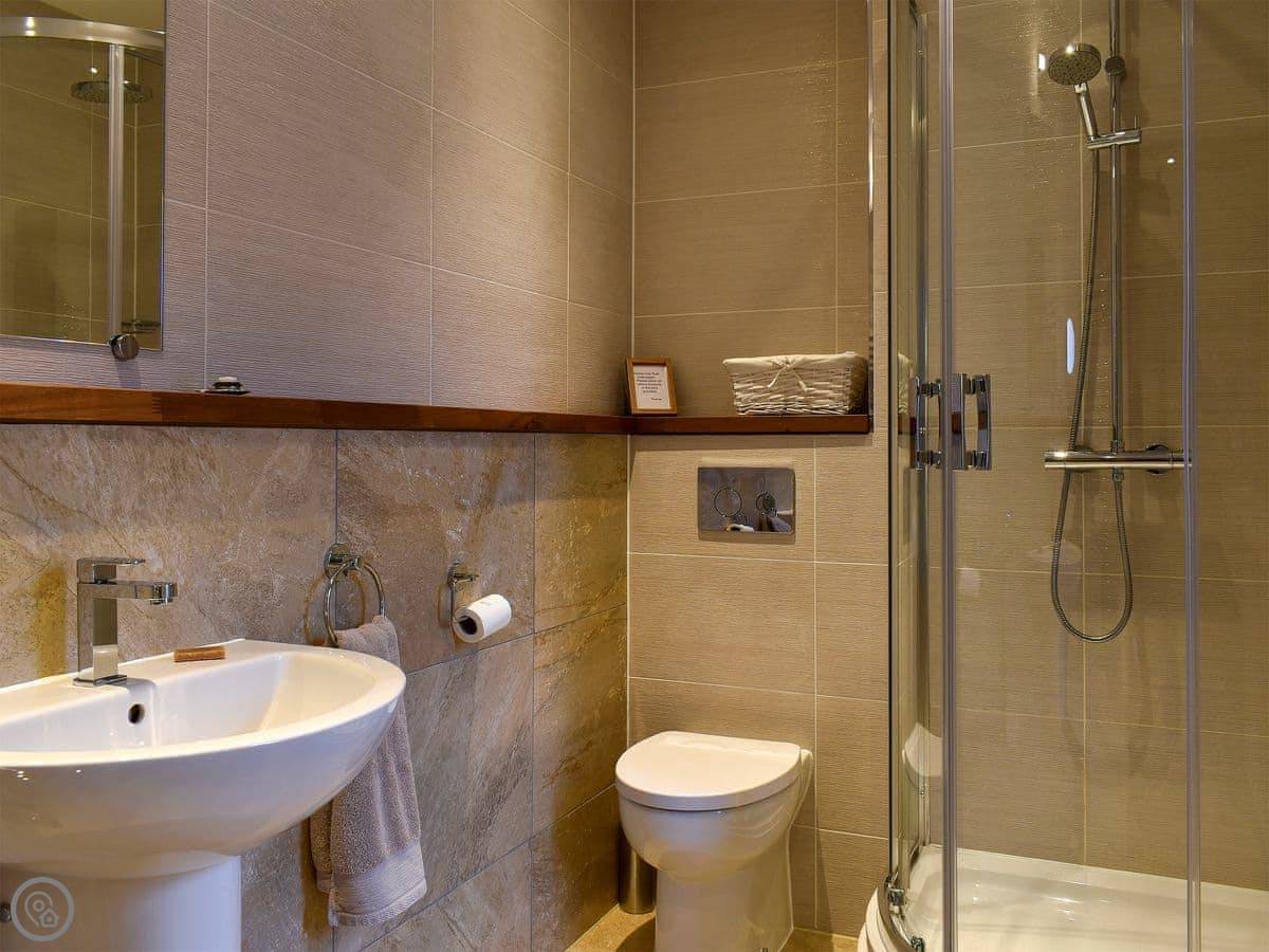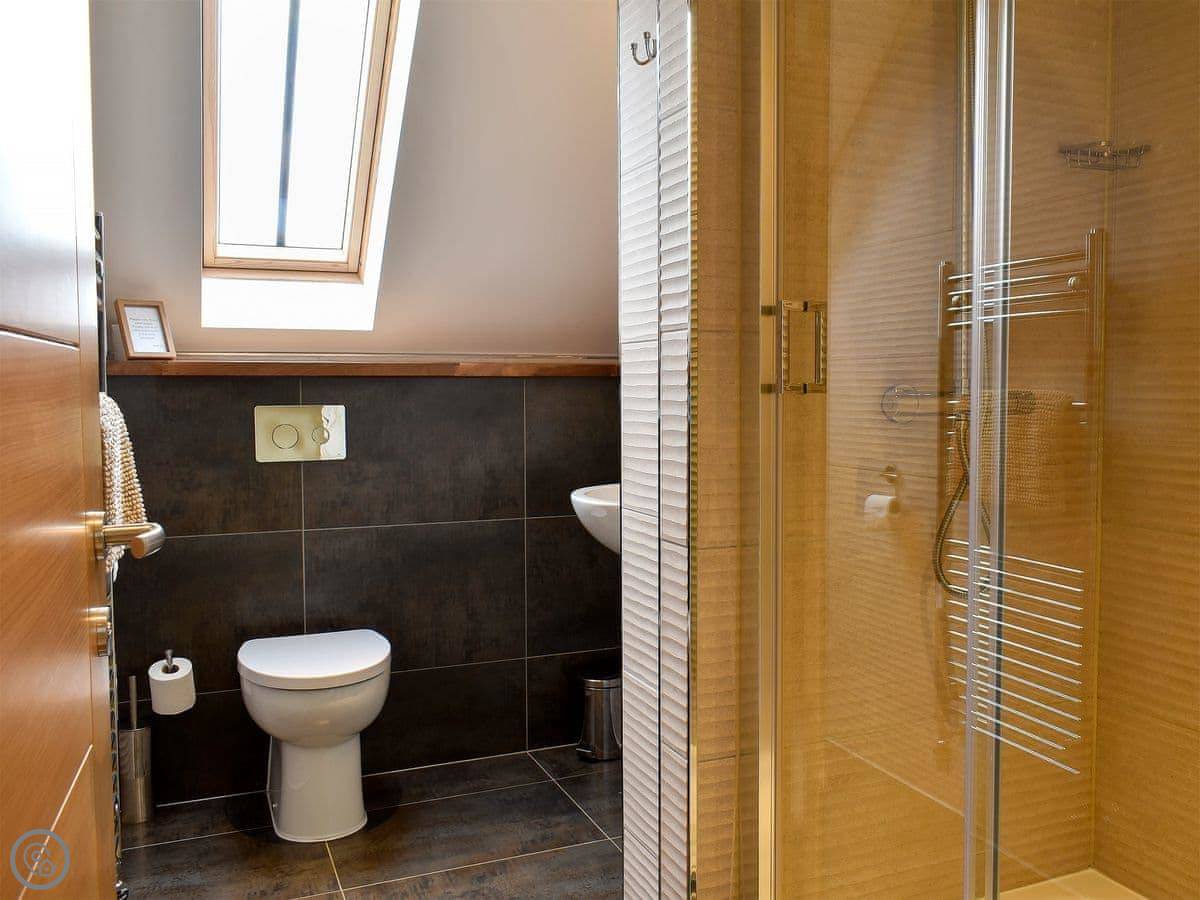 It sleeps four, in two bedrooms. Both bedrooms have their own bathroom. One is a wet room on the ground floor. The doorways are wide and there's no step at the front door, so it works if you have a wheelchair user or someone with limited mobility. The kitchen is open plan with the living area. There's a wood burner. Heating is from a ground source heat pump, so it's efficient, but the wood burner is there if you want the atmosphere.