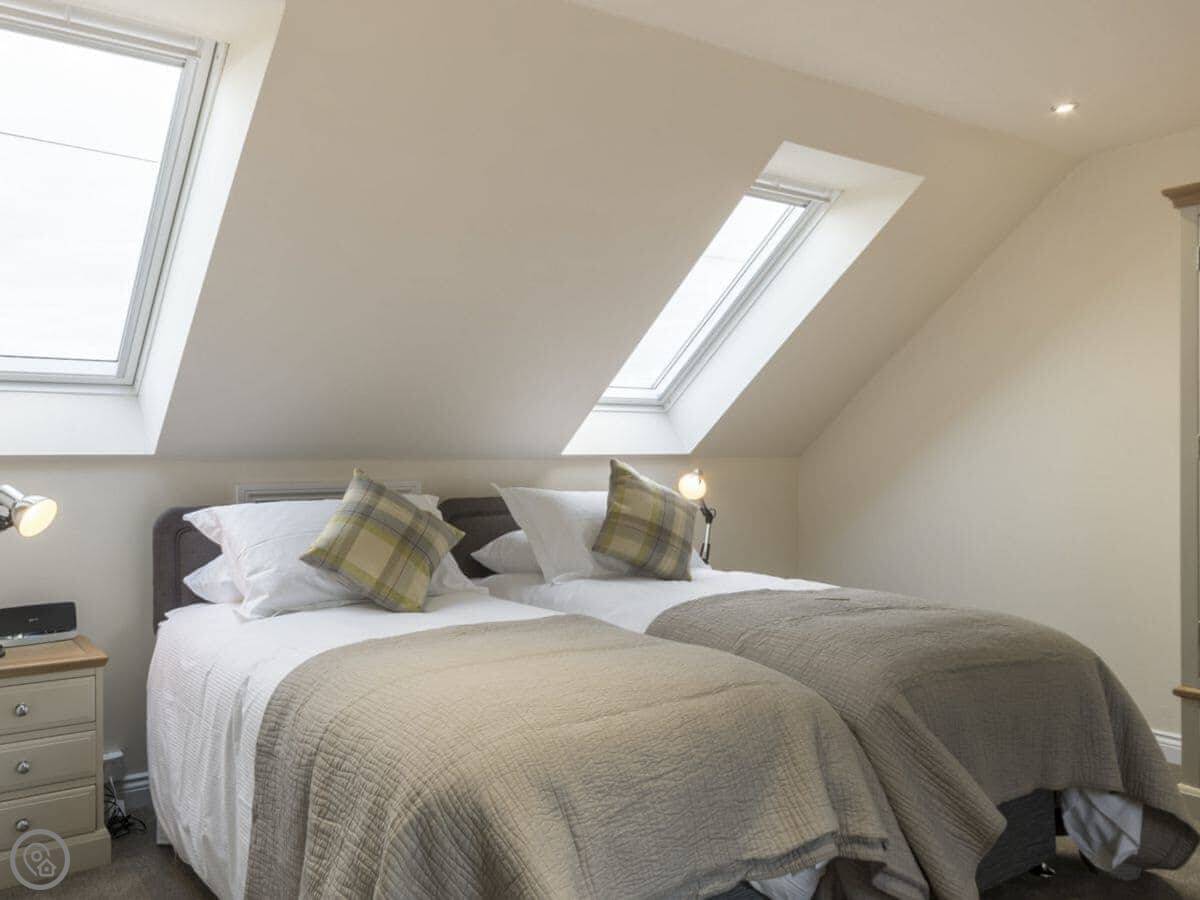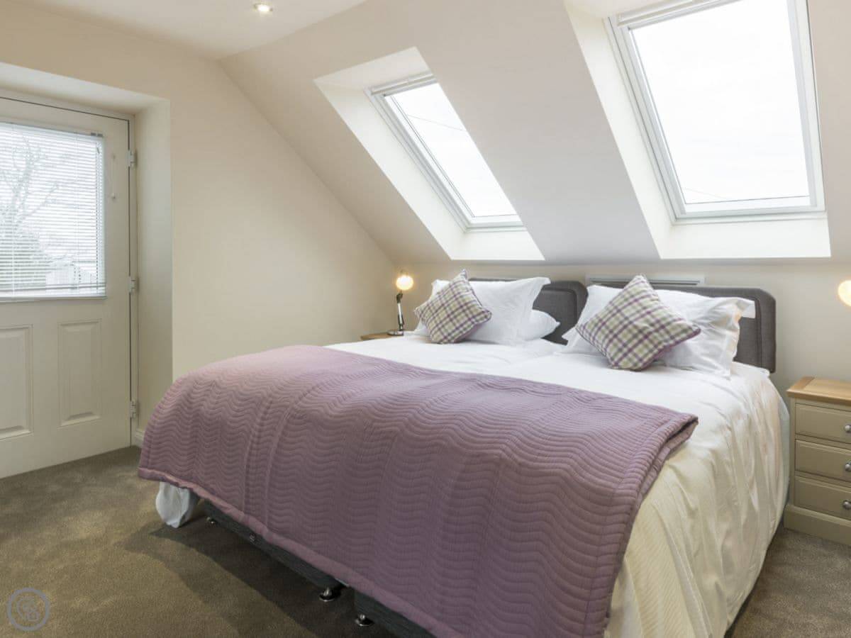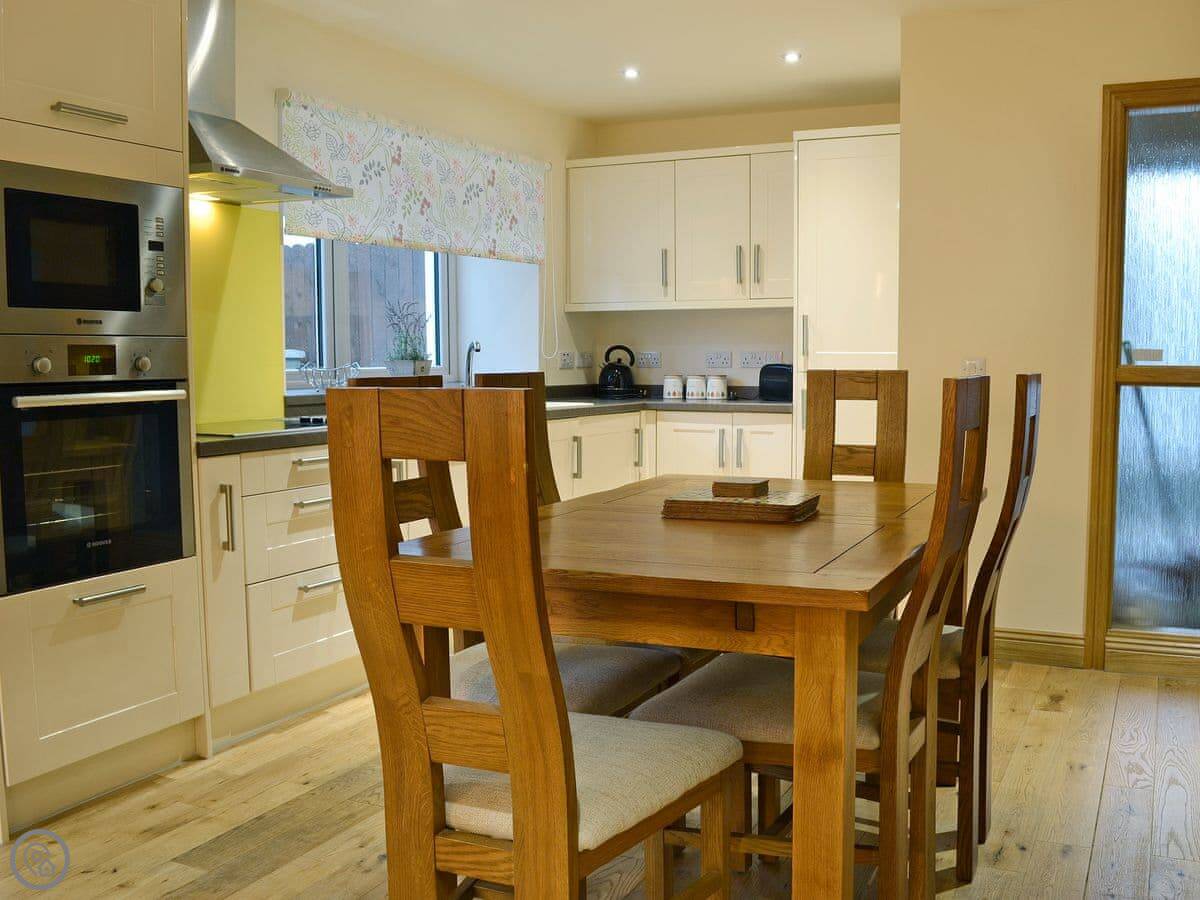 It sleeps six, with three bedrooms and two bathrooms. The rating is 5 Star, which means it's well kitted out and comfortable. The living area is open plan. Because it's a converted barn, the ceilings are quite high and the rooms feel spacious.