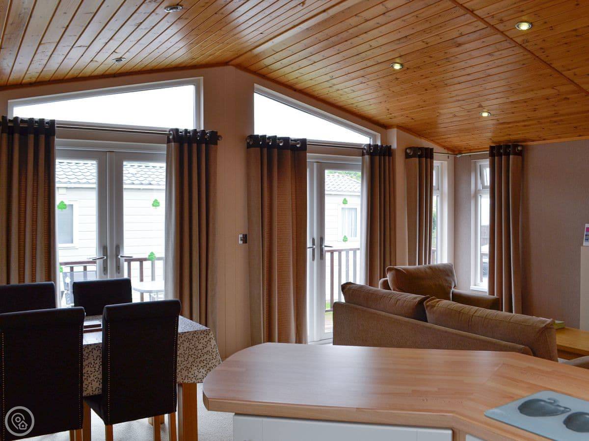 Kingfisher Lodge is in Hopton on Sea, which is right on the Norfolk and Suffolk border. It's a detached wooden lodge. You get the bit of garden around it to yourself. There's a patio with a table and chairs. It's set back from the main road so it's quiet.