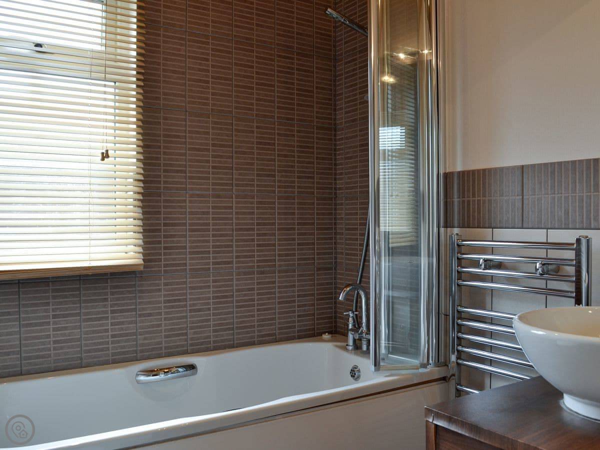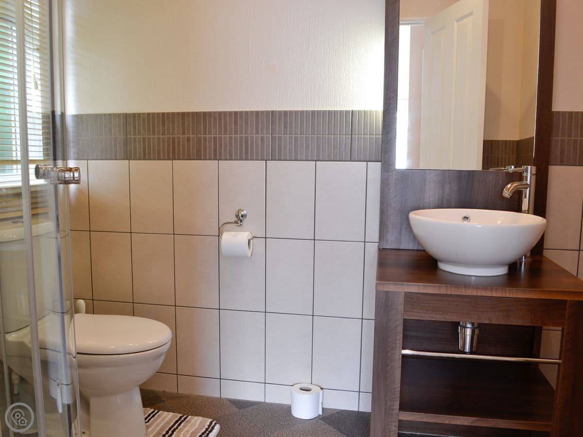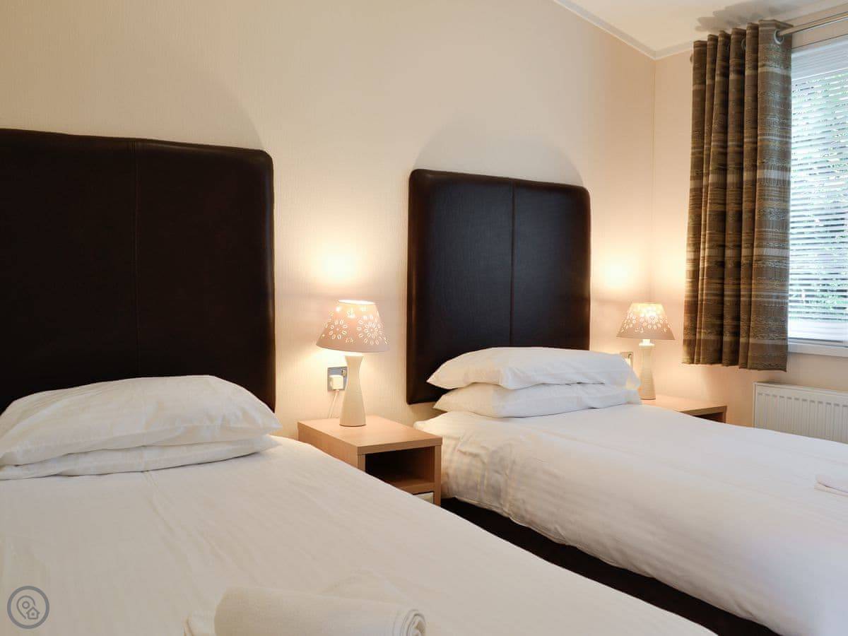 It sleeps four. Two bedrooms, both doubles, and two bathrooms, both with showers. It's got a 4 Star rating, so it's comfortable and well-equipped. The heating is electric and easy to control.