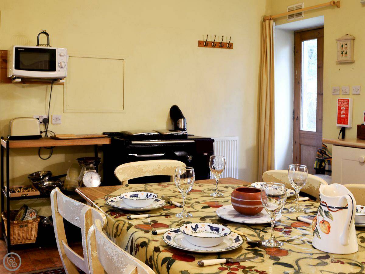 The kitchen has a Rayburn. It's always on, so it keeps the whole place warm. The living room is upstairs to get the best of the view. It's a big, light space with a wood burner at one end and some bookshelves at the other. The patio outside gets the sun most of the day.