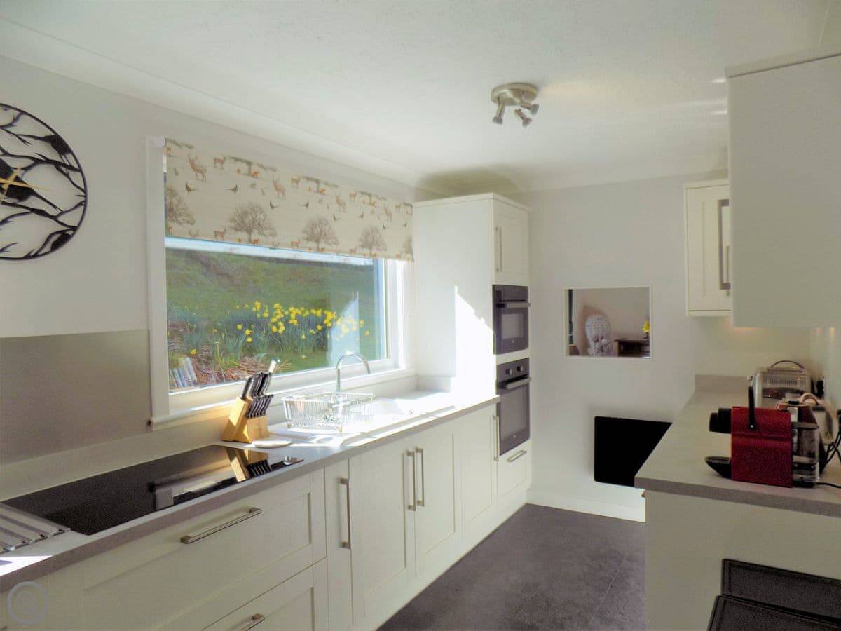Inside, it's got a woodburning stove for colder days. There's a dishwasher and a washing machine. We leave some basics like tea, coffee, and washing up liquid. You can get supermarket deliveries if you need them. Bedding and towels are included. We allow up to two dogs.