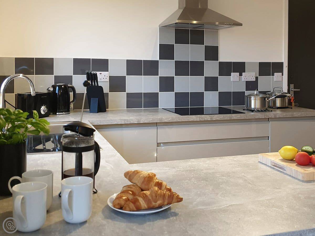 For facilities, it’s got what you’d expect: a washing machine, dishwasher, WiFi, TV. Bedding and towels are included. There’s parking on the drive. Pets aren’t allowed, sorry.