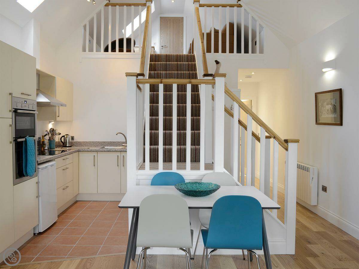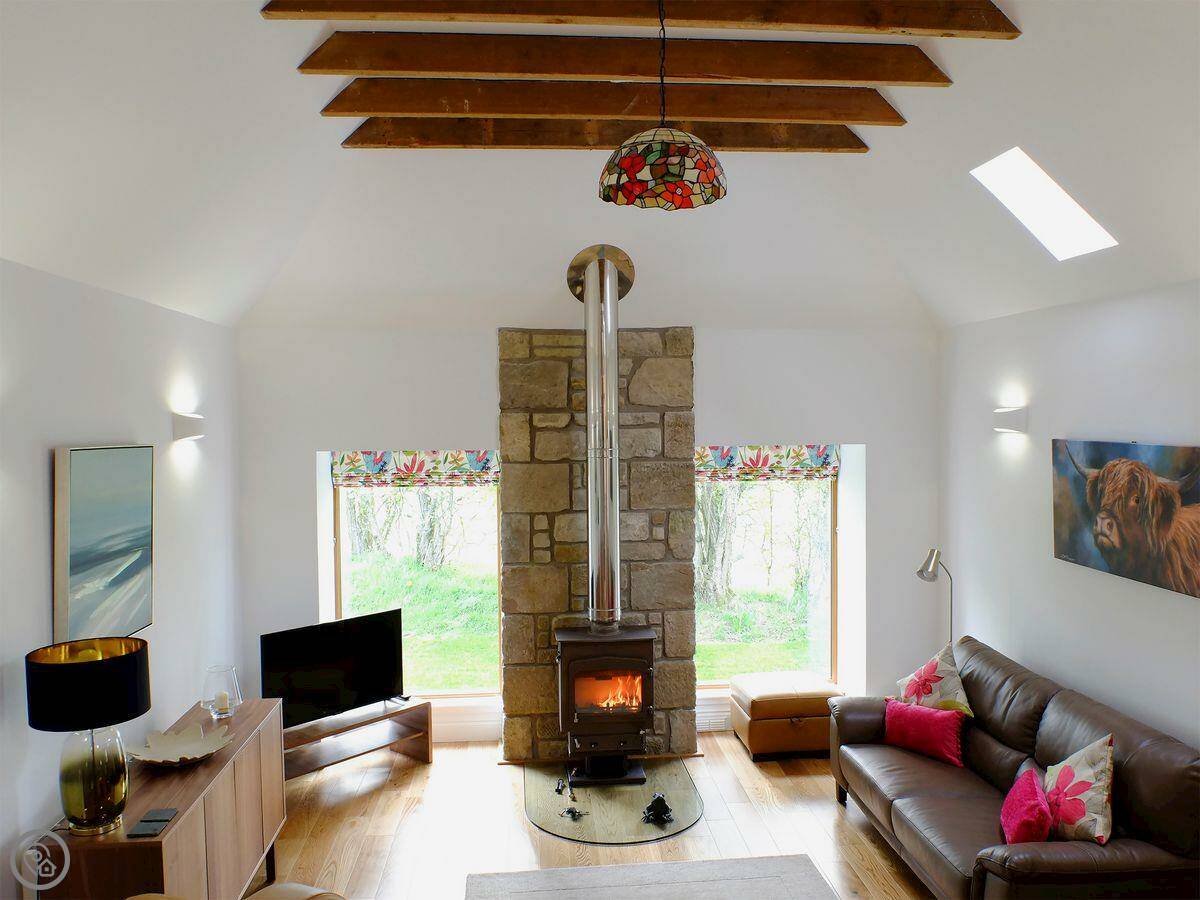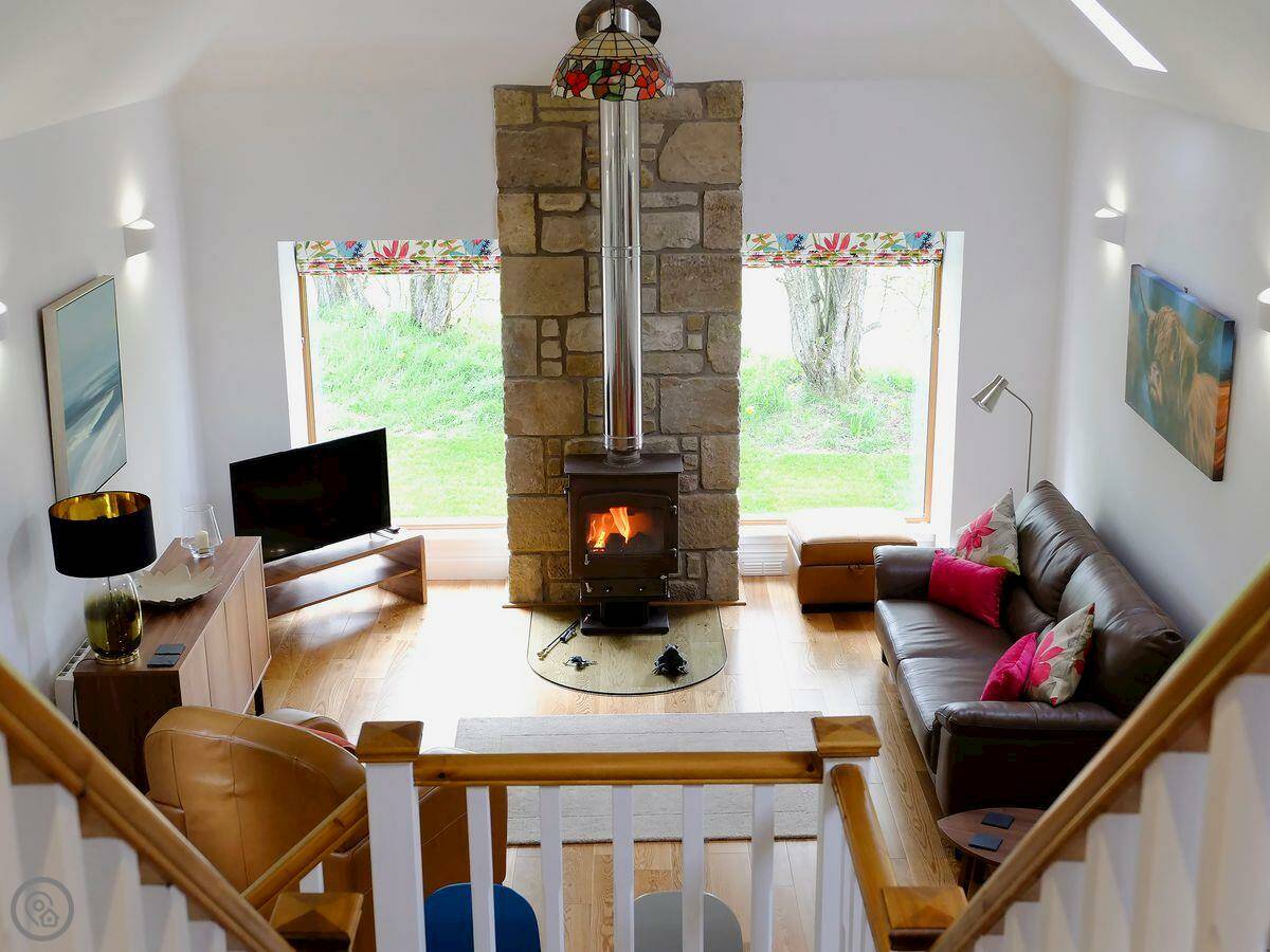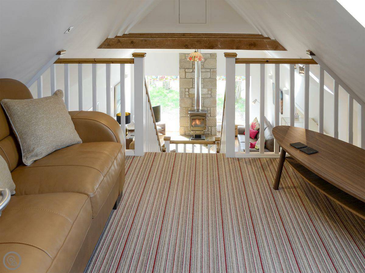 The main room downstairs is the old barn space, so the ceilings are high and there are oak beams. It's open plan. There's a wood burner, which we provide some logs for to get you started. Stairs go up to a mezzanine floor, which is a second sitting area that can also be a bedroom. It has a sofa bed.