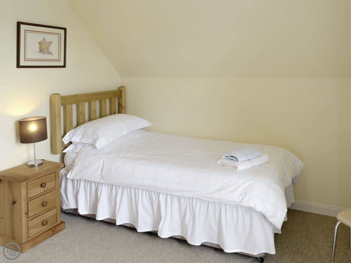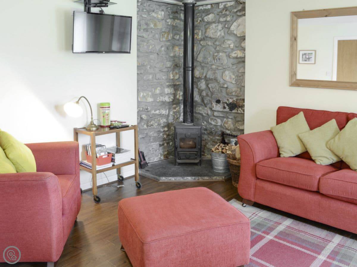 It sleeps four people. Two bedrooms upstairs and one bathroom. It's got a 4 Star rating, which is good. It's comfortable and clean. The living area is open plan with a wood burner in the corner. The kitchen is fine for holiday cooking.