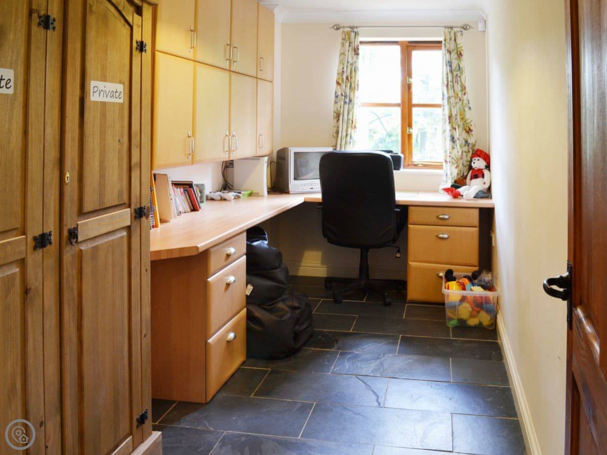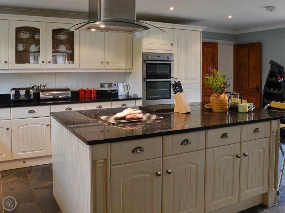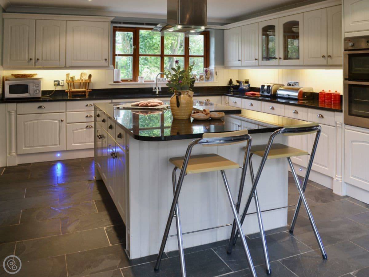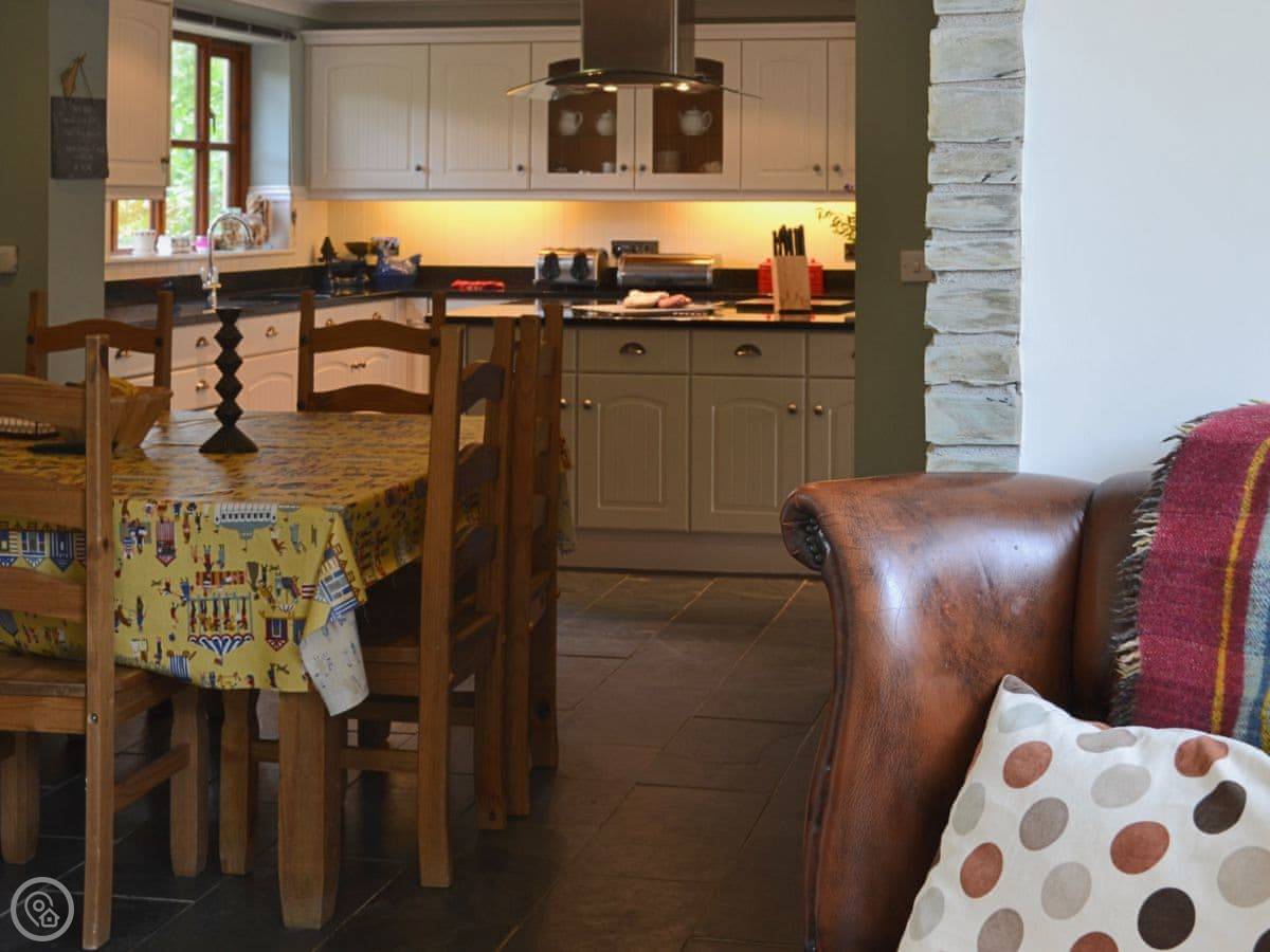 Inside, it's spacious. The main living area is a big kitchen, dining room and sunroom all together. That's where everyone tends to end up. There's a separate living room with a woodburner and good views. There's also a study with games and a console, which is popular. There's a dishwasher and a washing machine.