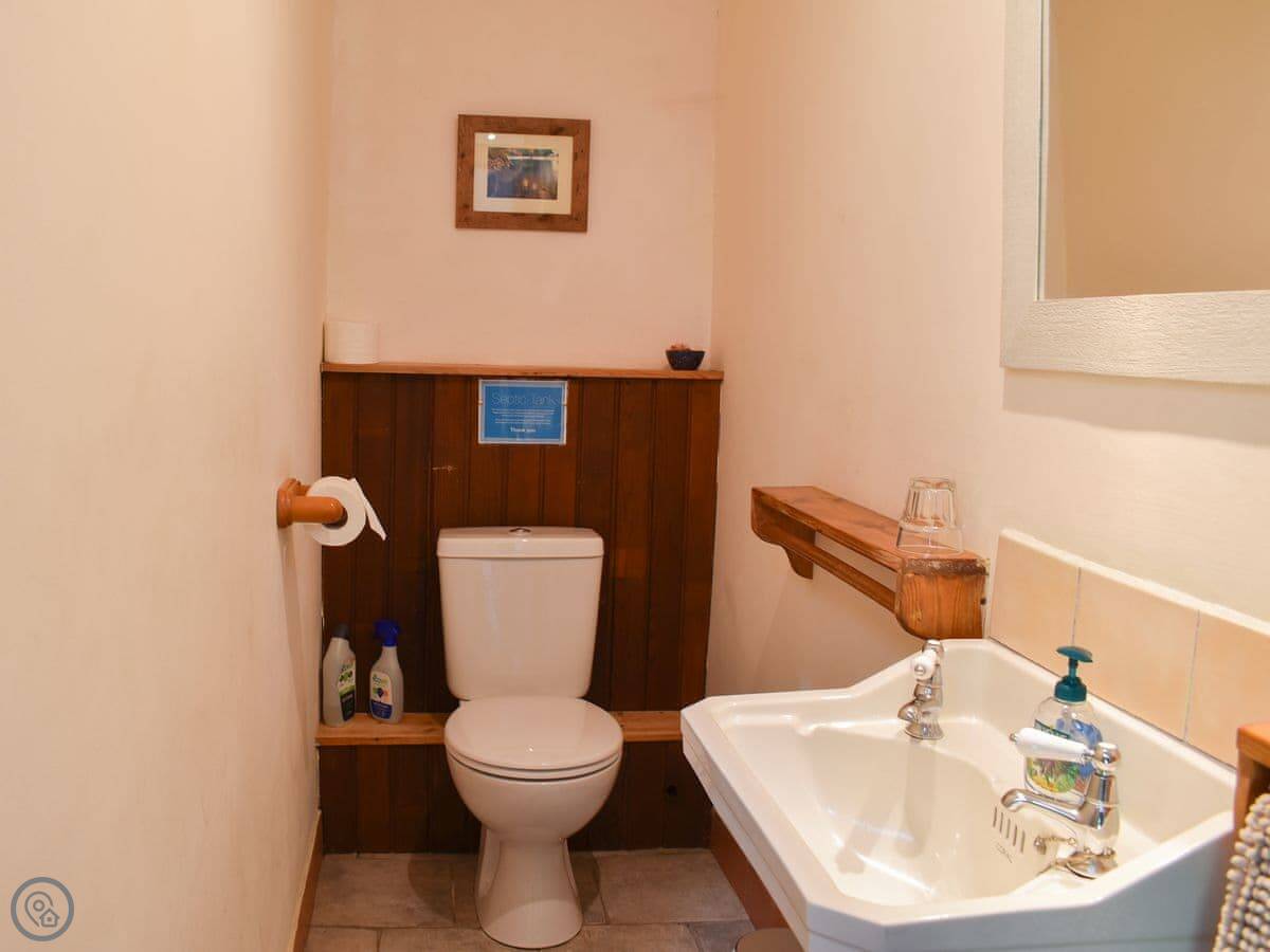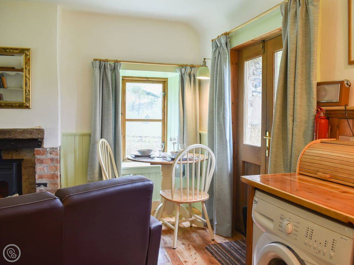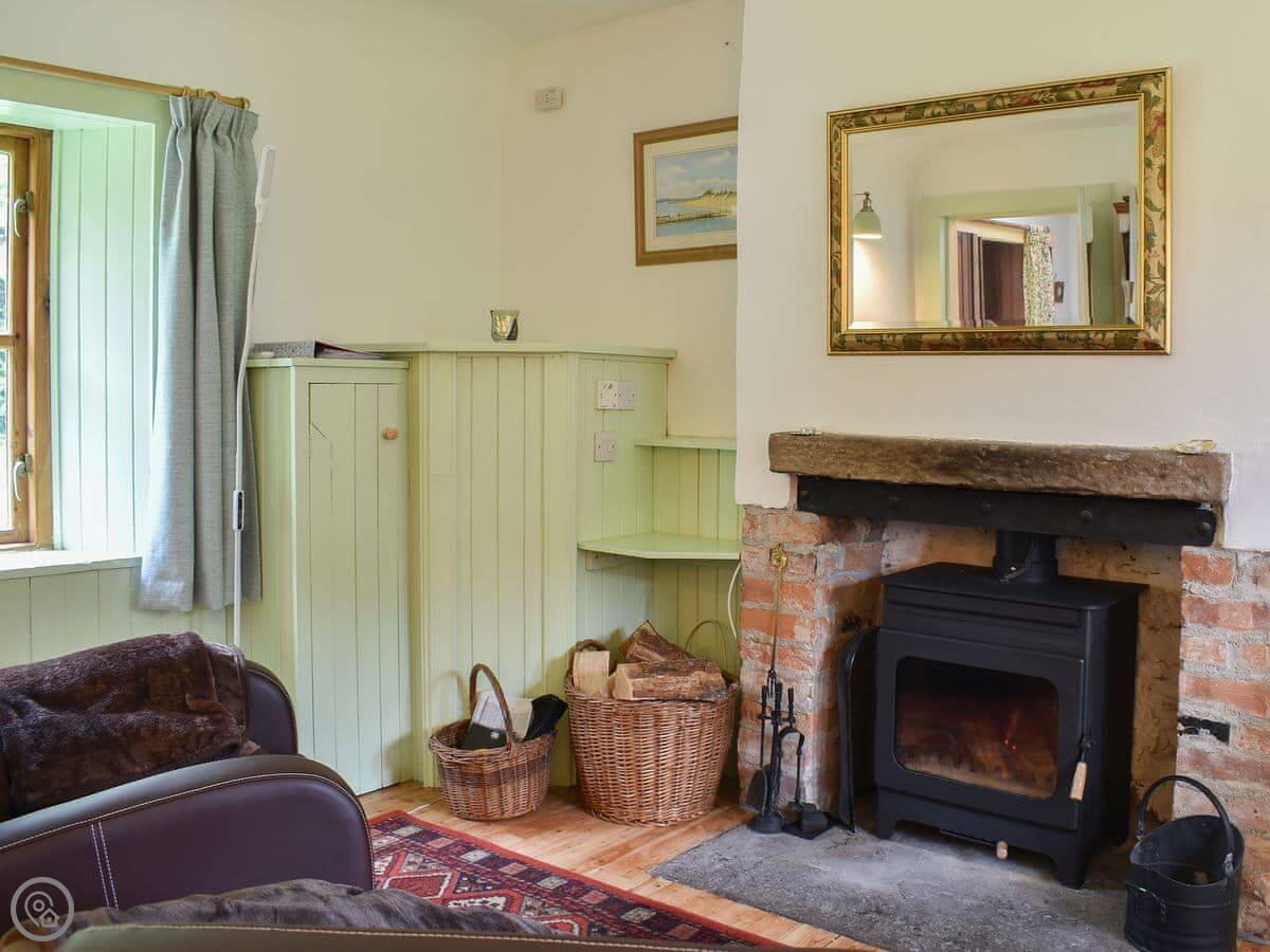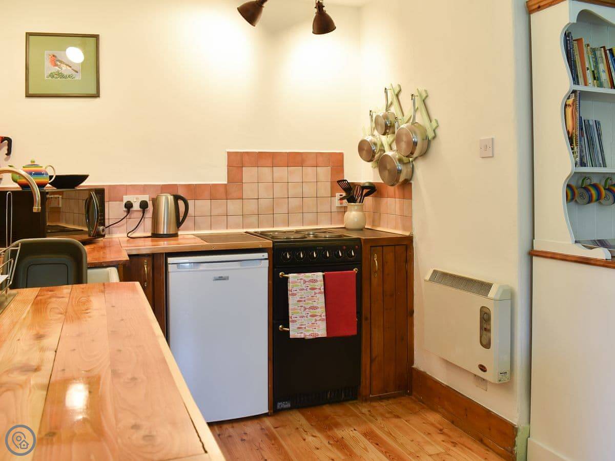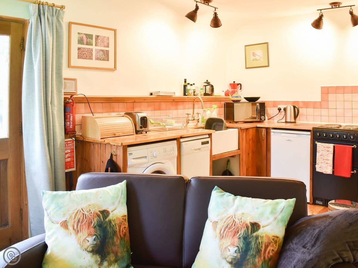 Inside, it's got a woodburning stove, which is good. There's a dishwasher and a washing machine. The bedding and towels are included. The garden is enclosed, so it's fine for dogs. You can bring two.