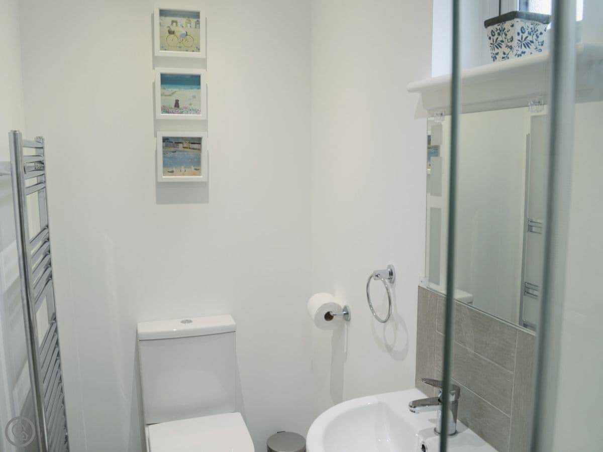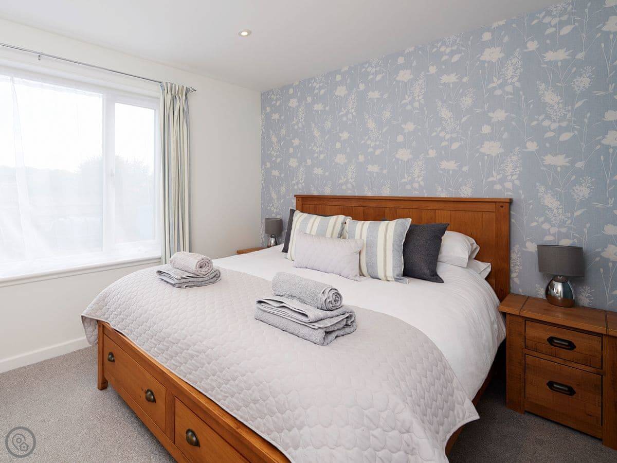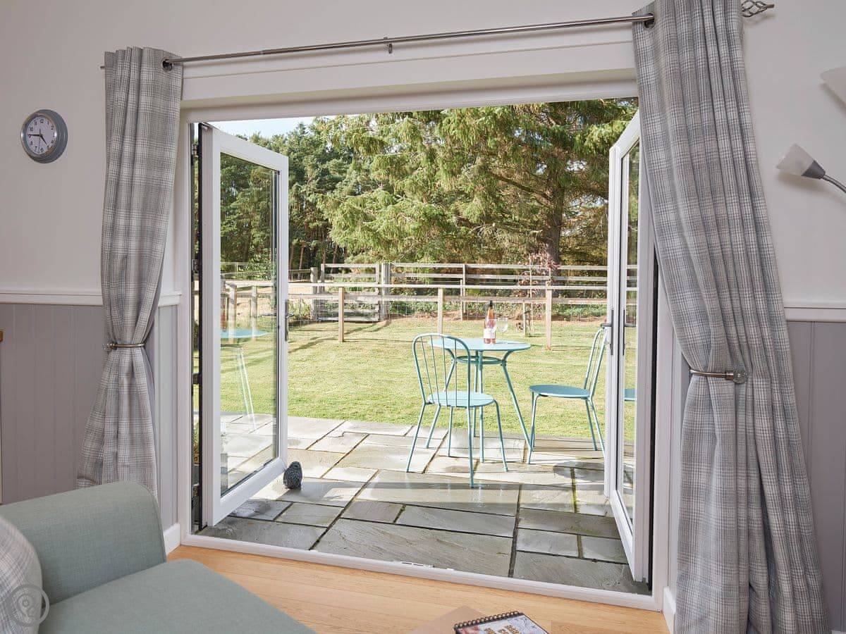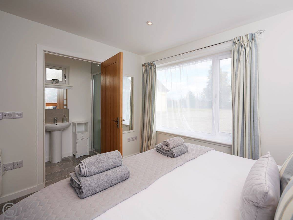 It's for two people. One bedroom with a kingsize bed and an en-suite shower room. It's got a 4 Star rating. It's bright and tidy inside, comfortable. The main room has French doors that open out onto a patio with some lawn.