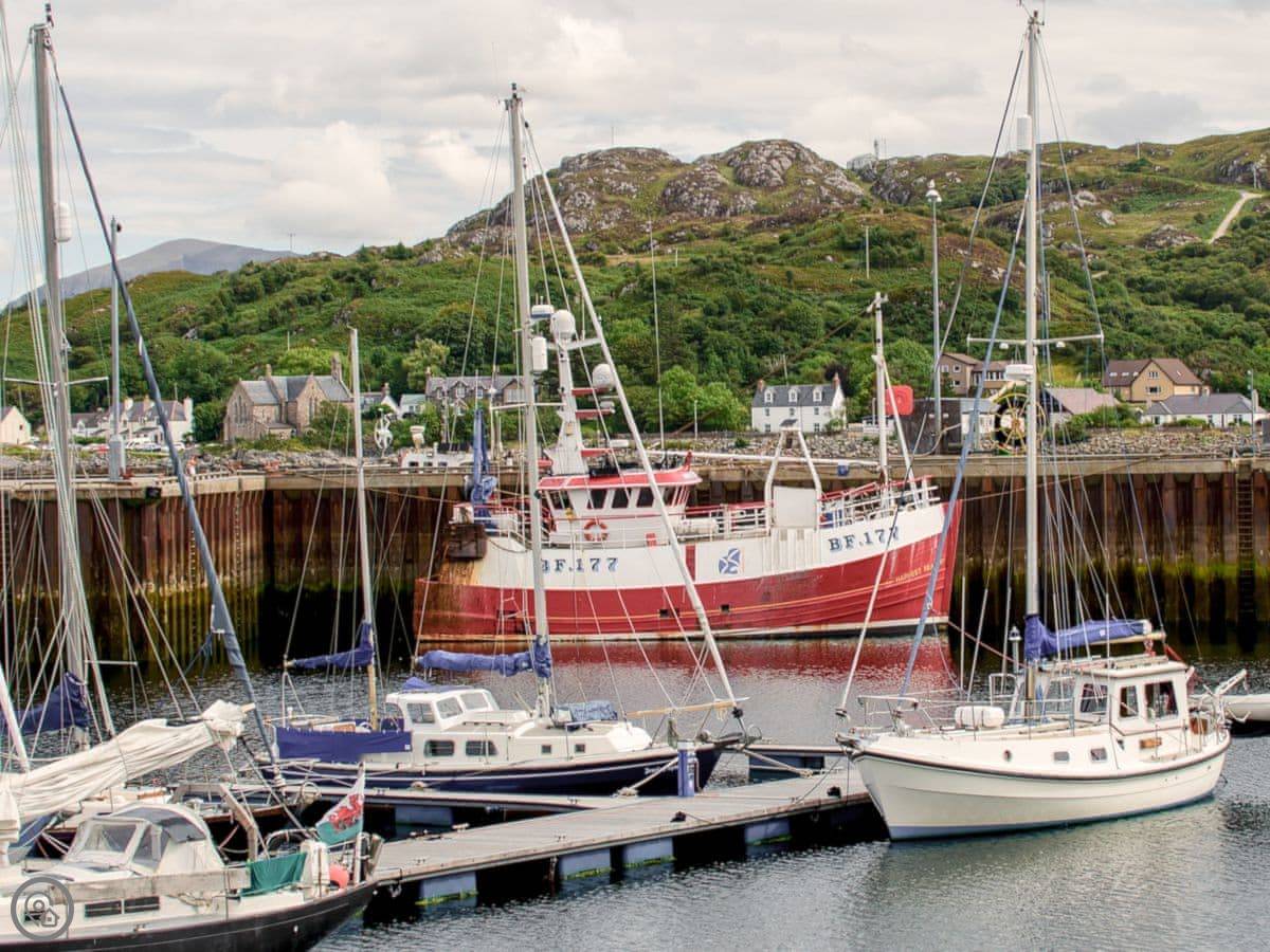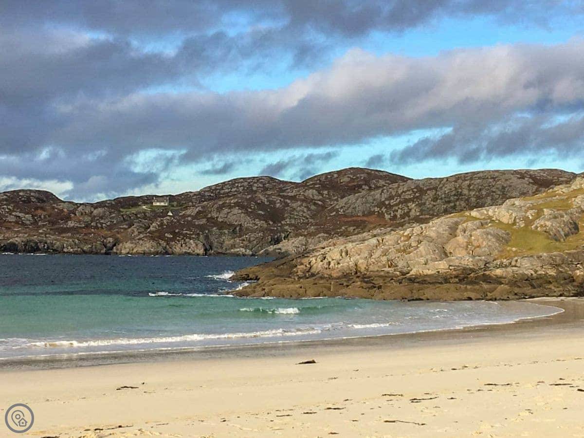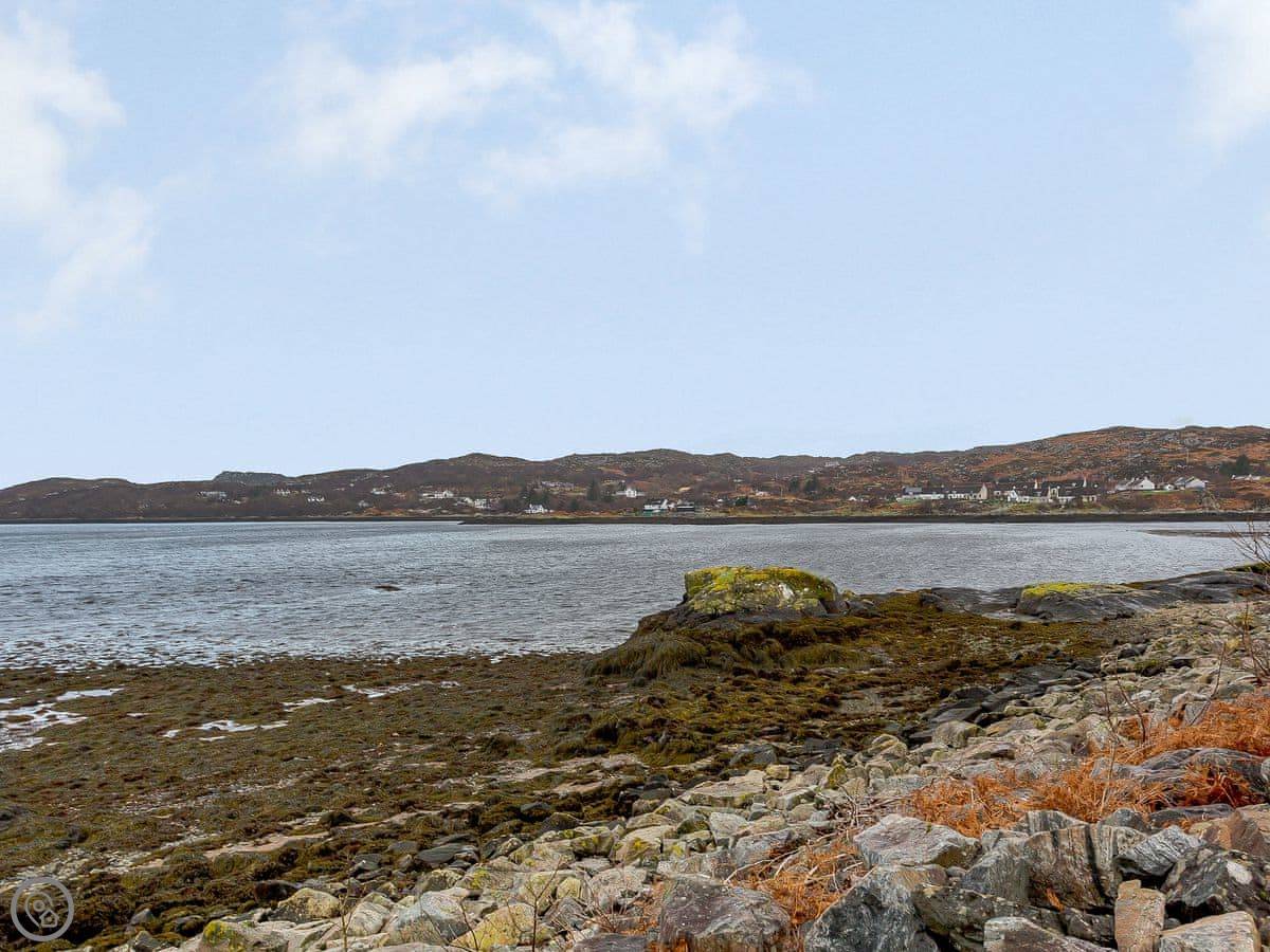 You're right in the village. The pubs, a couple of restaurants, and the shops are about a two-minute walk. The harbour's there too. For a really good beach, Achmelvich is about ten minutes' drive. It's white sand.