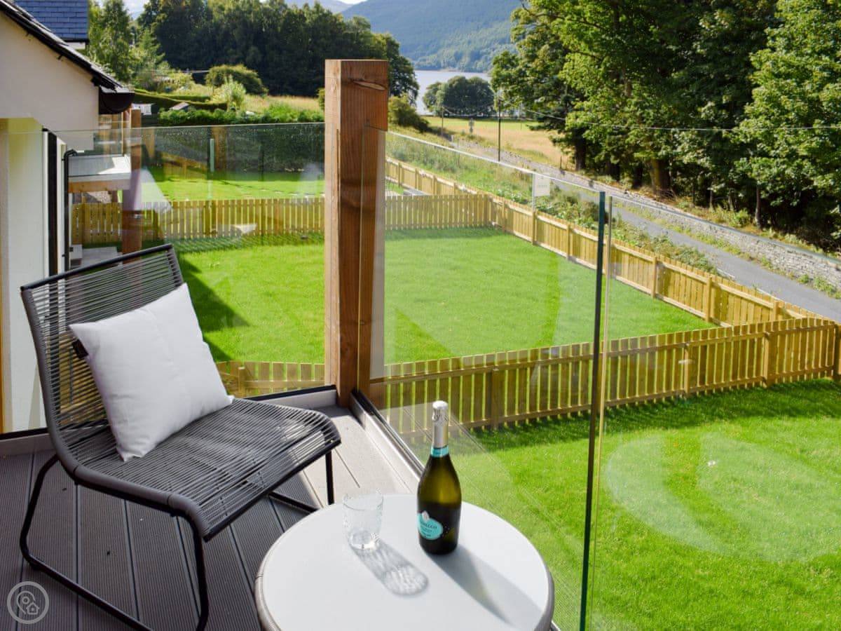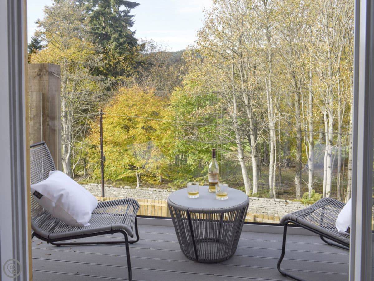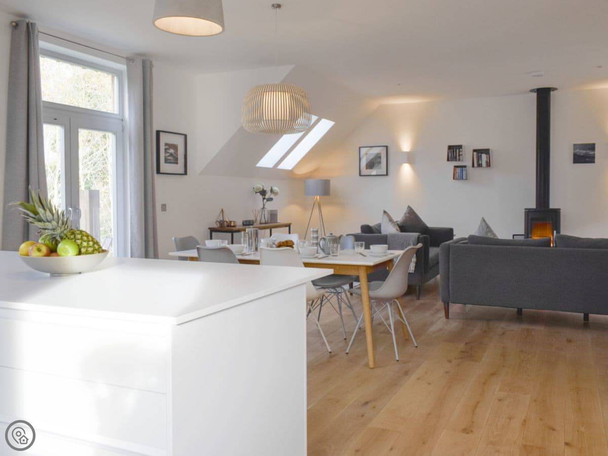 You enter on the first floor into the main living area. It's all open plan, with a wood burner. Patio doors open onto a balcony at the front for the view, and a terrace at the back for morning sun. Downstairs on the ground floor there's a utility room for boots and coats, plus the bedrooms.