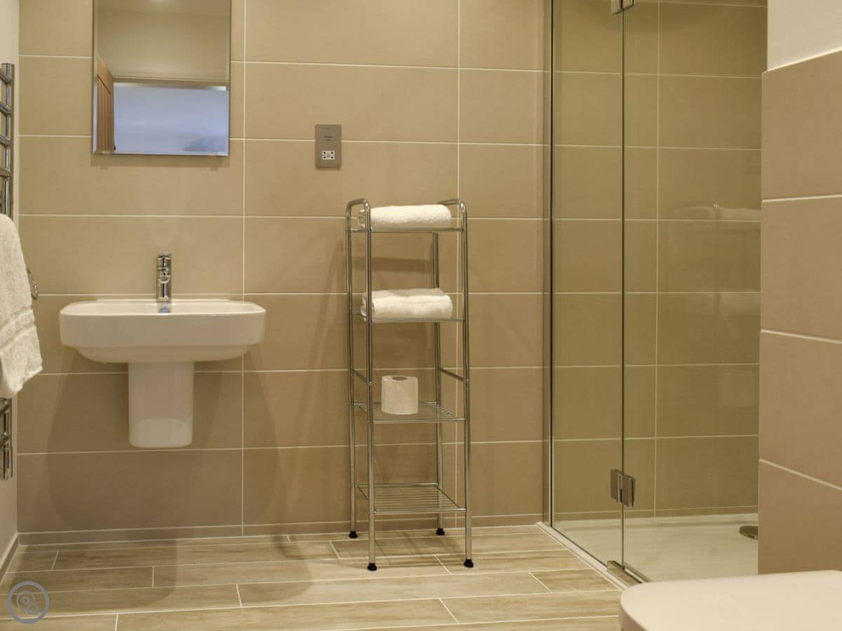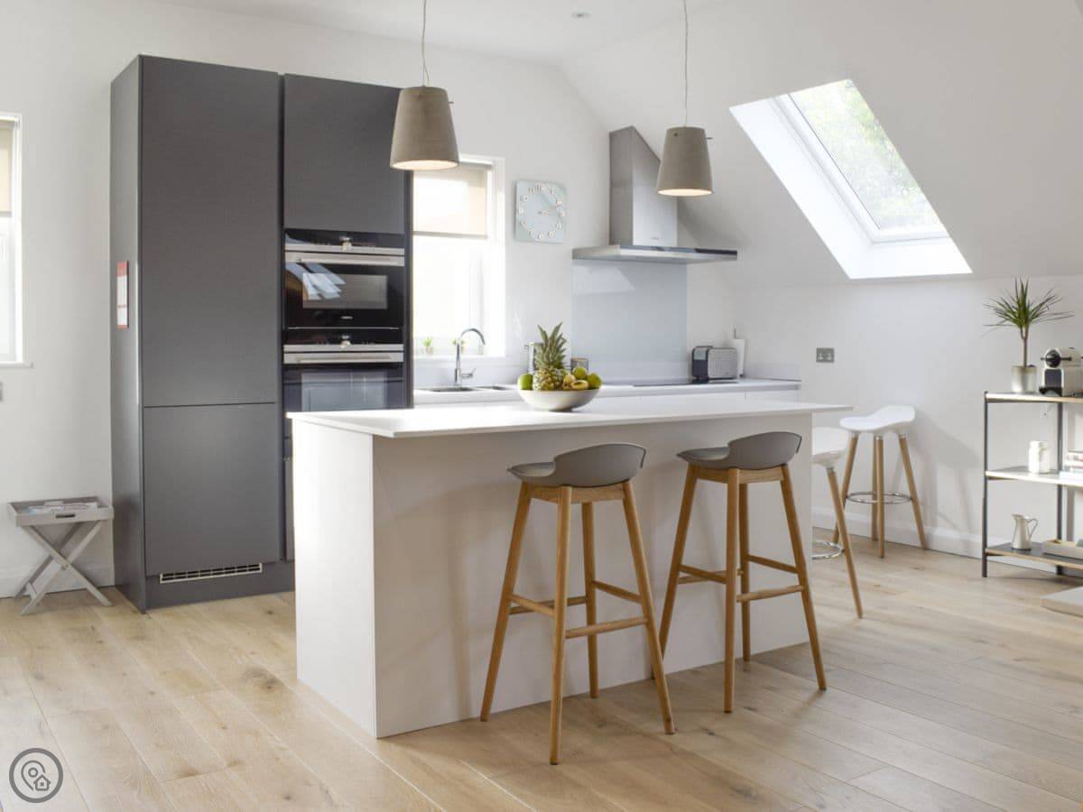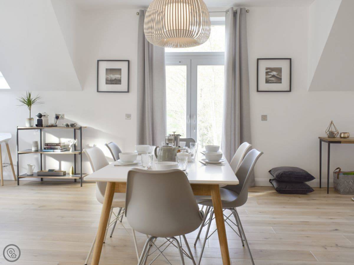 You enter on the first floor into the main living area. It's all open plan, with a wood burner. Patio doors open onto a balcony at the front for the view, and a terrace at the back for morning sun. Downstairs on the ground floor there's a utility room for boots and coats, plus the bedrooms.