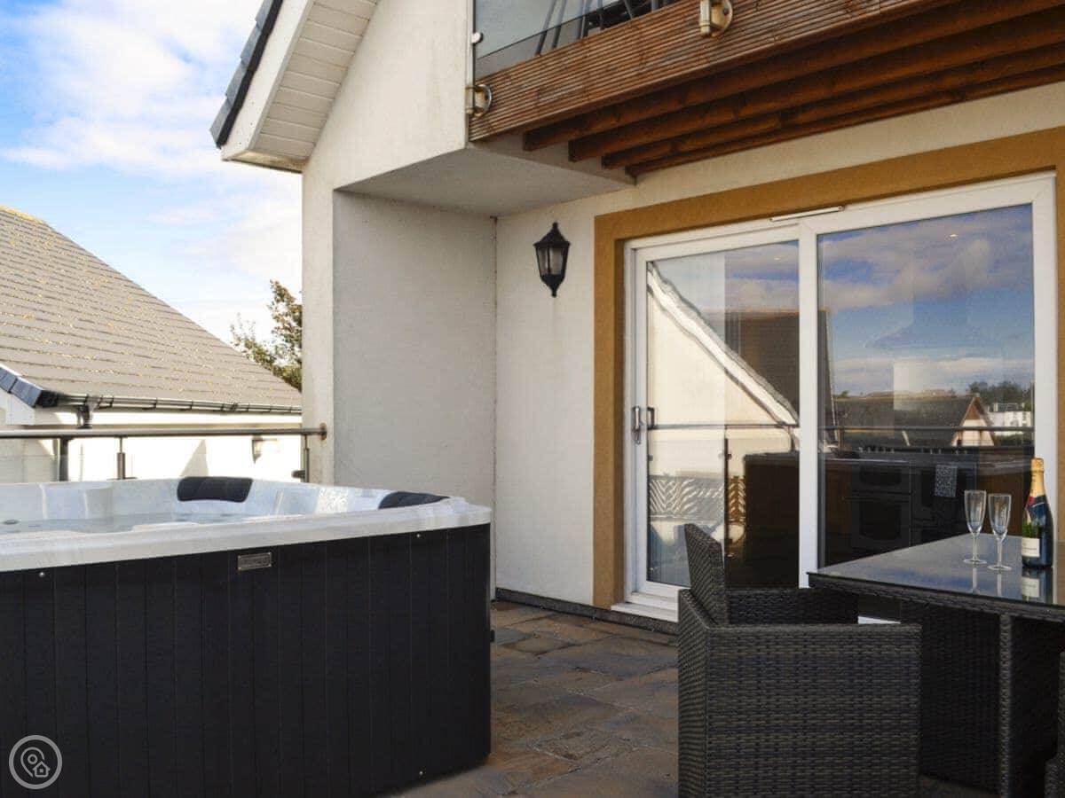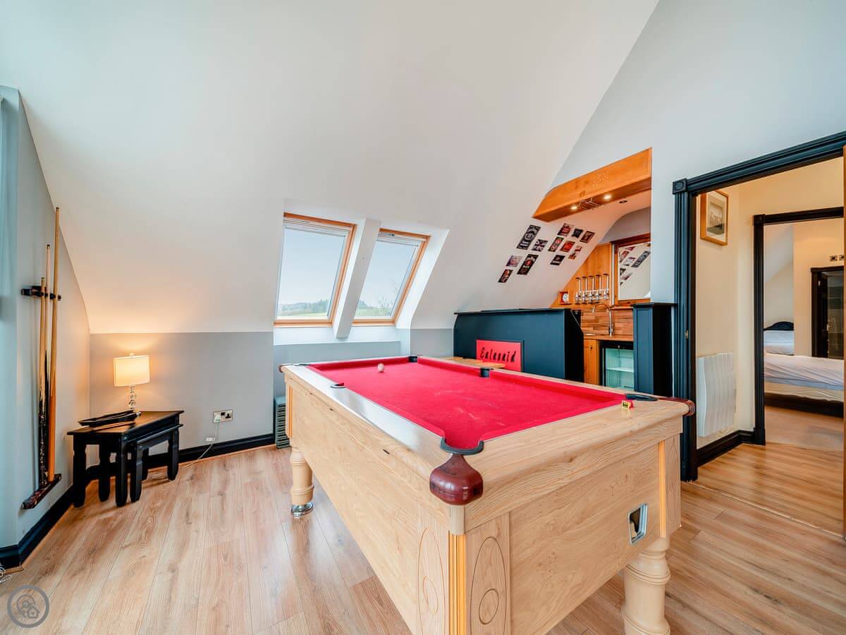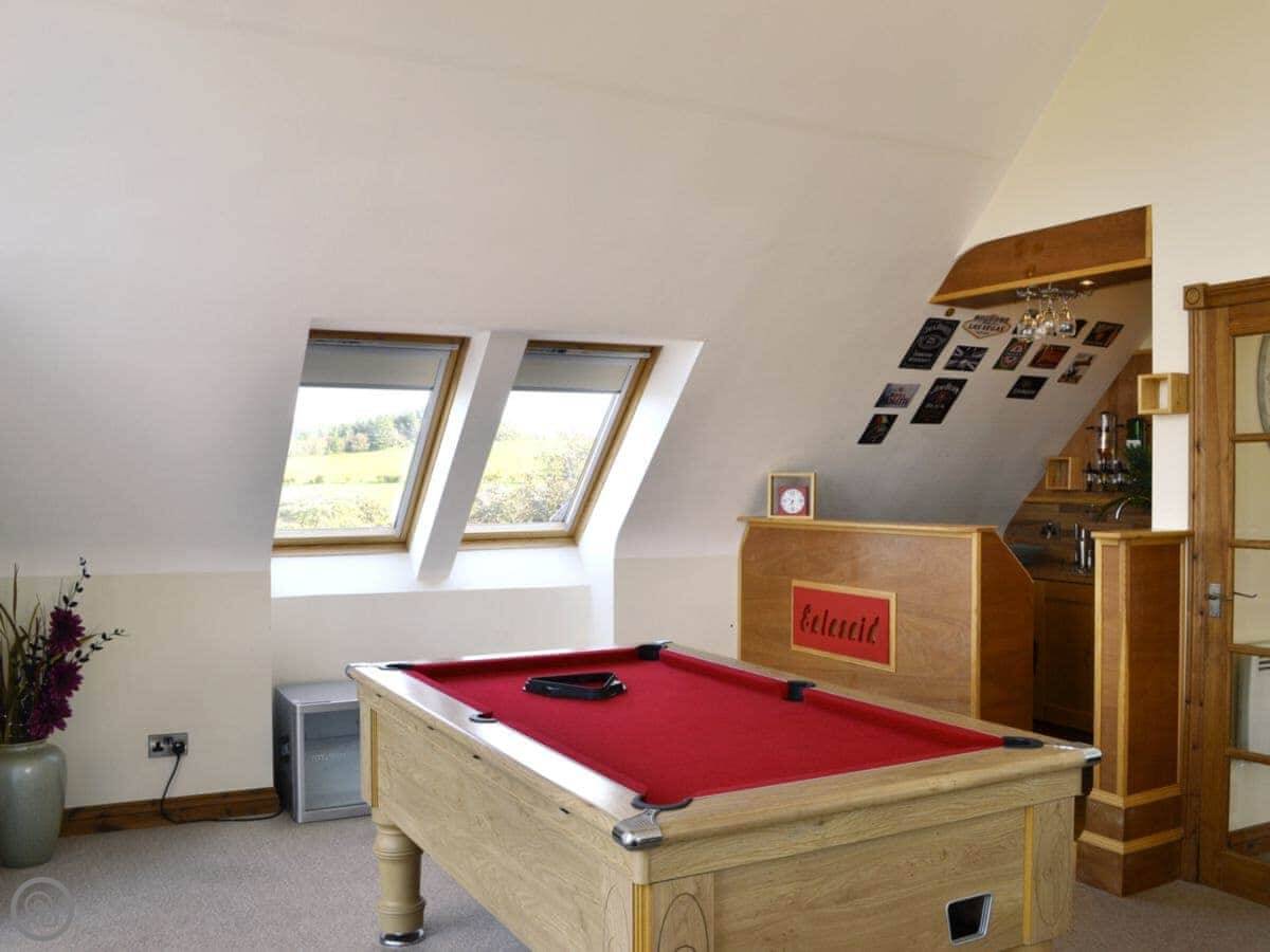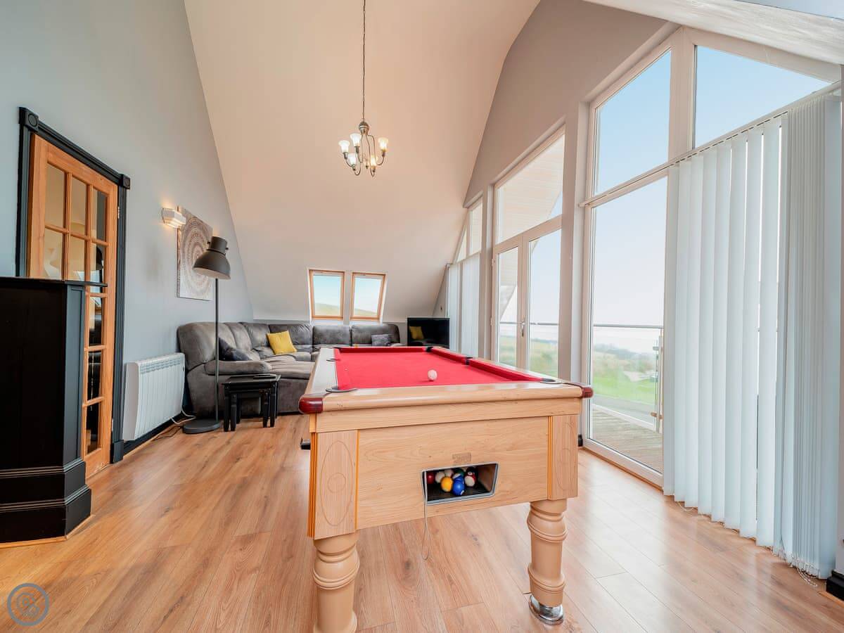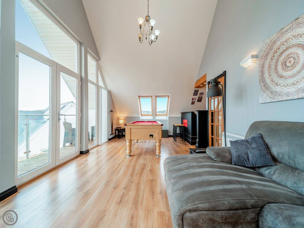 The main quirk is the living room is upstairs. It's a big room with French doors onto a balcony. You get good views over the town and the harbour from there. There's a pool table and a small bar area in that room too. There's a hot tub out the back.