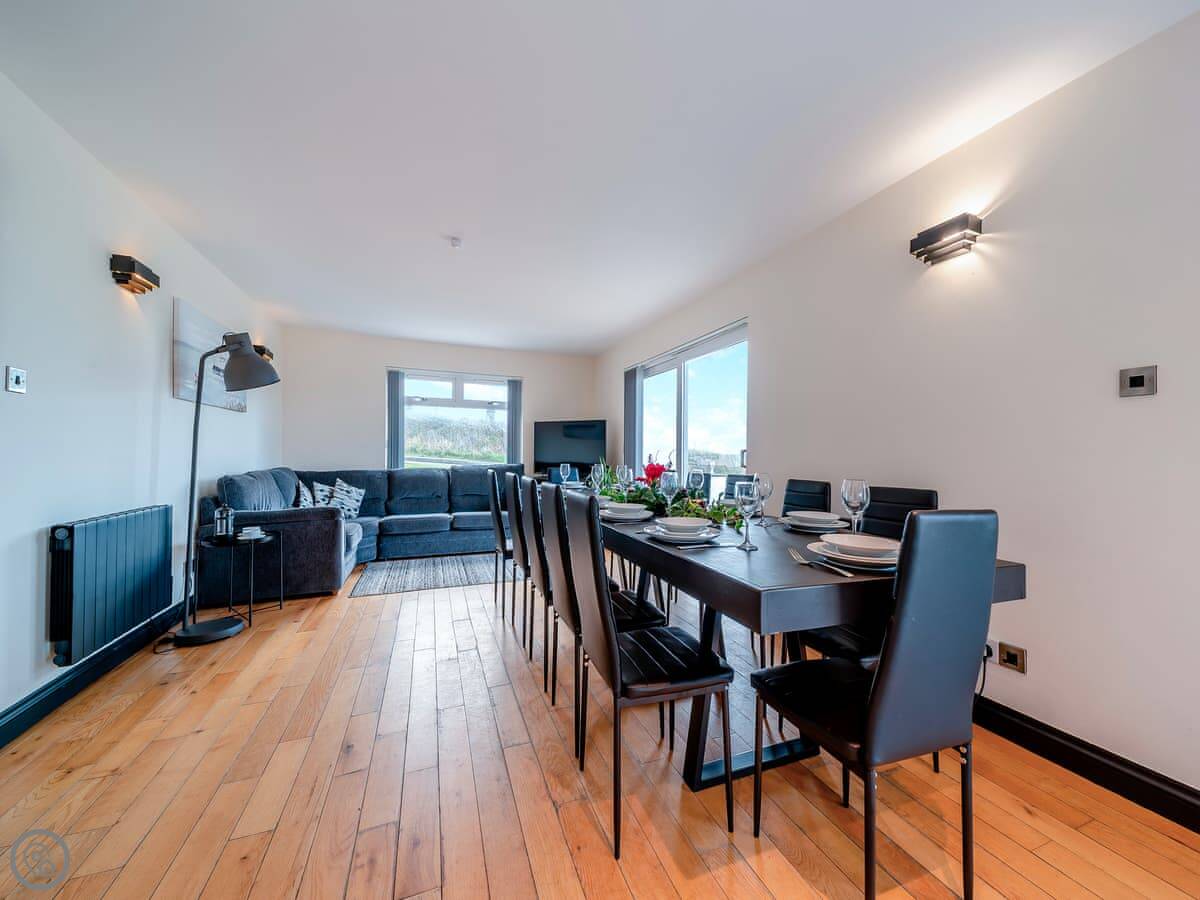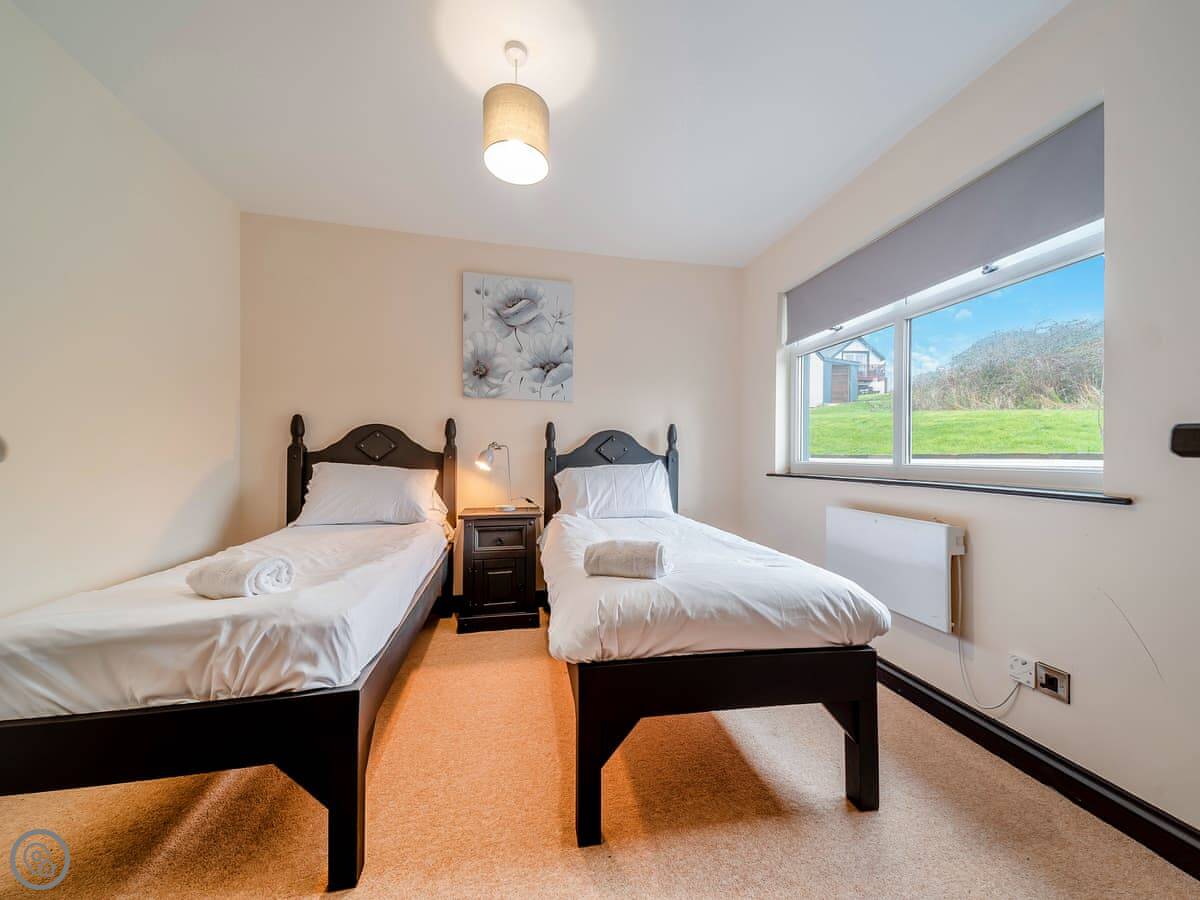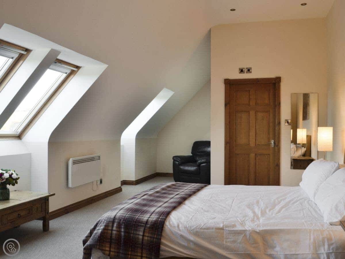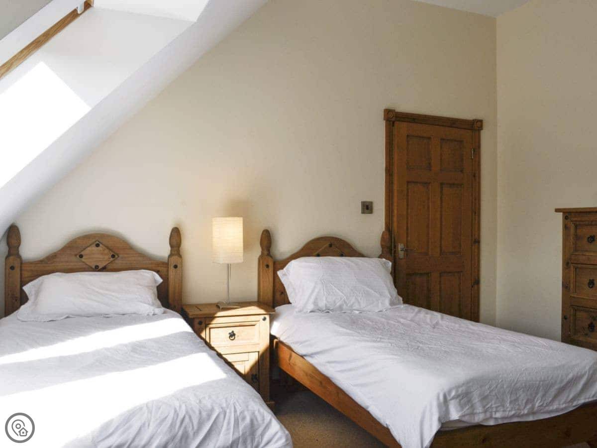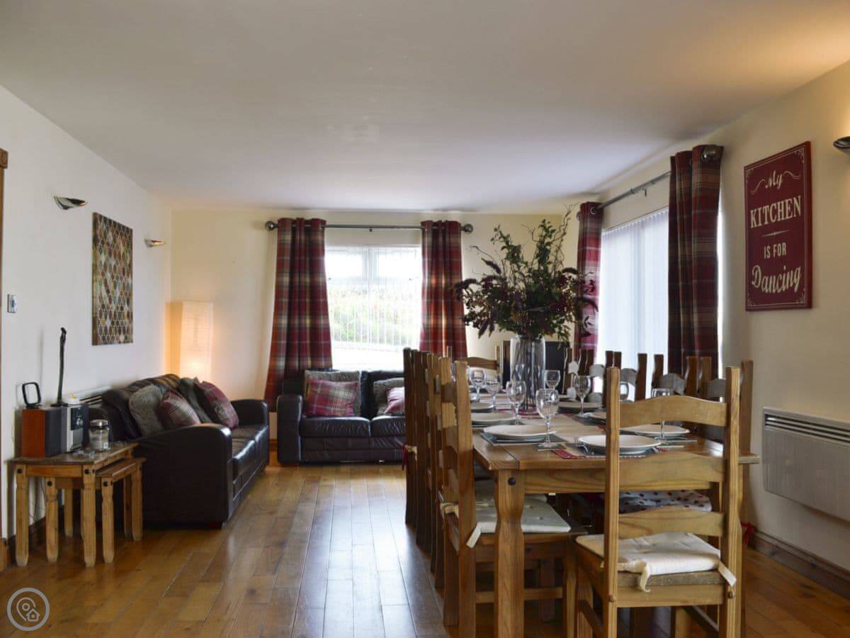 The main quirk is the living room is upstairs. It's a big room with French doors onto a balcony. You get good views over the town and the harbour from there. There's a pool table and a small bar area in that room too. There's a hot tub out the back.
