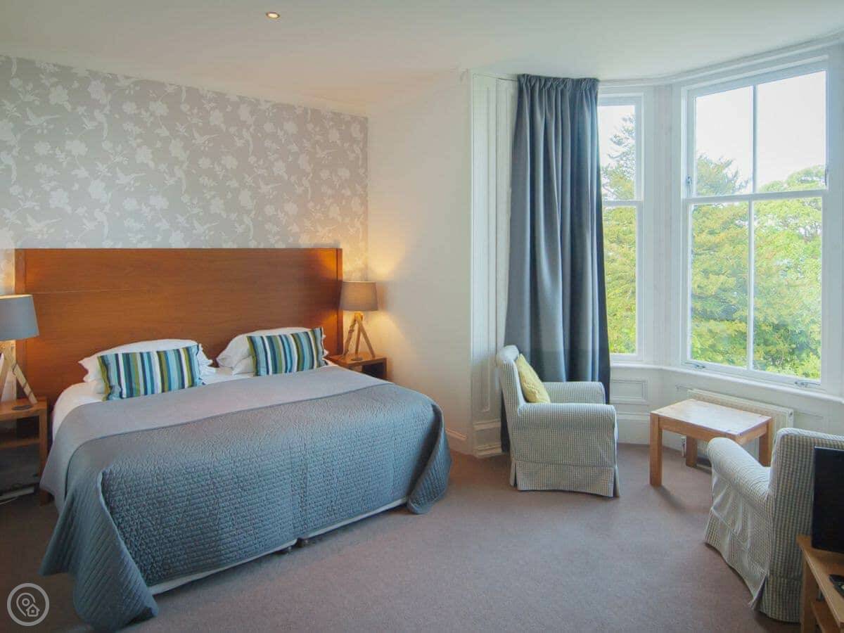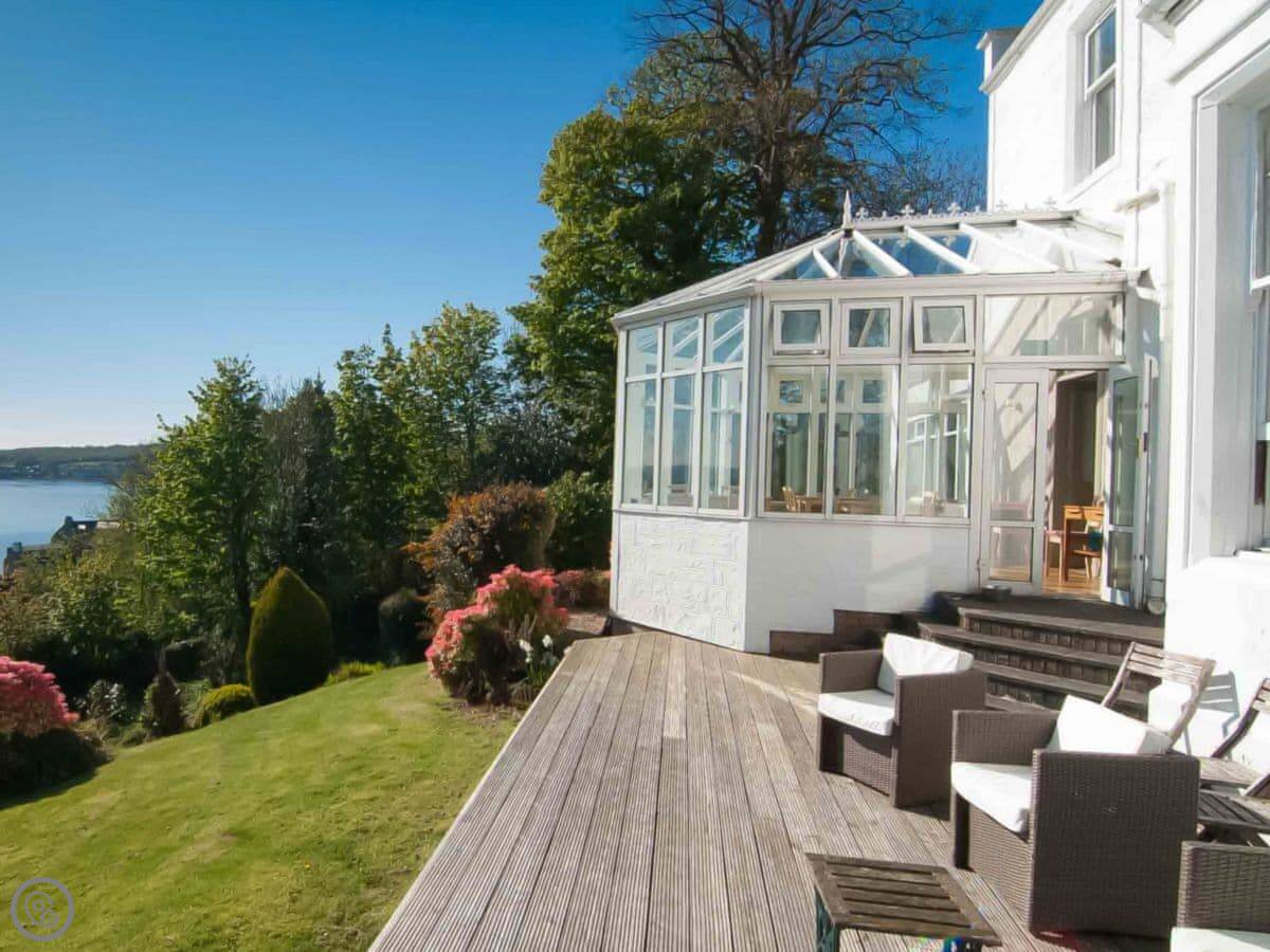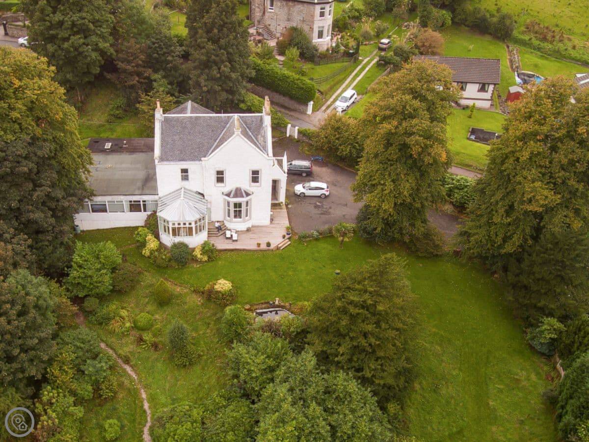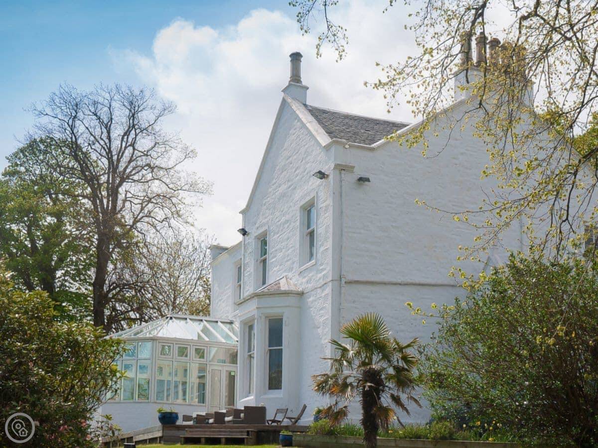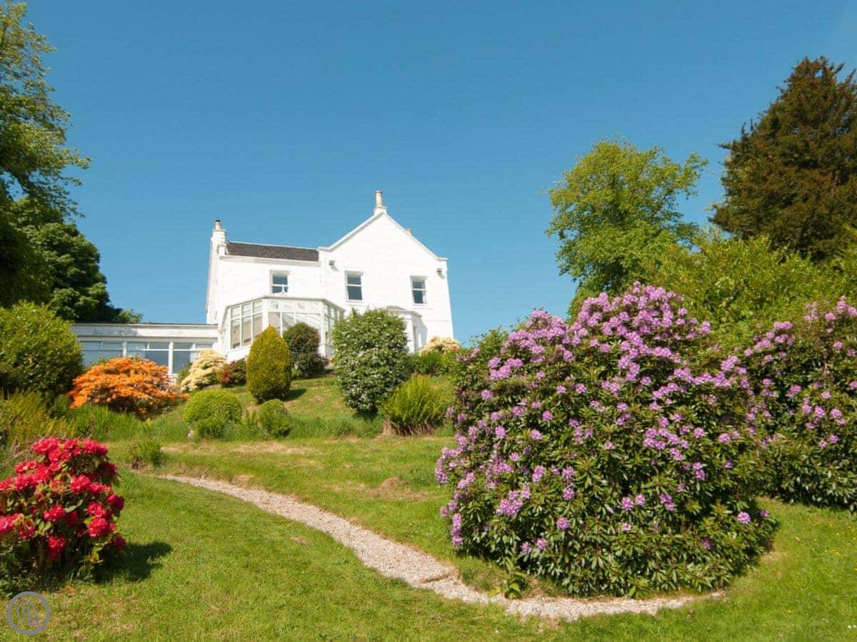 This is Munro's. It's in Port Bannatyne, on the Isle of Bute. It's a big house that sleeps sixteen, eight bedrooms, seven bathrooms. The house is next to where we live, but you've got your own space.