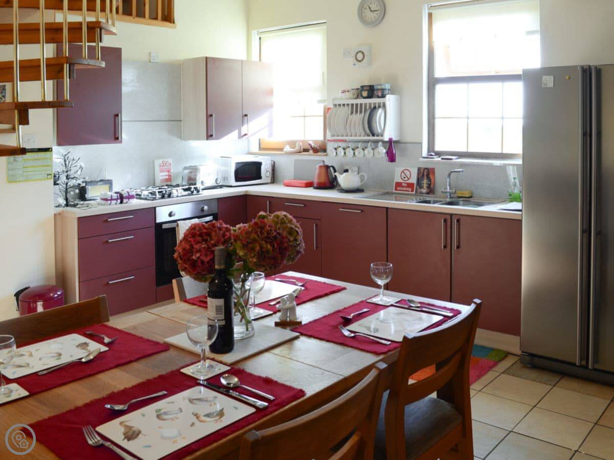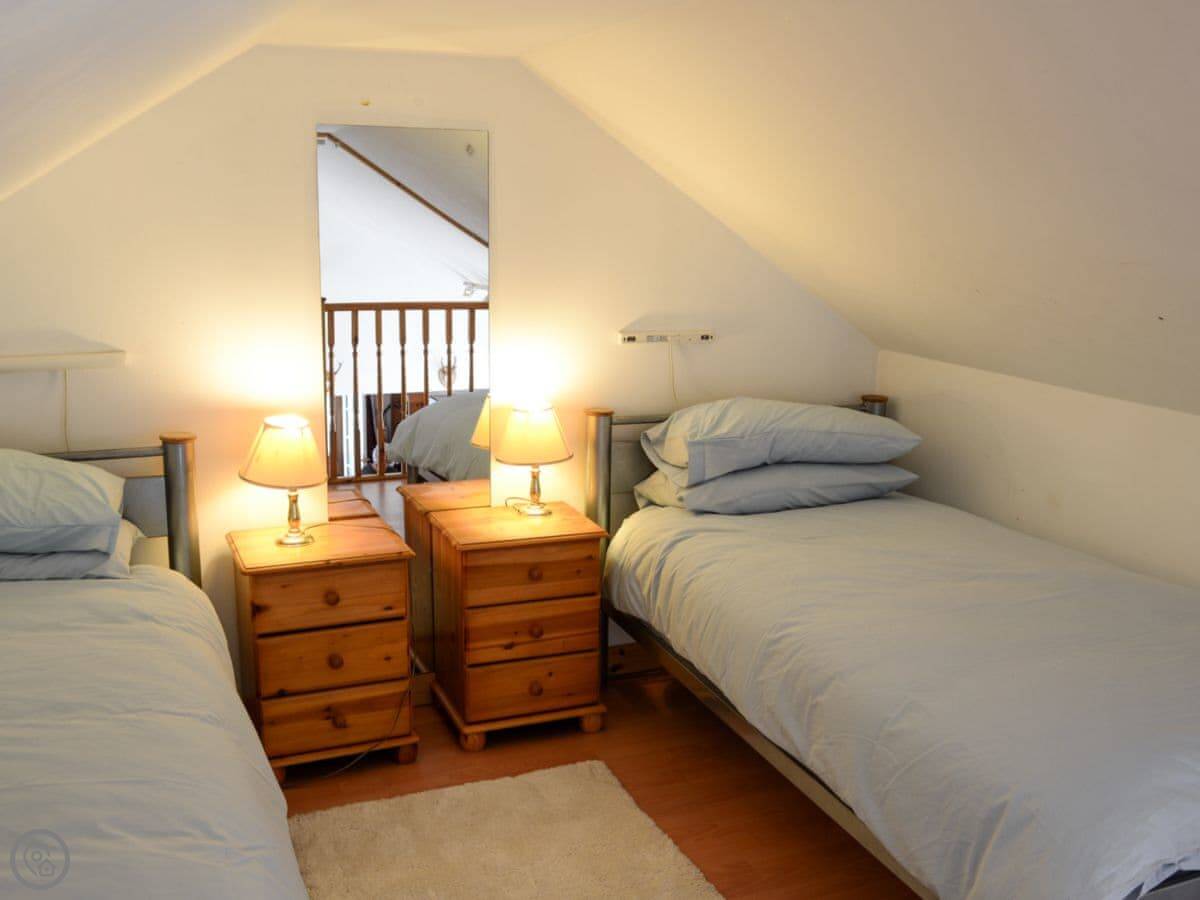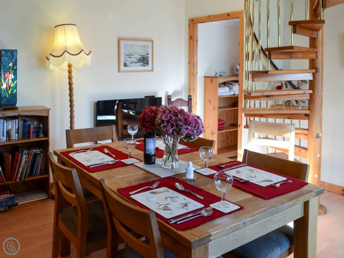 Accessed through its own pretty courtyard, steps lead up to the main open plan living space with a large three piece suite set around the welcoming wood burner. At the far end is a family-sized dining table. The kitchen area is very well-equipped with an American-style fridge/freezer, dishwasher, gas hob and electric oven. There is a utility room with a washing machine and tumble dryer situated in the owner’s house next door, available for visitor’s use. The main double bedroom is located on the ground floor along with a shower room. Steep, open-tread spiral stairs lead up to a mezzanine landing with twin beds.