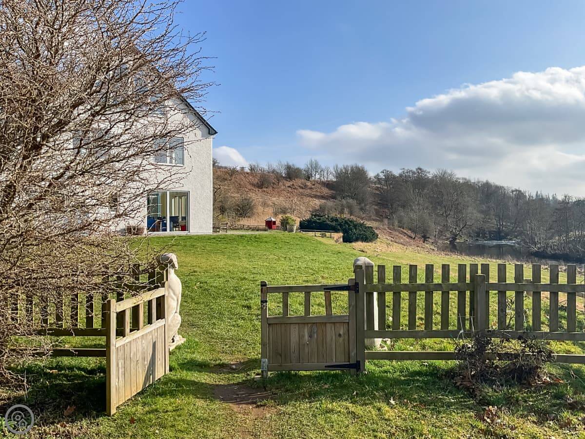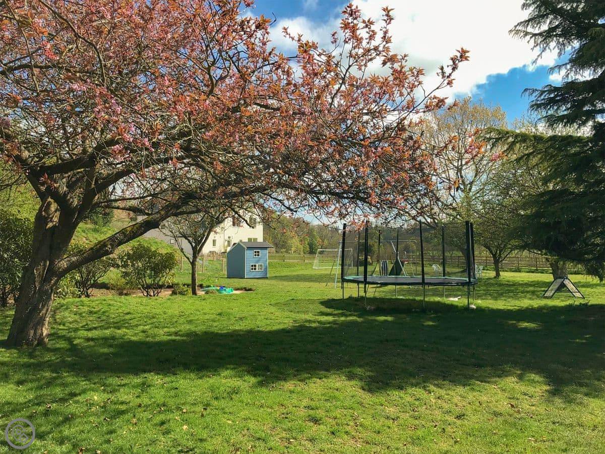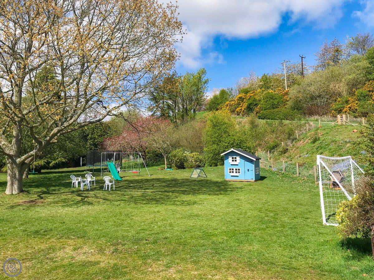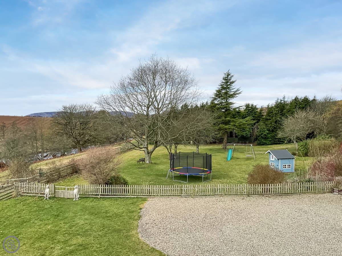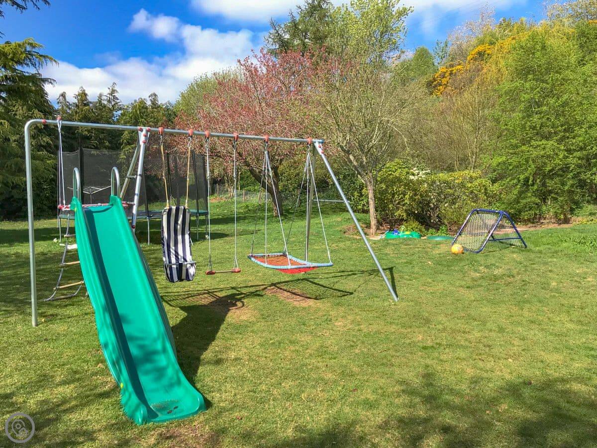 The garden has different areas. At the front, there's a barbecue and a big table with a parasol, looking right over the river. There's a raised area at the back for the view. For kids, there's a large enclosed play area with swings, a slide, a trampoline, and a sandpit. For older children and adults, there's a football net, badminton, boules, a golf chipping net, and other things like slacklines. It's quite a dark spot, so star gazing is good on a clear night.