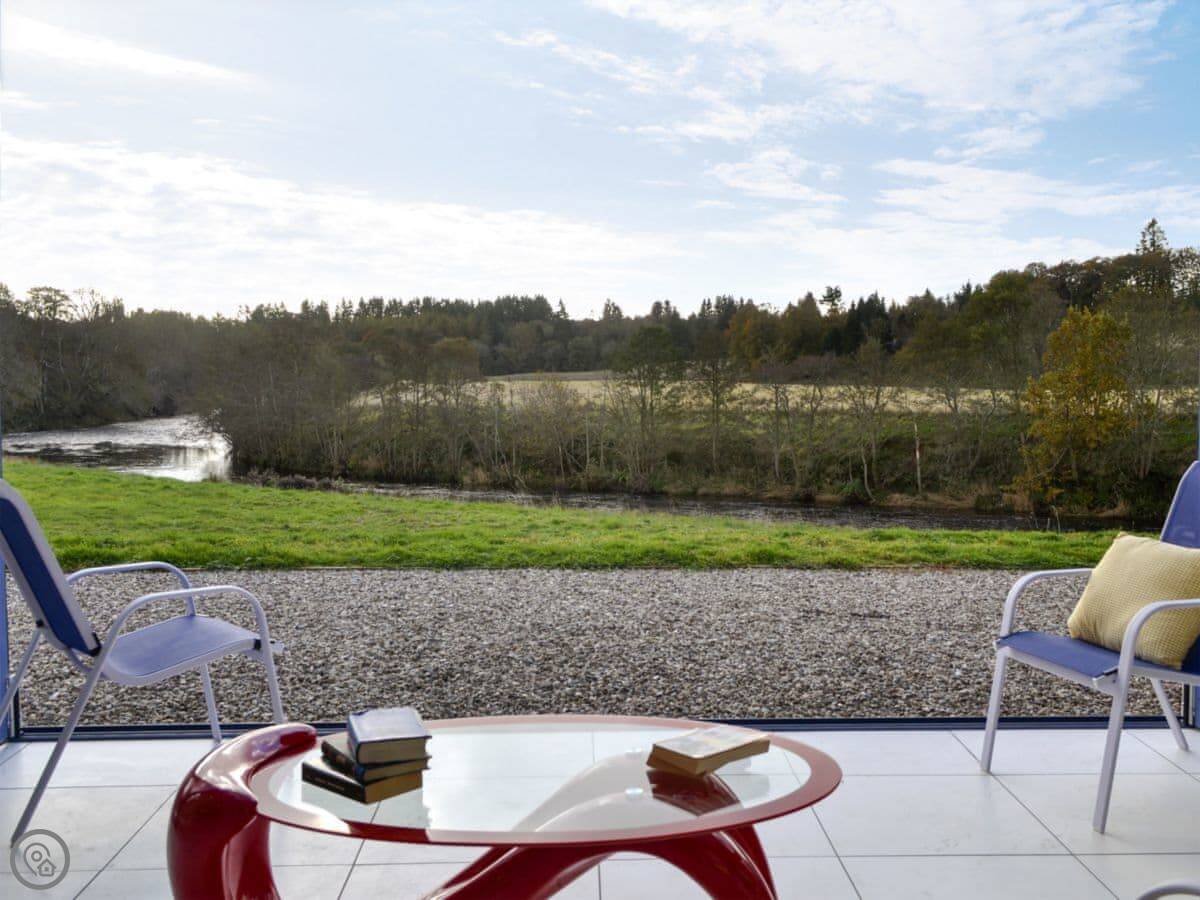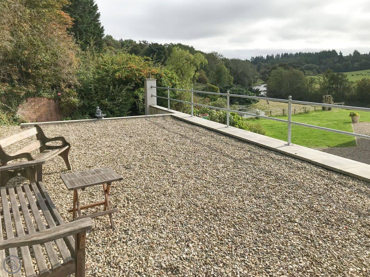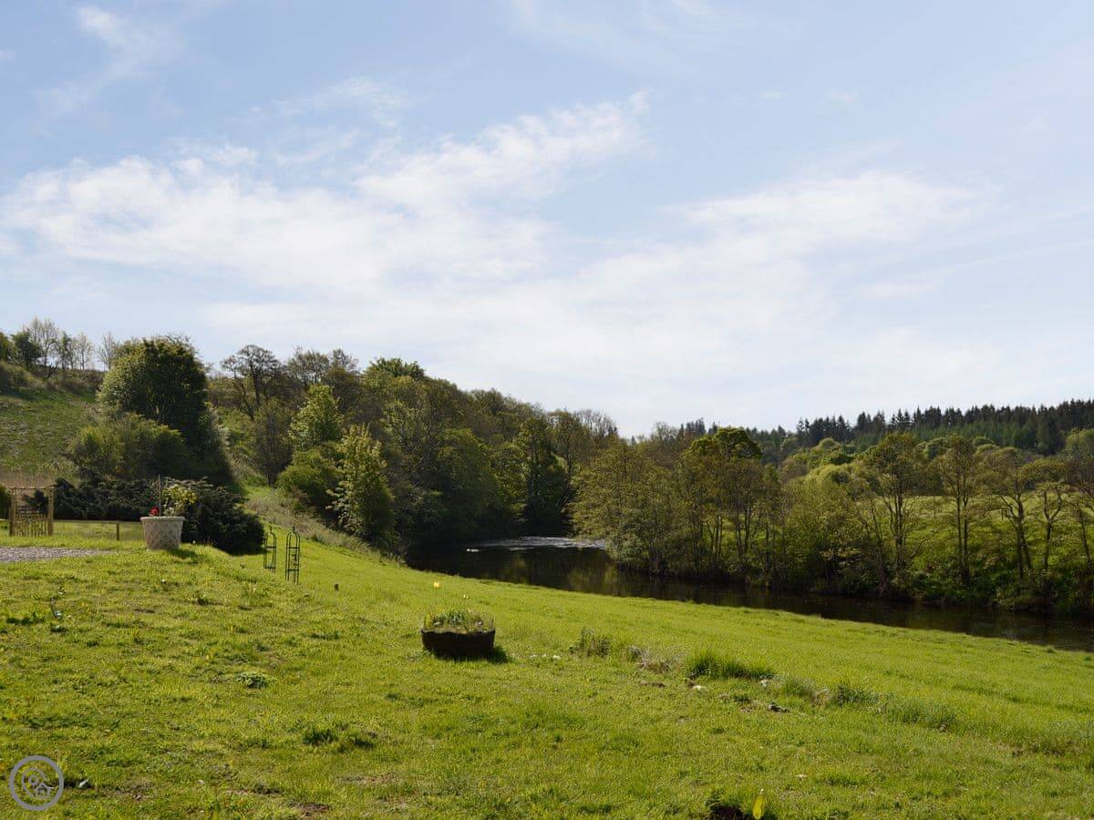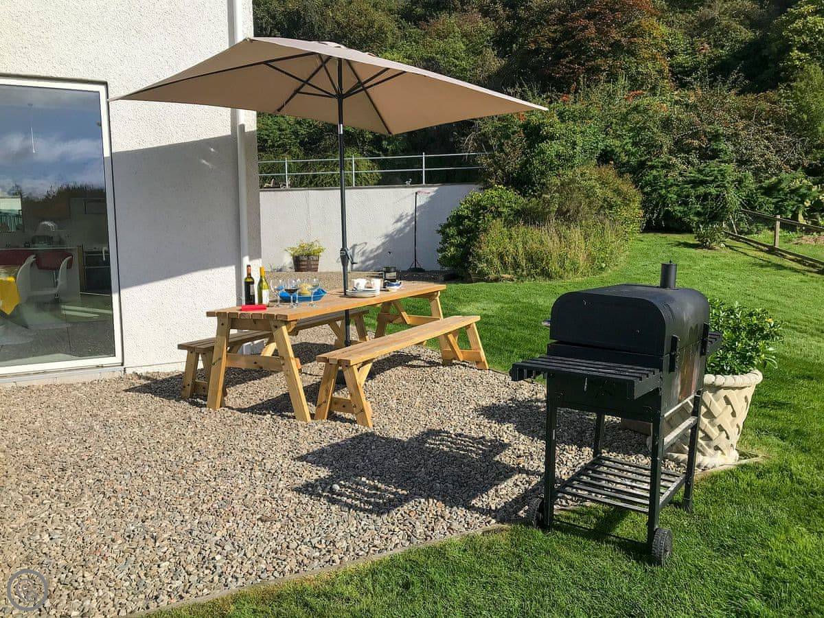 The garden has different areas. At the front, there's a barbecue and a big table with a parasol, looking right over the river. There's a raised area at the back for the view. For kids, there's a large enclosed play area with swings, a slide, a trampoline, and a sandpit. For older children and adults, there's a football net, badminton, boules, a golf chipping net, and other things like slacklines. It's quite a dark spot, so star gazing is good on a clear night.