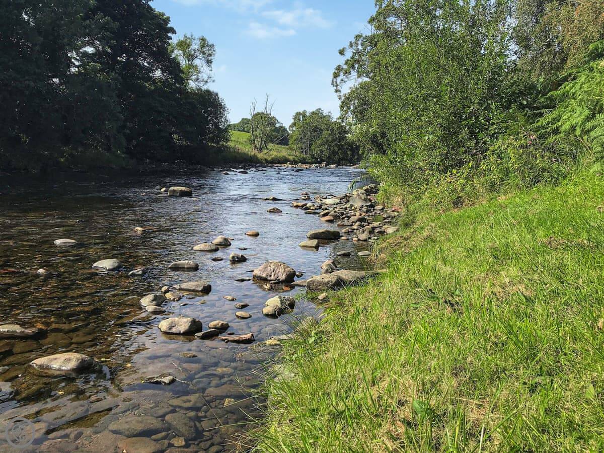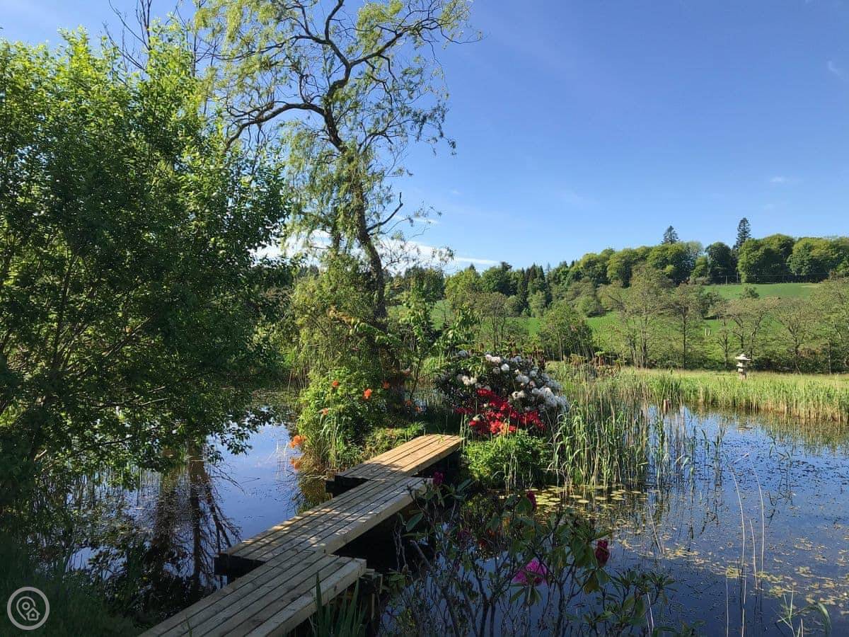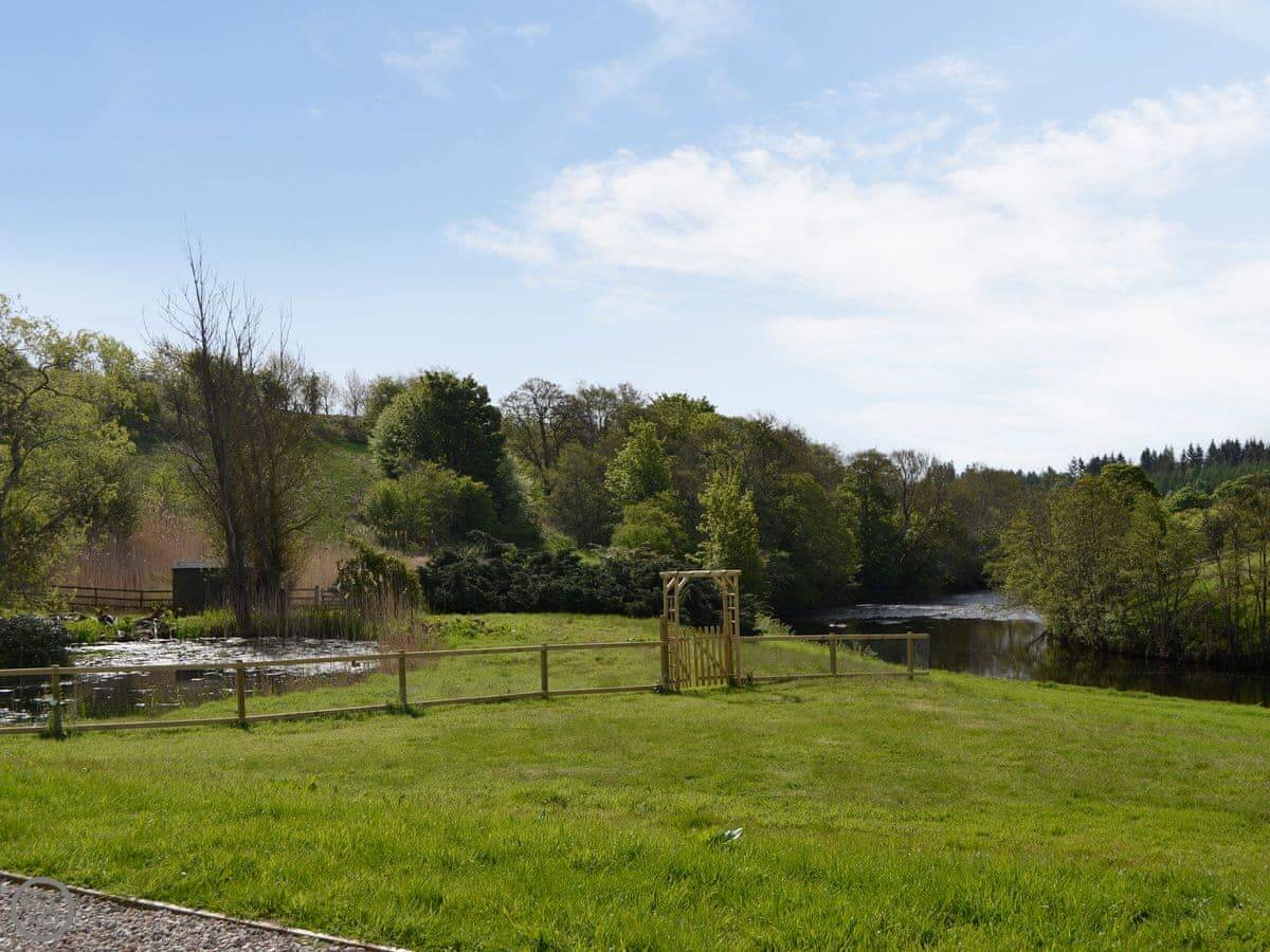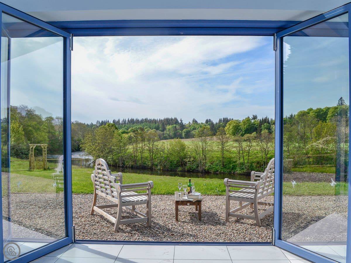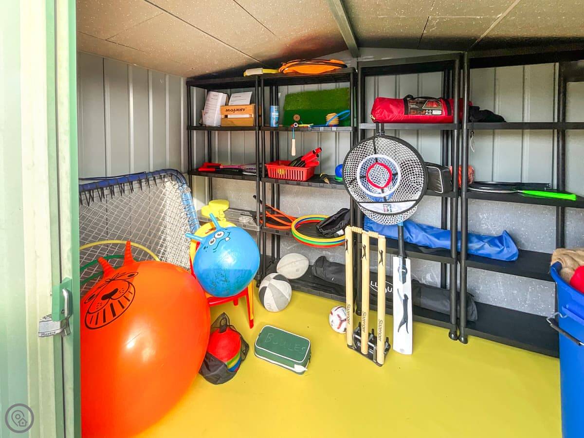 The garden has different areas. At the front, there's a barbecue and a big table with a parasol, looking right over the river. There's a raised area at the back for the view. For kids, there's a large enclosed play area with swings, a slide, a trampoline, and a sandpit. For older children and adults, there's a football net, badminton, boules, a golf chipping net, and other things like slacklines. It's quite a dark spot, so star gazing is good on a clear night.