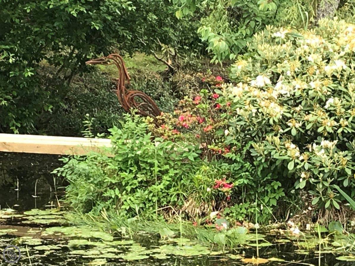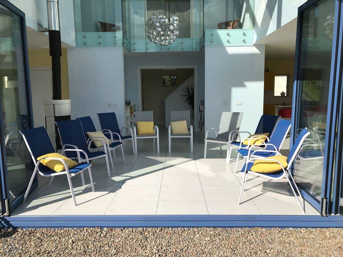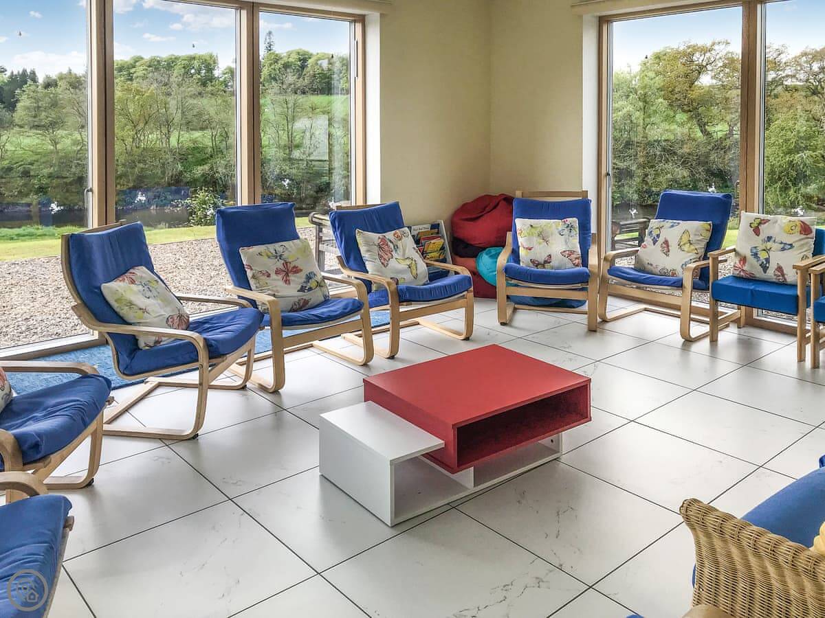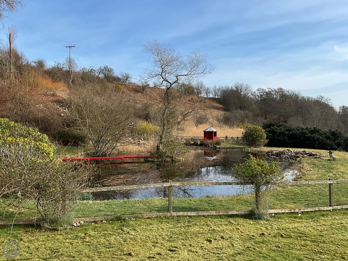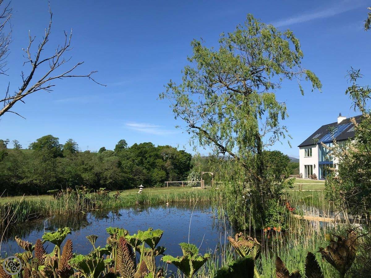 The garden has different areas. At the front, there's a barbecue and a big table with a parasol, looking right over the river. There's a raised area at the back for the view. For kids, there's a large enclosed play area with swings, a slide, a trampoline, and a sandpit. For older children and adults, there's a football net, badminton, boules, a golf chipping net, and other things like slacklines. It's quite a dark spot, so star gazing is good on a clear night.