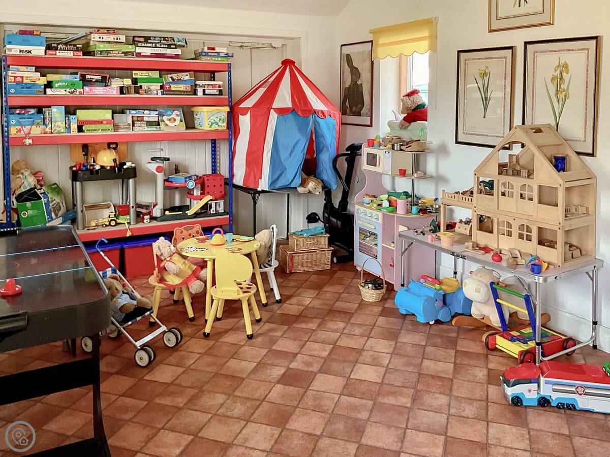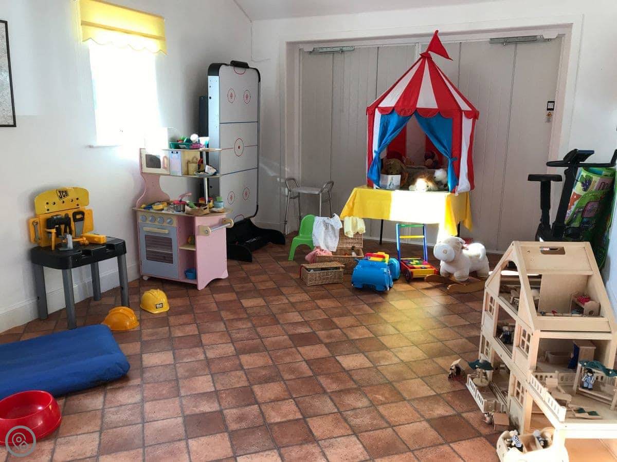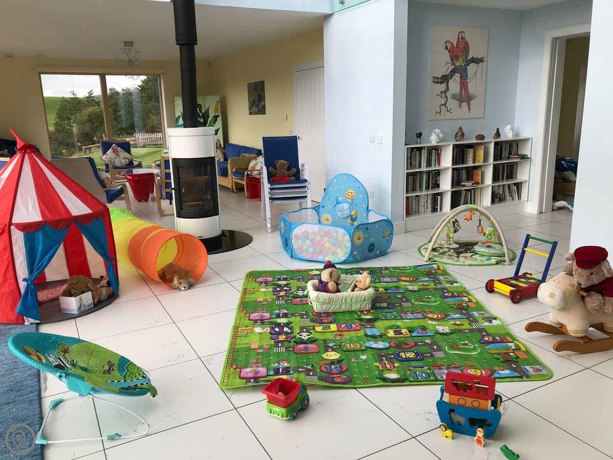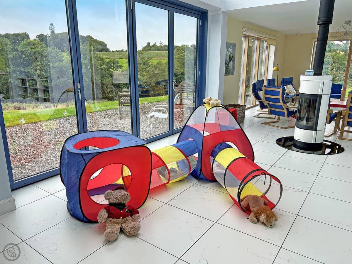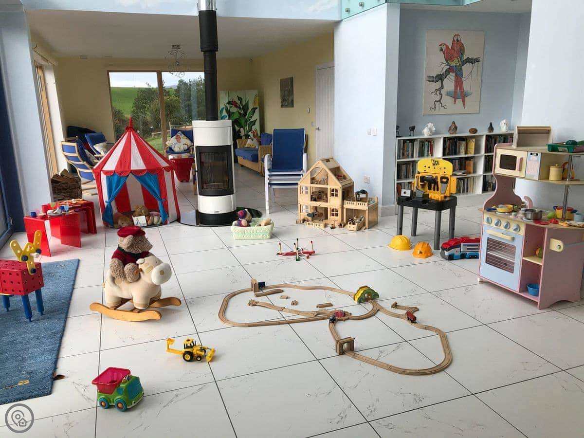 The layout is spread over three floors. Downstairs, there's a big open living area with a kitchen, dining table, and a sitting space with a TV. A double-sided wood burner divides the room. There's also a utility room with a washing machine, a shower room, and a playroom full of toys and an air hockey table.