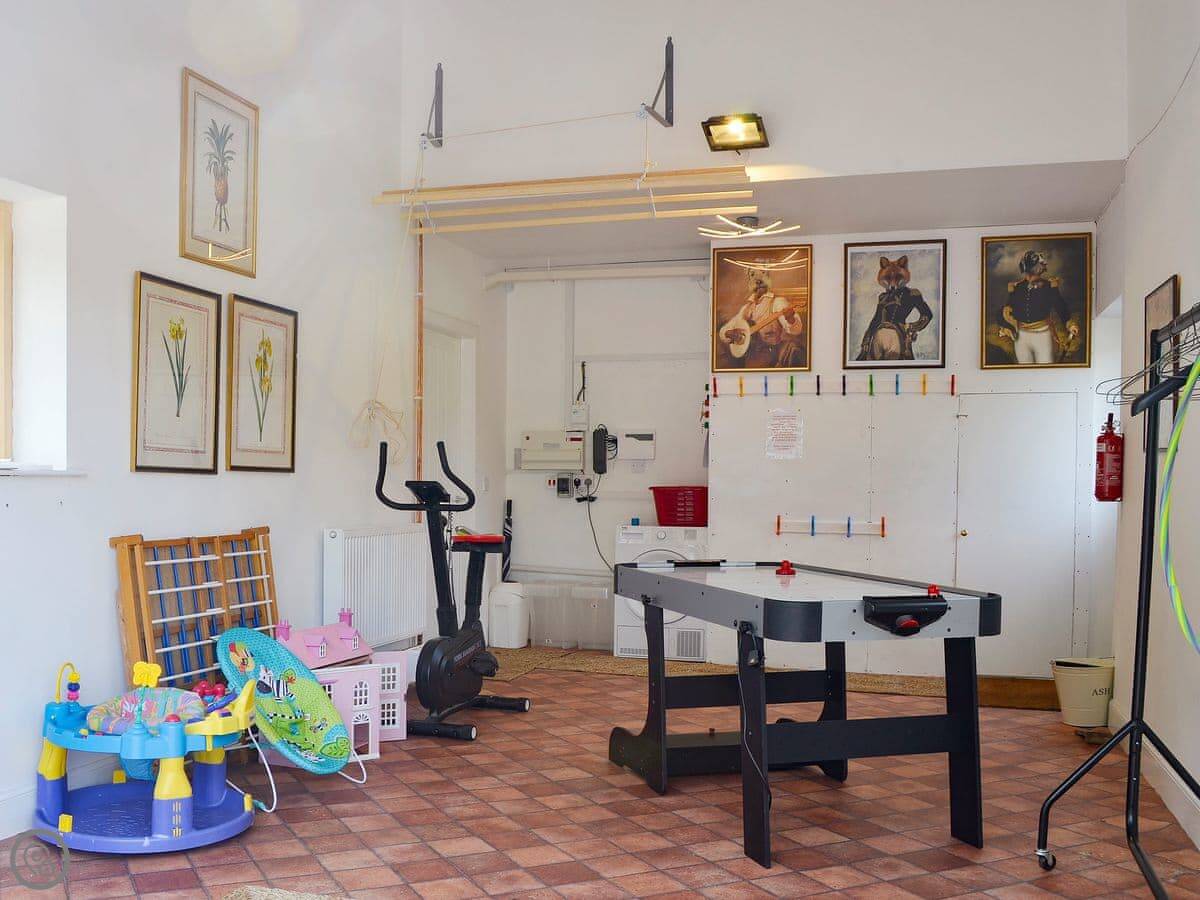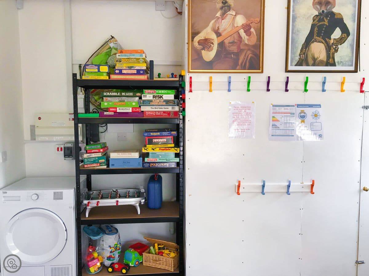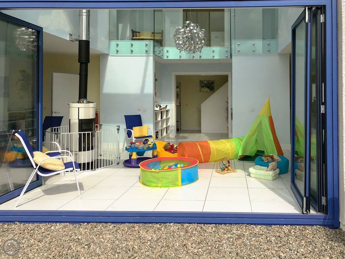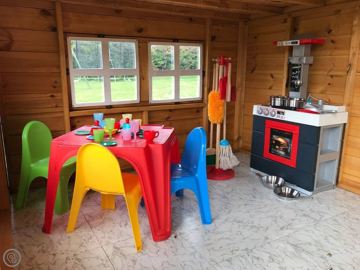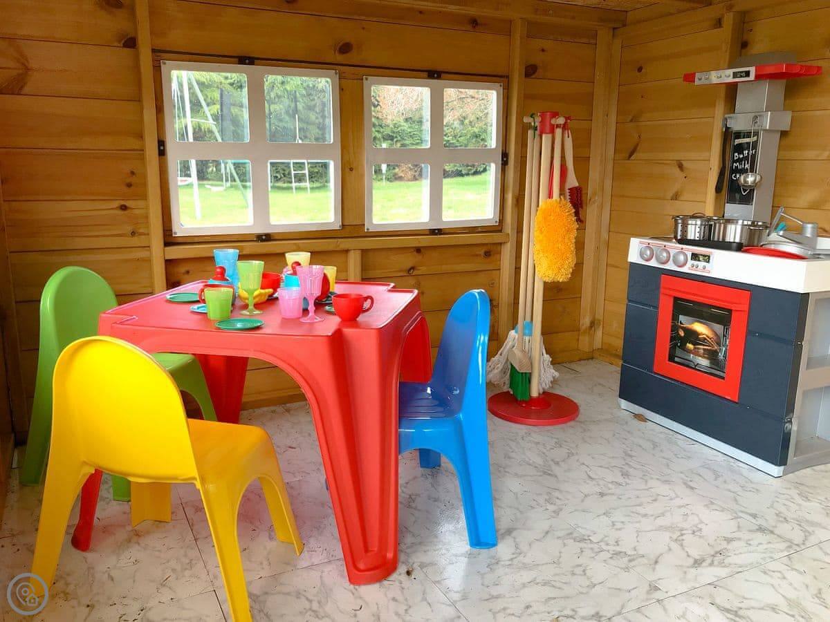 The layout is spread over three floors. Downstairs, there's a big open living area with a kitchen, dining table, and a sitting space with a TV. A double-sided wood burner divides the room. There's also a utility room with a washing machine, a shower room, and a playroom full of toys and an air hockey table.