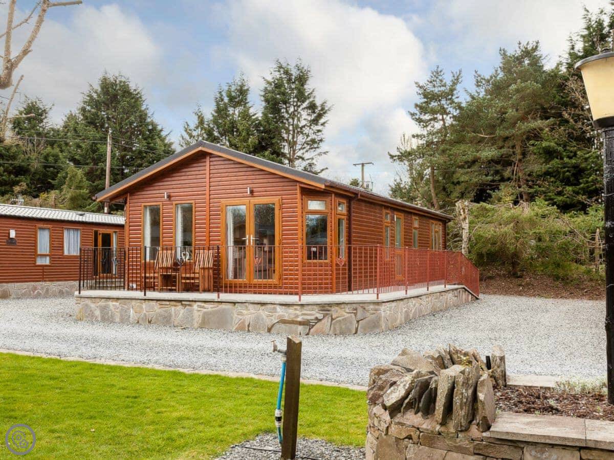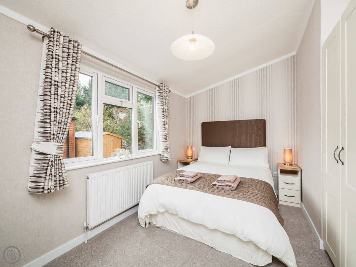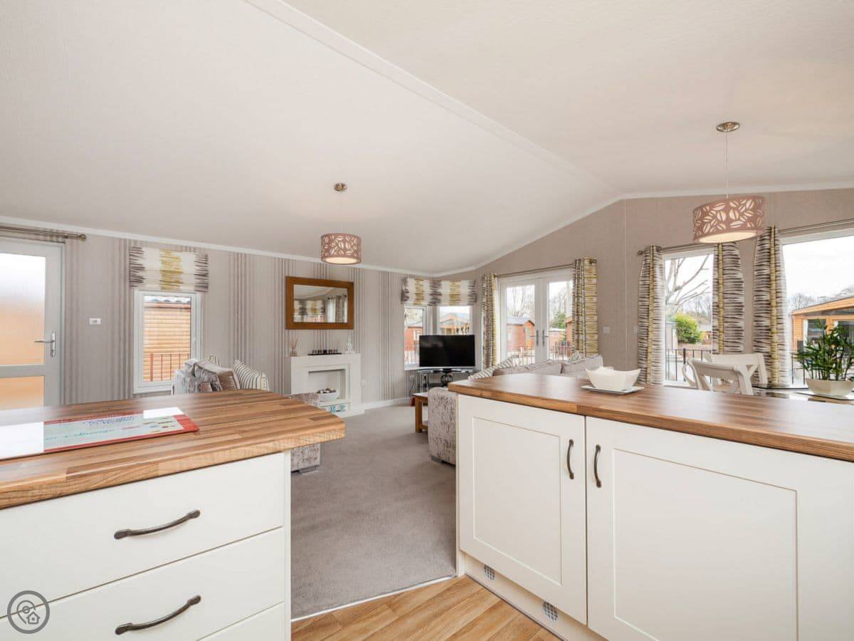 It sleeps four. Two bedrooms, both with their own shower rooms. One double, one twin. The main living space has big windows and patio doors out to a decked area. It gets a lot of light. The garden is enclosed.
